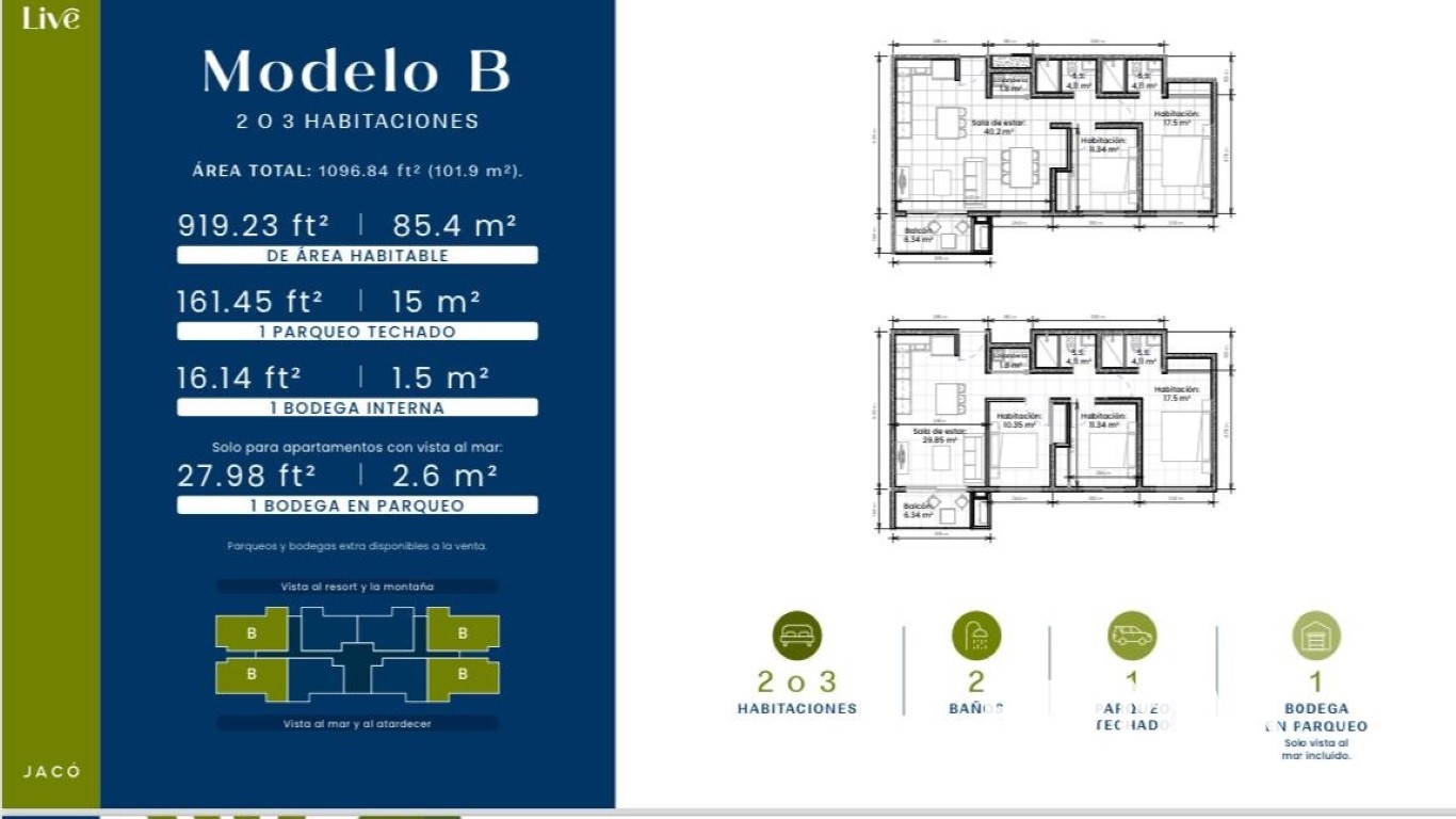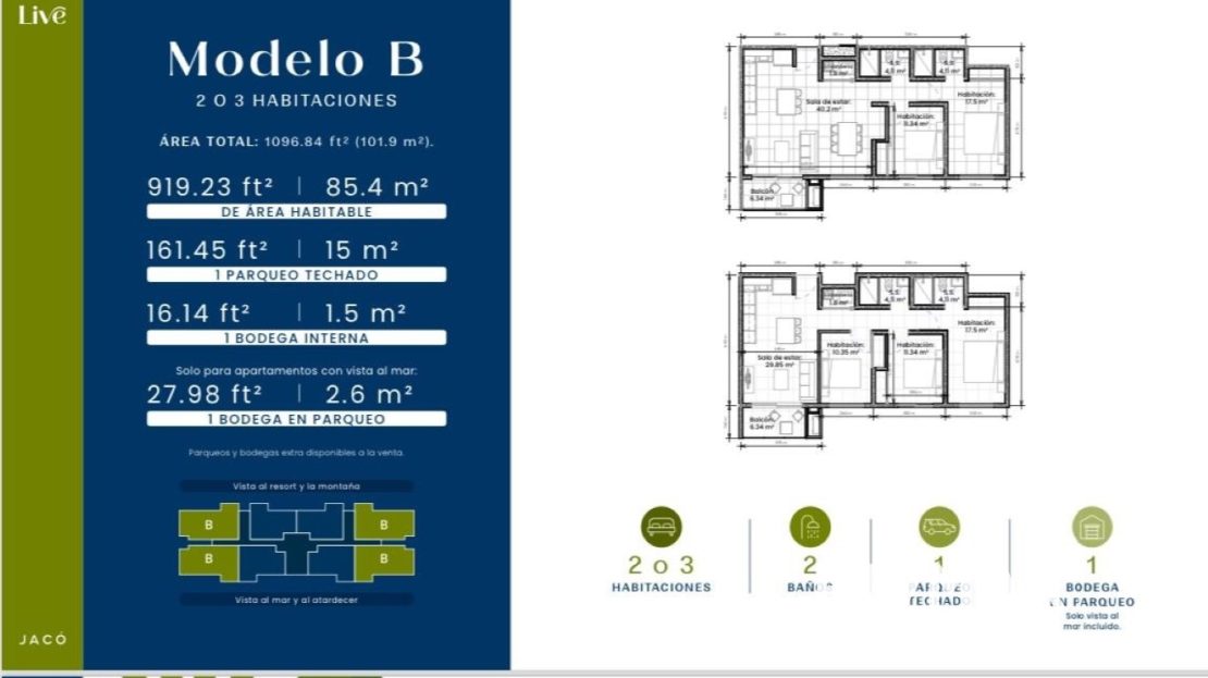 Este impresionante condominio de 2 habitaciones y 2 baños está ubicado en la esquina sur del 14° piso del exclusivo complejo LIVE Jaco. Su ubicación privilegiada ofrece una amplia vista panorámica del océano y atardeceres inolvidables.