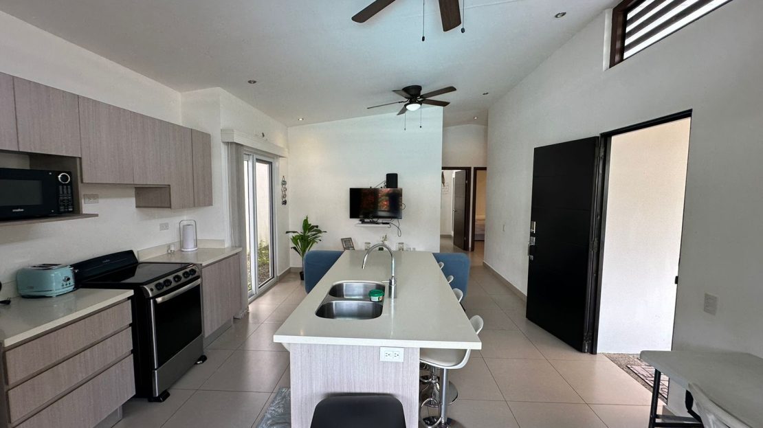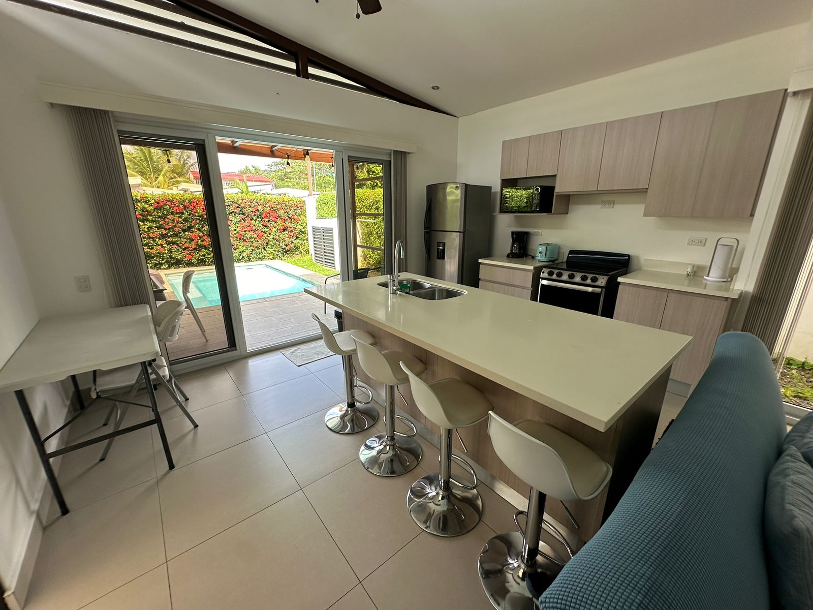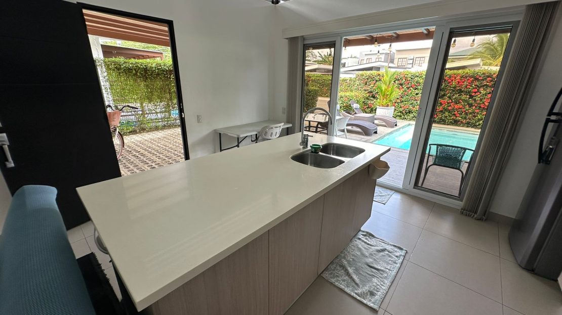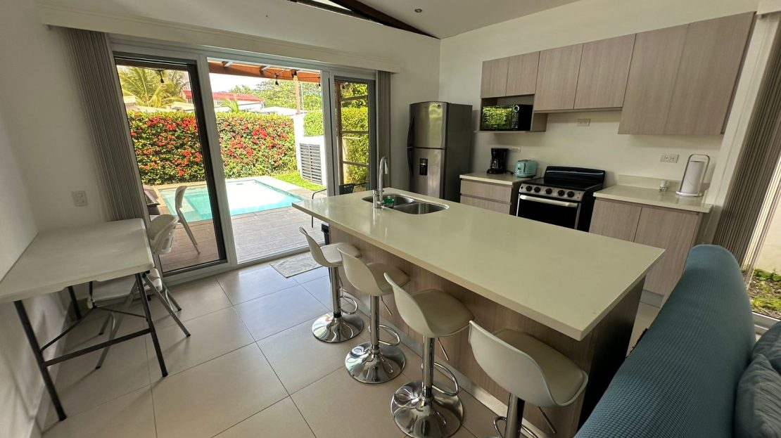 Cocina gourmet: cocina completamente equipada que se abre a un comedor al aire libre con parrilla y piscina privada, perfecta para el entretenimiento.