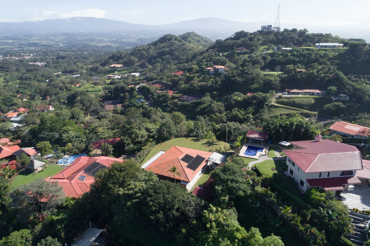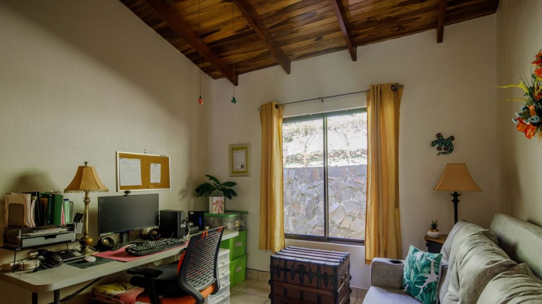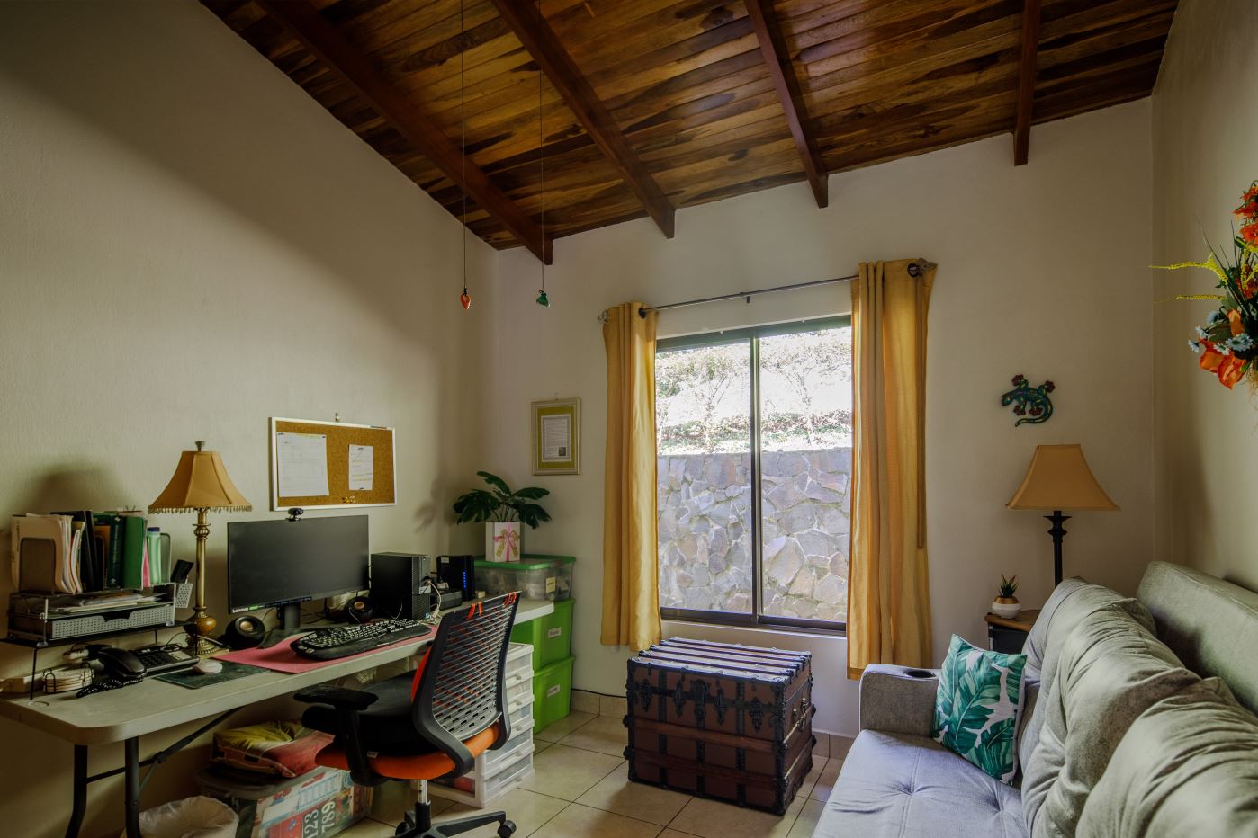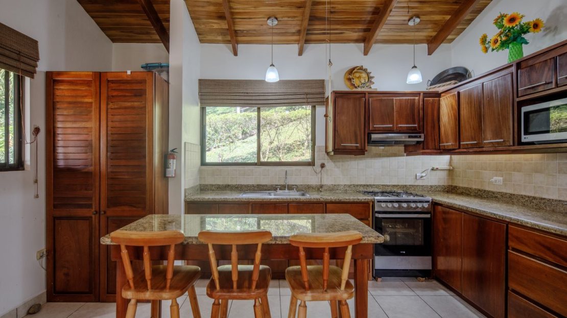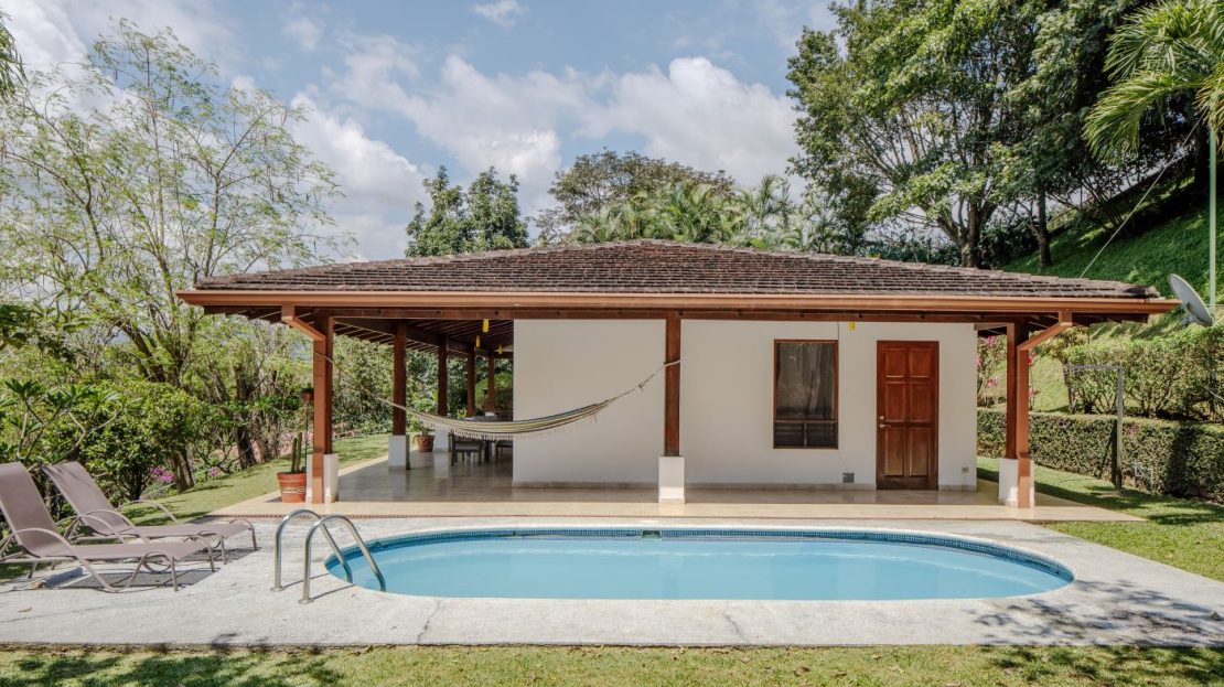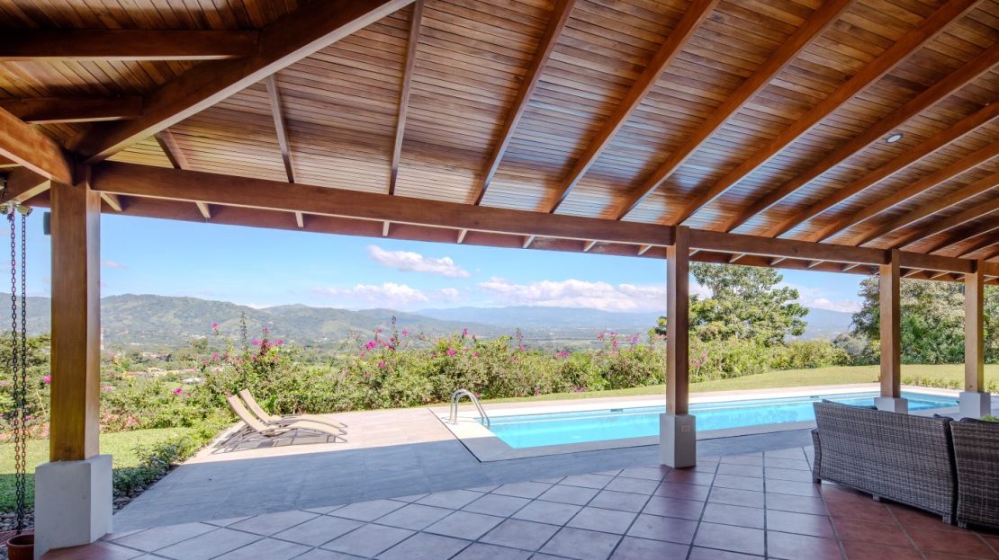 Entering the top main larger home’s lot features an ample lot that leads way to the inviting long lap and watersport’s made pool and wrap around porch ideal for a crowd and for entertaining and enjoying Atenas’ renown best climate. Leaving the wonderous panoramic views of this main home one enters the 300m2 interrior which has a feel of spaciousness with tall ceilings in the main living, dining and kitchen with plenty of light throughout. There is fine artesenal woodwork throughout the home including the slatted ceilings, in the very ample kitchen an the home’s door work. The main common living room leads to a nice sized master bedroom and bathrooms suite and to the other two bedrooms and two baths. Outside there’s a half bathroom for the pool use and an outside laundry area. Behing the home is an independent tool shed. This home has dedicated solar heating for the pool. The home is designed to be able to support and added second level construction. This top is sold non-furnished.