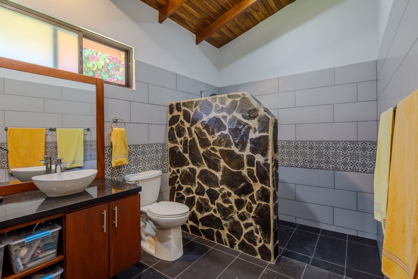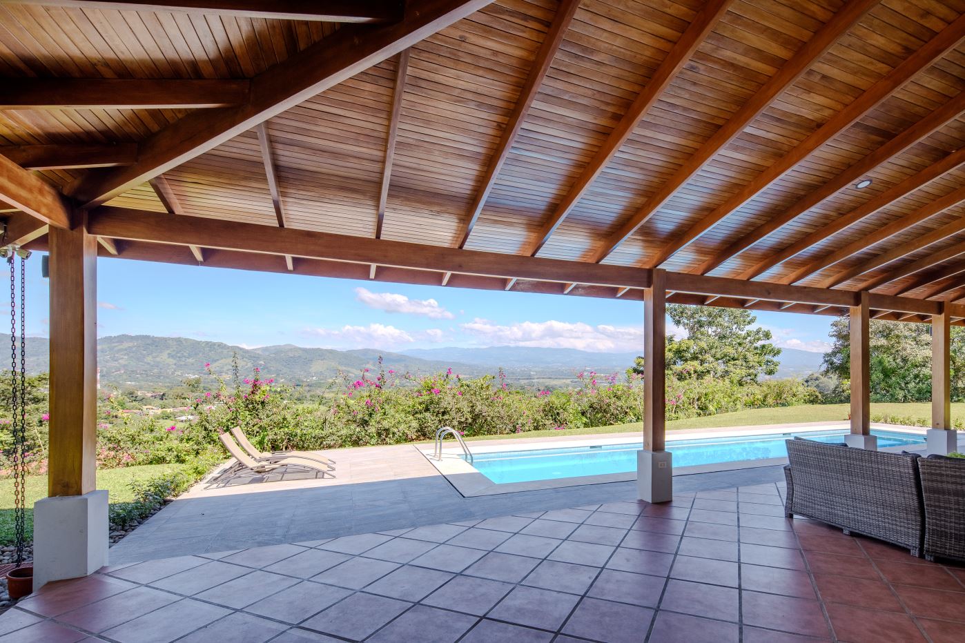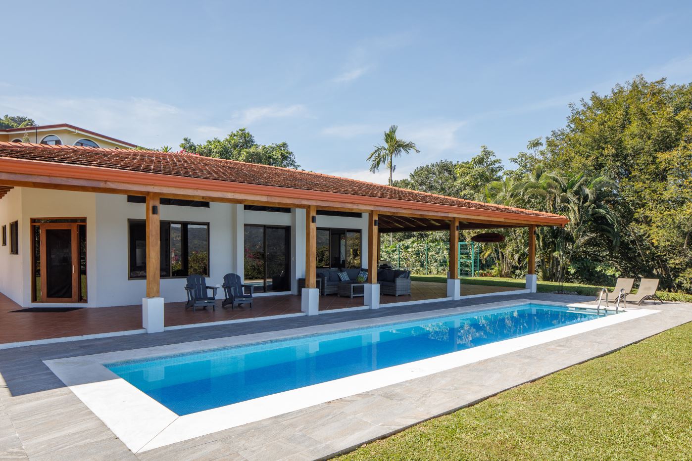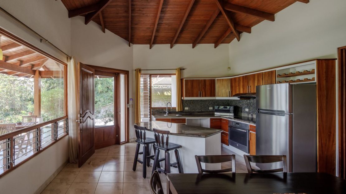 Entering the top main larger home’s lot features an ample lot that leads way to the inviting long lap and watersport’s made pool and wrap around porch ideal for a crowd and for entertaining and enjoying Atenas’ renown best climate. Leaving the wonderous panoramic views of this main home one enters the 300m2 interrior which has a feel of spaciousness with tall ceilings in the main living, dining and kitchen with plenty of light throughout. There is fine artesenal woodwork throughout the home including the slatted ceilings, in the very ample kitchen an the home’s door work. The main common living room leads to a nice sized master bedroom and bathrooms suite and to the other two bedrooms and two baths. Outside there’s a half bathroom for the pool use and an outside laundry area. Behing the home is an independent tool shed. This home has dedicated solar heating for the pool. The home is designed to be able to support and added second level construction. This top is sold non-furnished.
