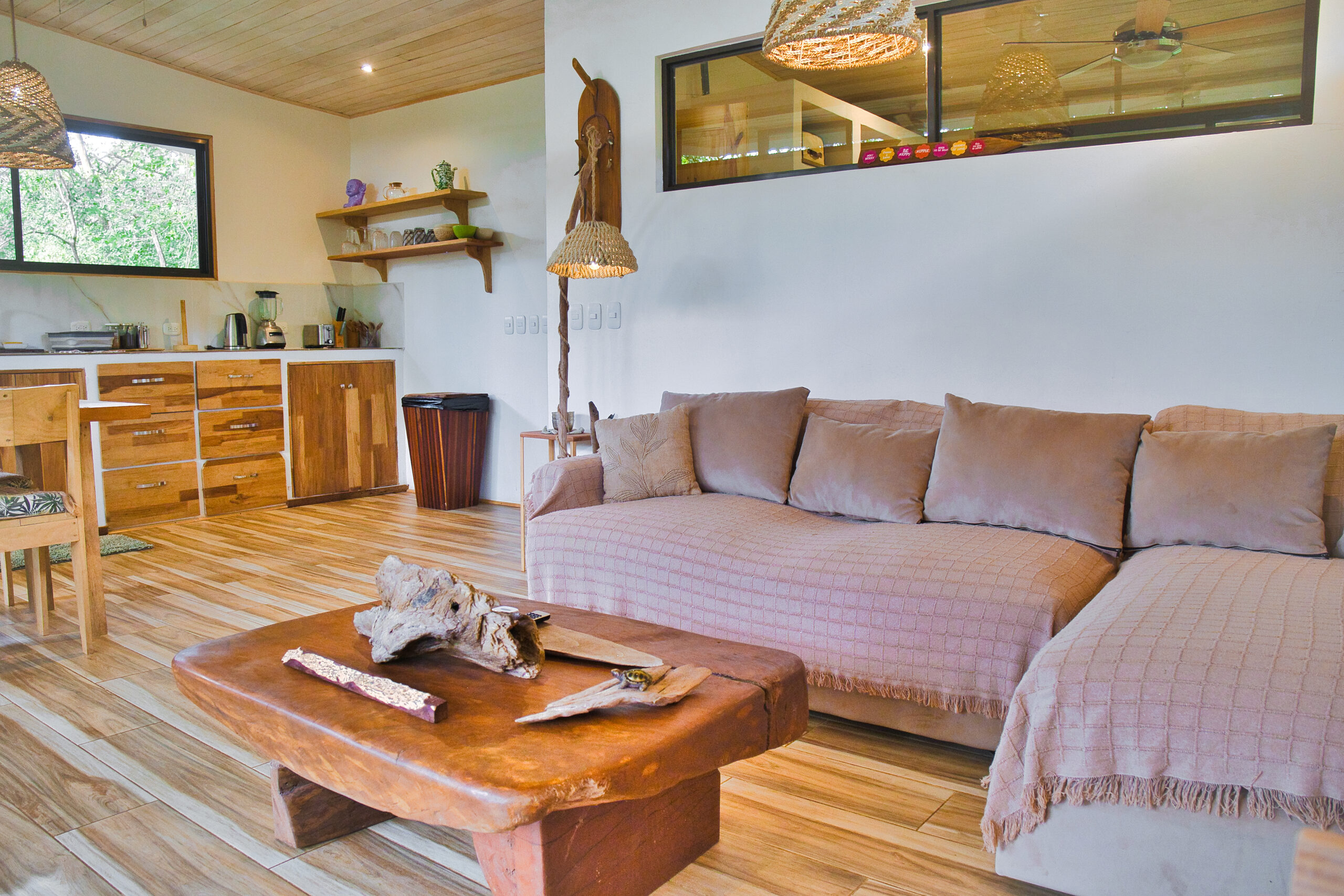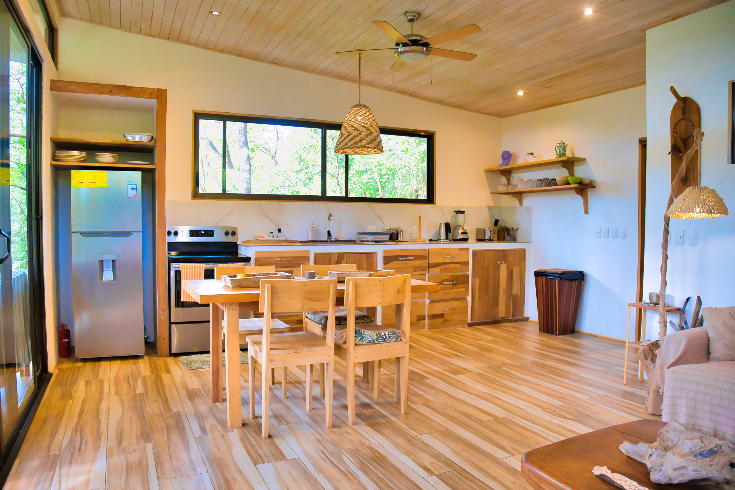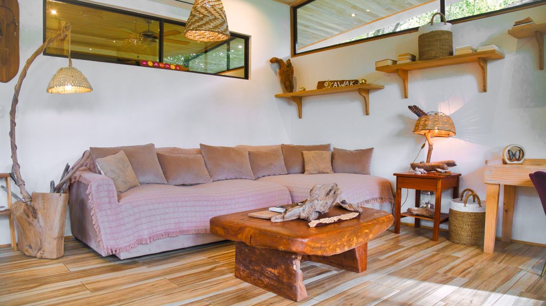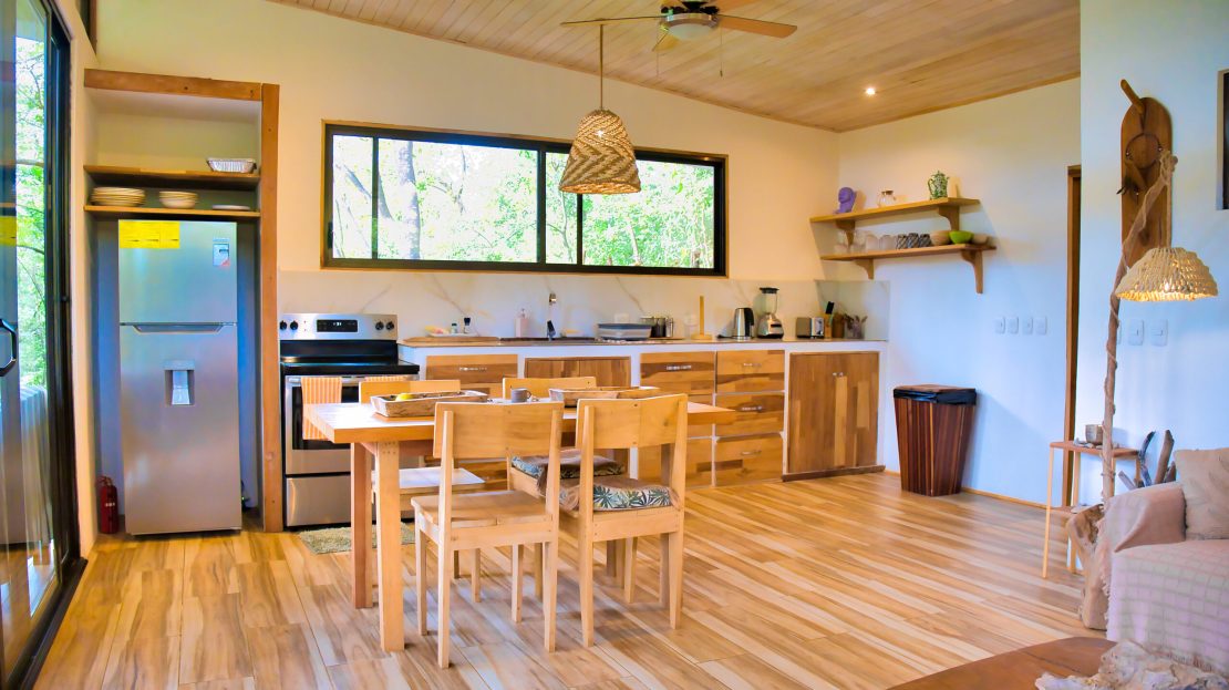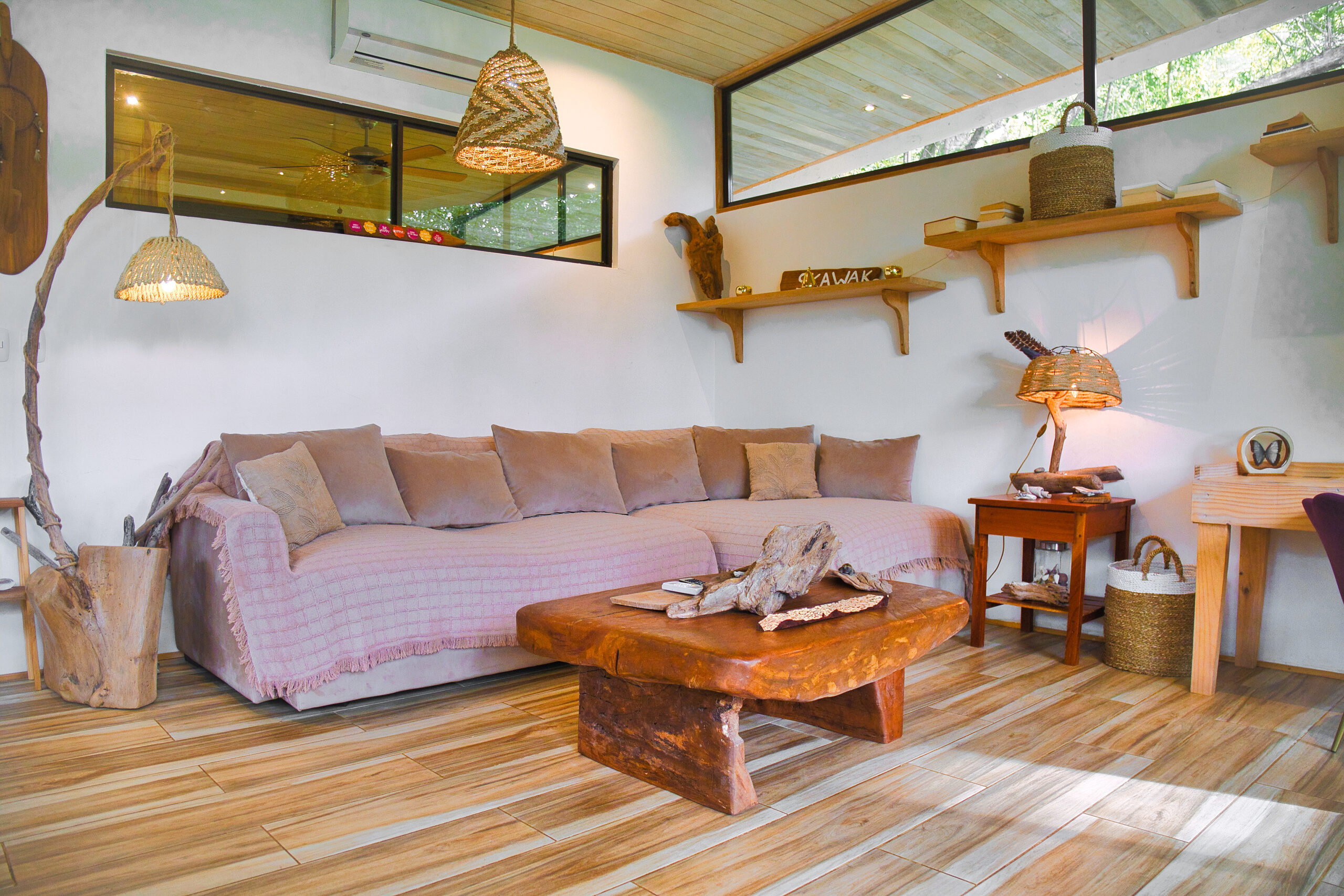 Tucked away within the same lush property is the charming Skawak Jungle House, a beautifully designed 85m² haven that immerses guests in the vibrant wildlife of Nosara. This one-bedroom, one-bathroom home features an open-concept living space with expansive bay windows overlooking the jungle, a bespoke wooden kitchen, and artisanal ceramic floors. Loved by guests for its stunning décor and peaceful location, Skawak offers a unique and intimate connection with nature.