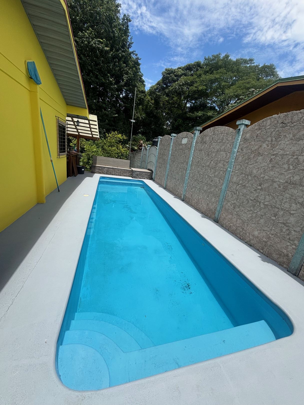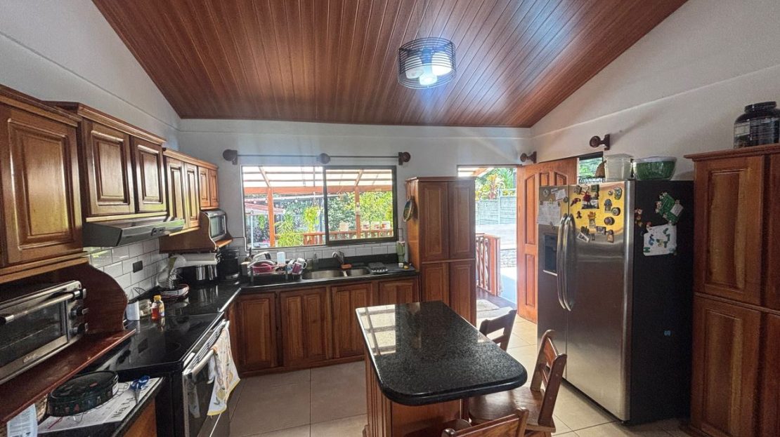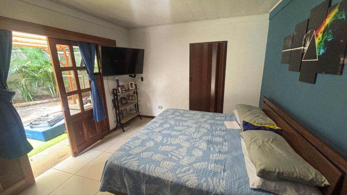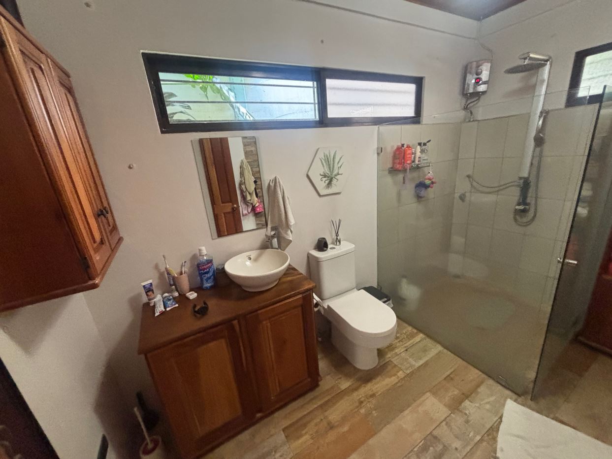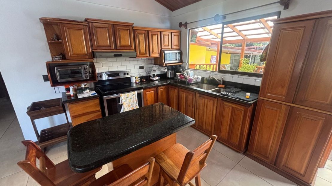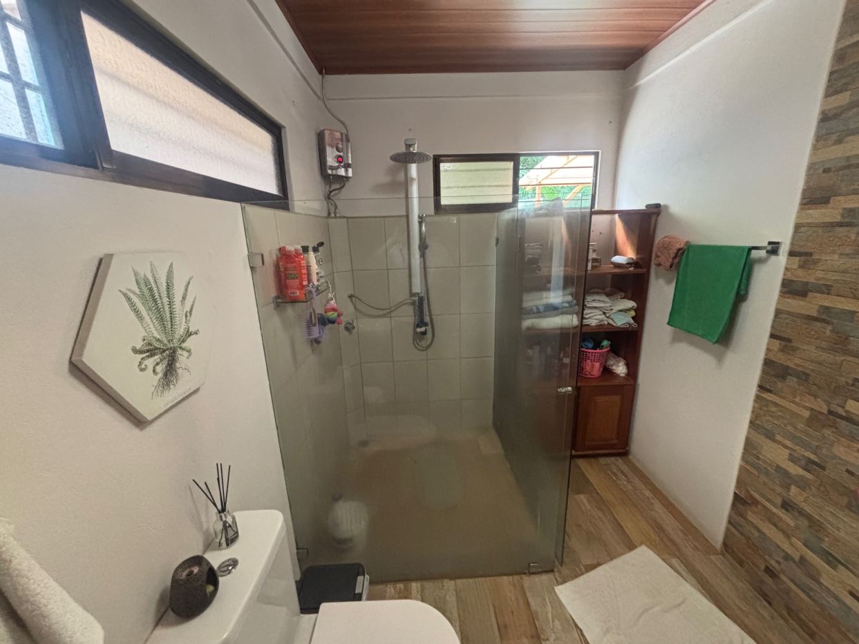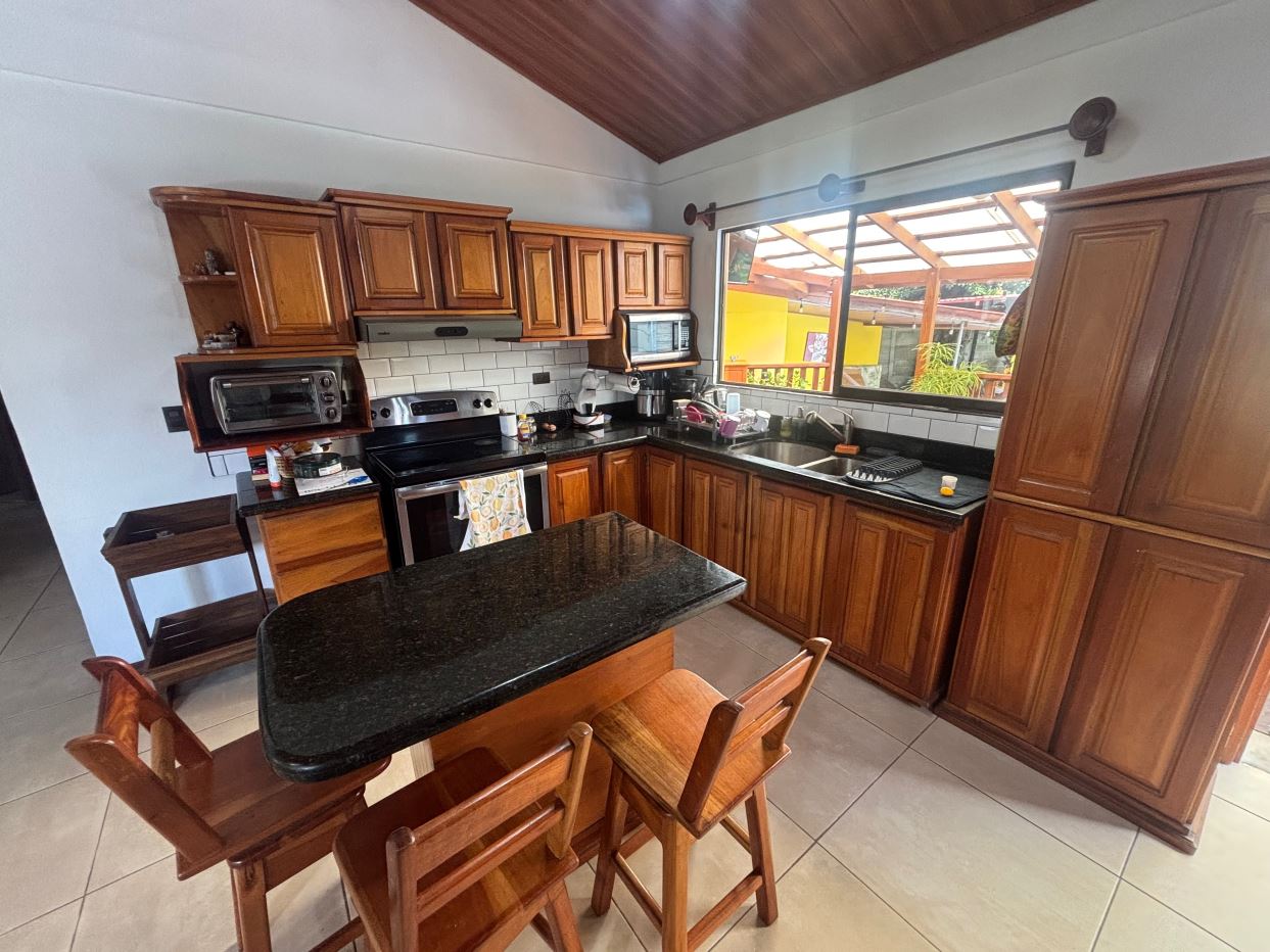 A cozy Atenas home with pool and rancho conveniently located close to everything. This nicely designed and finished ranch style home is located just 1 minute from the east-west 27 highway and 3 minutes from Atenas Center but lies on a quiet residencial street within a short walk of supermarkets and restaurants. The front of the home is entered by an automatic gate with a private and secure perimeter throughout. The long private entrance leads to a carport and formal entry into the common area living room, kitchen and to the three bedrooms and one bath. The kitchen leads way to a beautiful artesenal covered porch area adjacent to the long inviting pool and deck area. The nicely landscaped backyard has a nice size orchard with plenty of citrus plants and other fruit trees. There is an added annex room ideal for a separate apartment with bathroom or home office. Farther in the back of the home is a covered bbq location. There is an added storage area.
