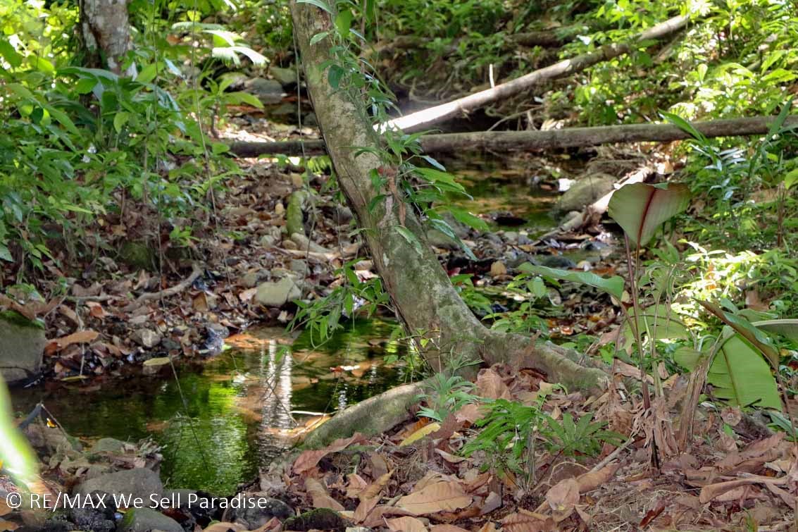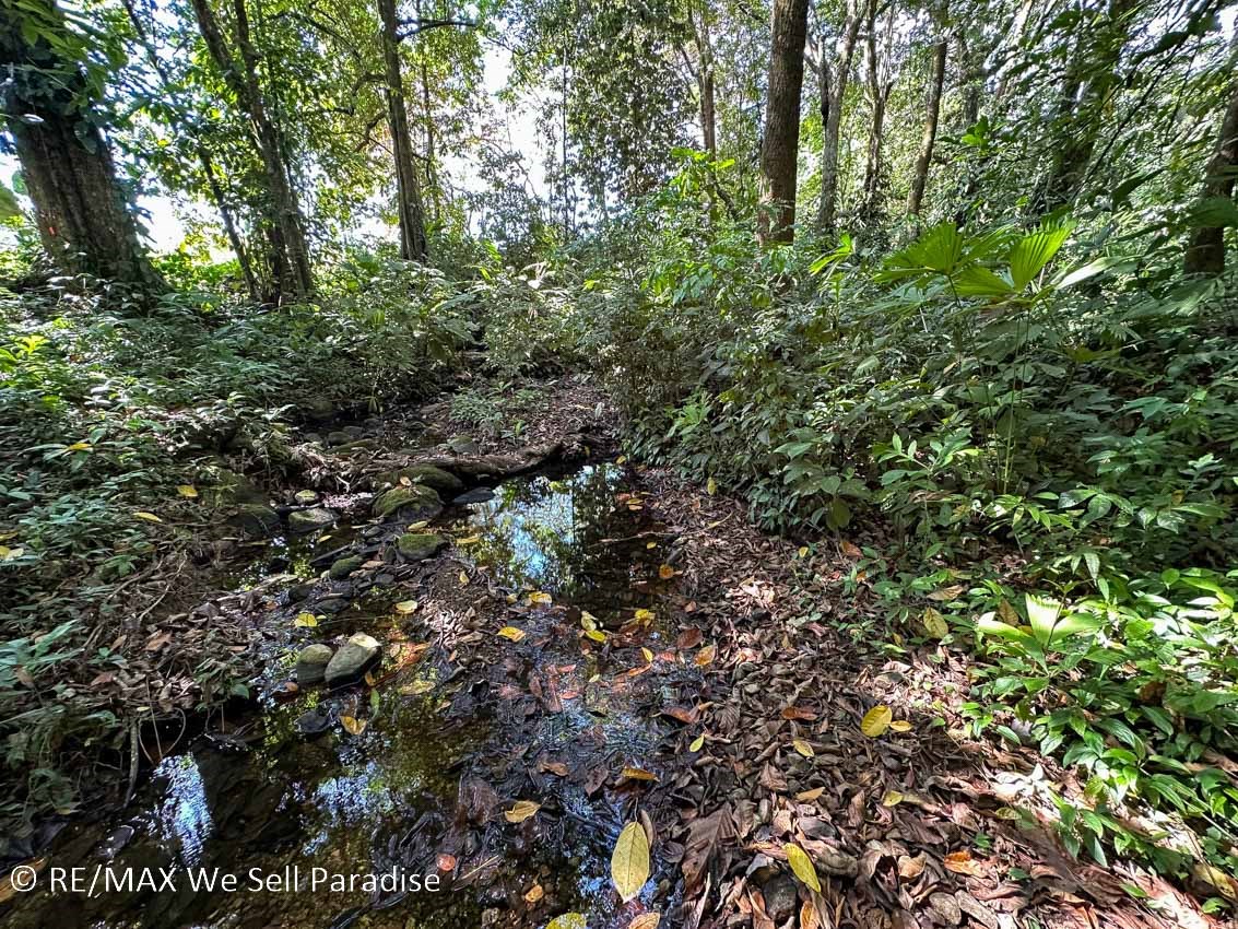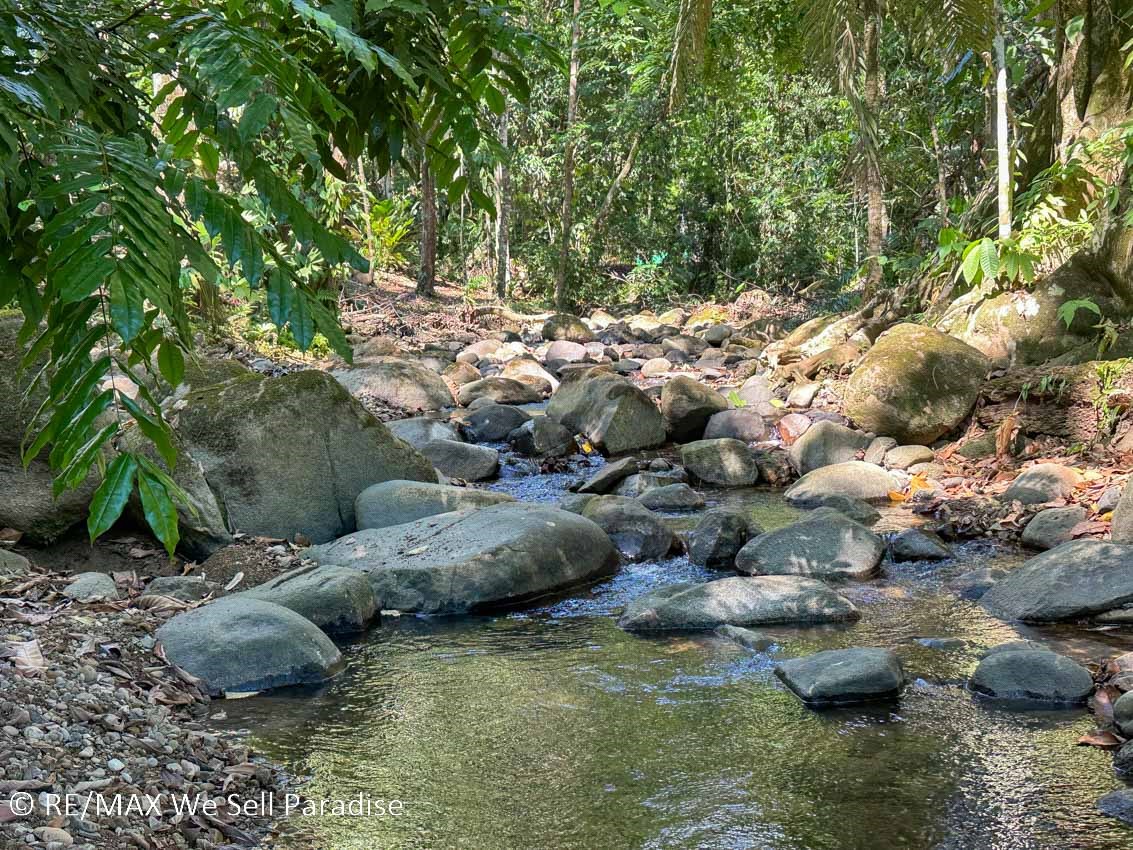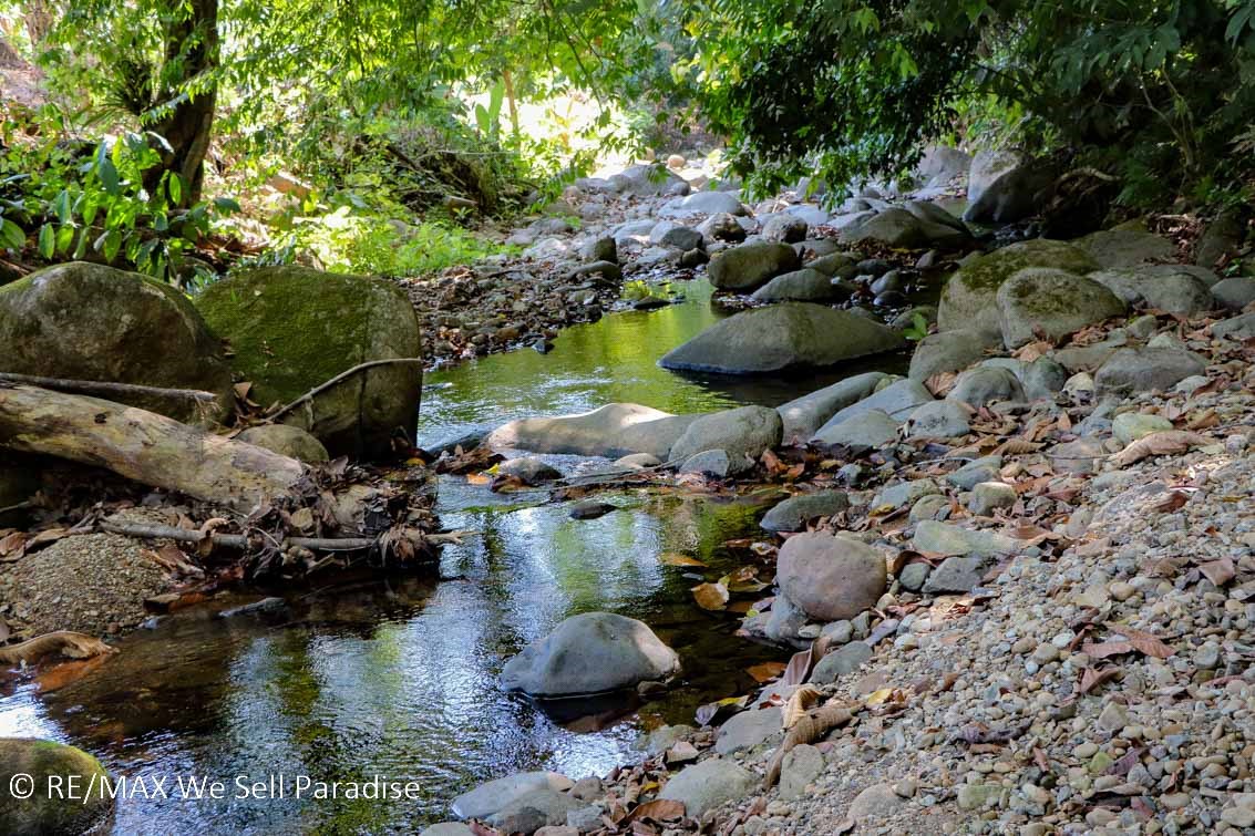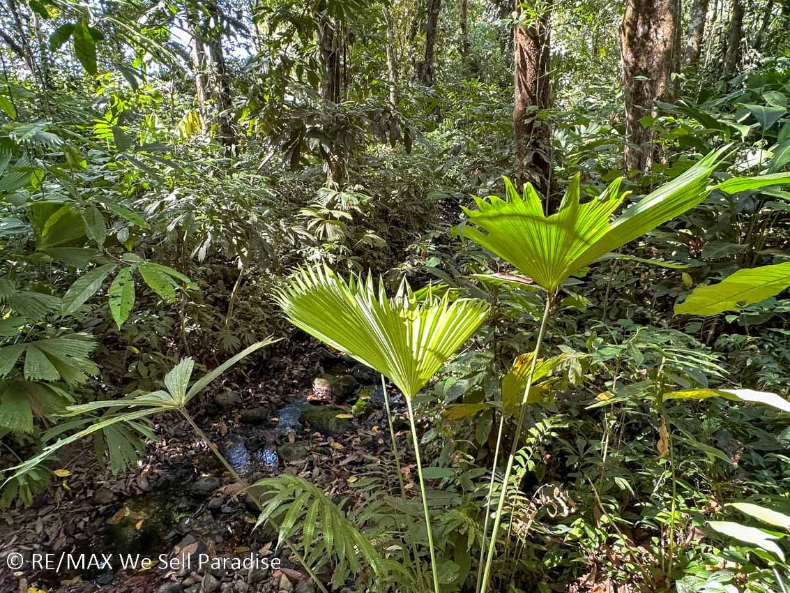 This large 1.3 acre lot – an oasis of greenery, peace and tranquillity – sits right inside the most sought-after real estate location of Costa Ballena: the amazing jungle town of OJOCHAL. On one end the land borders a mountain river flanked by towering rainforest trees. This year-round river is clean, cool and offers many swimming holes which could make for perfect hot afternoon dips – and a few dozen strategically placed rocks would create a deep and cool swim hole big and deep enough for a large group to relax in! Inside the property a smaller year-round creek flanks the large centrally located plantel – a perfect spot for a house, as it would take full advantage of the rainforest surroundings and allow for the sound of the nearby river to accompany the jungle bird and animal ambience.