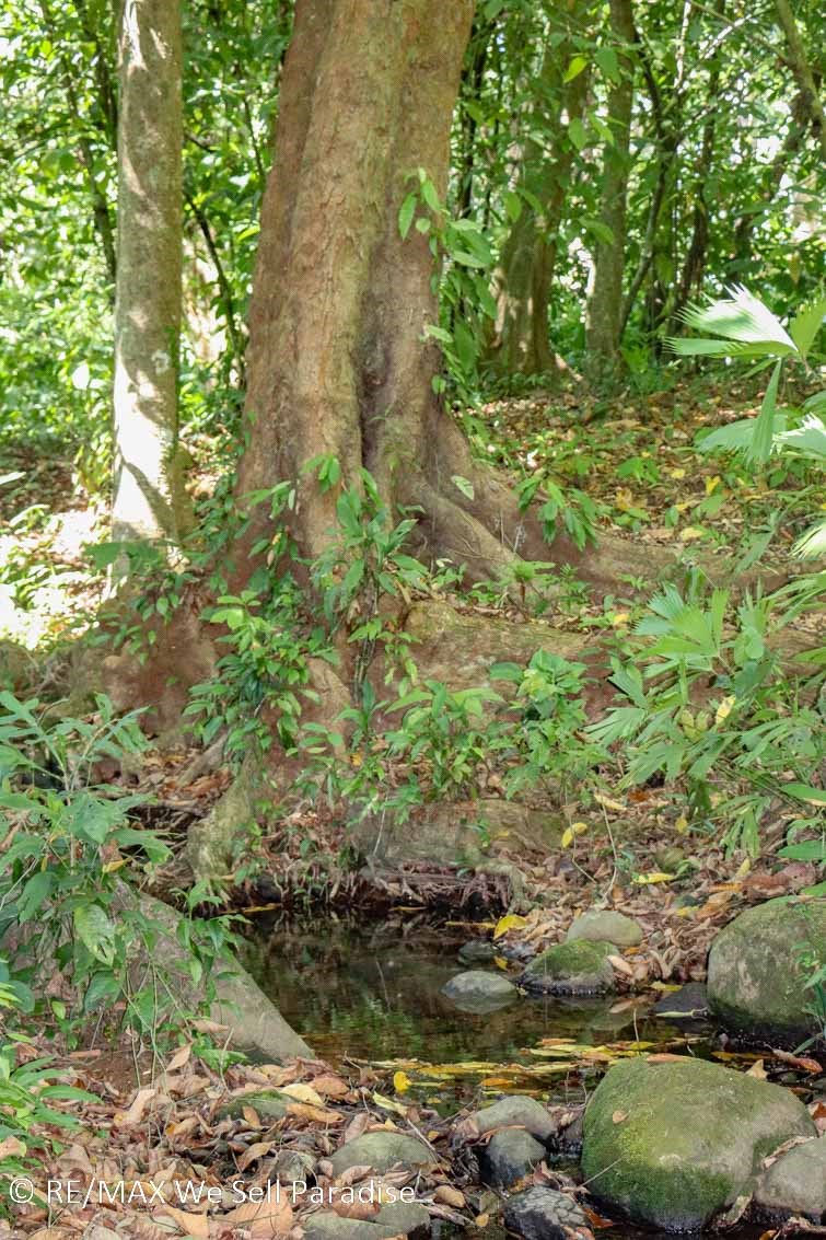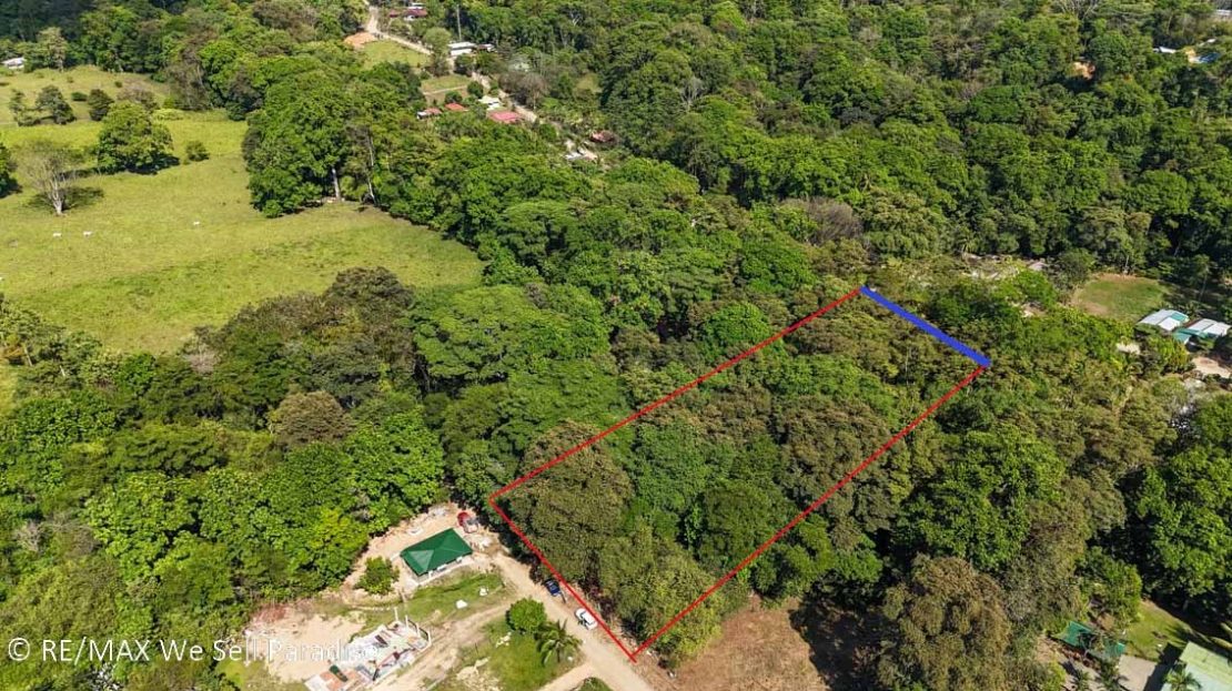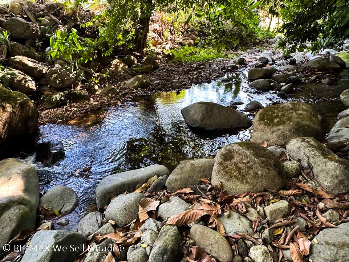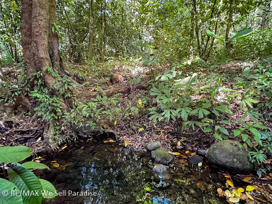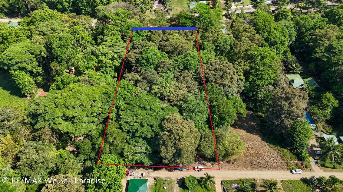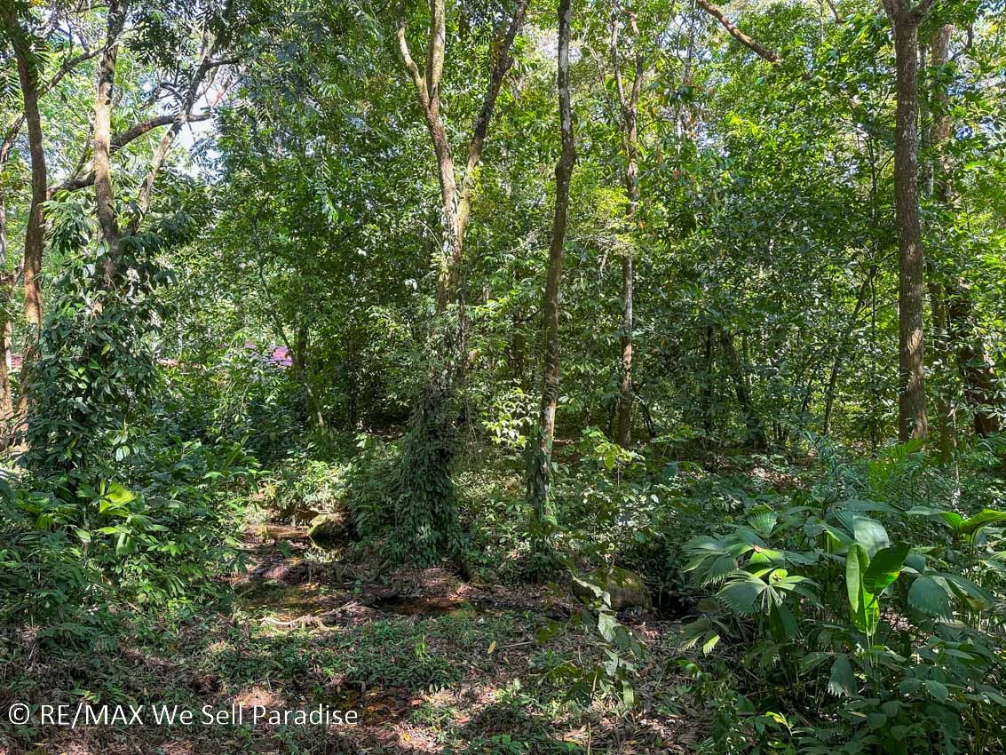 This large 1.3 acre lot – an oasis of greenery, peace and tranquillity – sits right inside the most sought-after real estate location of Costa Ballena: the amazing jungle town of OJOCHAL. On one end the land borders a mountain river flanked by towering rainforest trees. This year-round river is clean, cool and offers many swimming holes which could make for perfect hot afternoon dips – and a few dozen strategically placed rocks would create a deep and cool swim hole big and deep enough for a large group to relax in! Inside the property a smaller year-round creek flanks the large centrally located plantel – a perfect spot for a house, as it would take full advantage of the rainforest surroundings and allow for the sound of the nearby river to accompany the jungle bird and animal ambience.