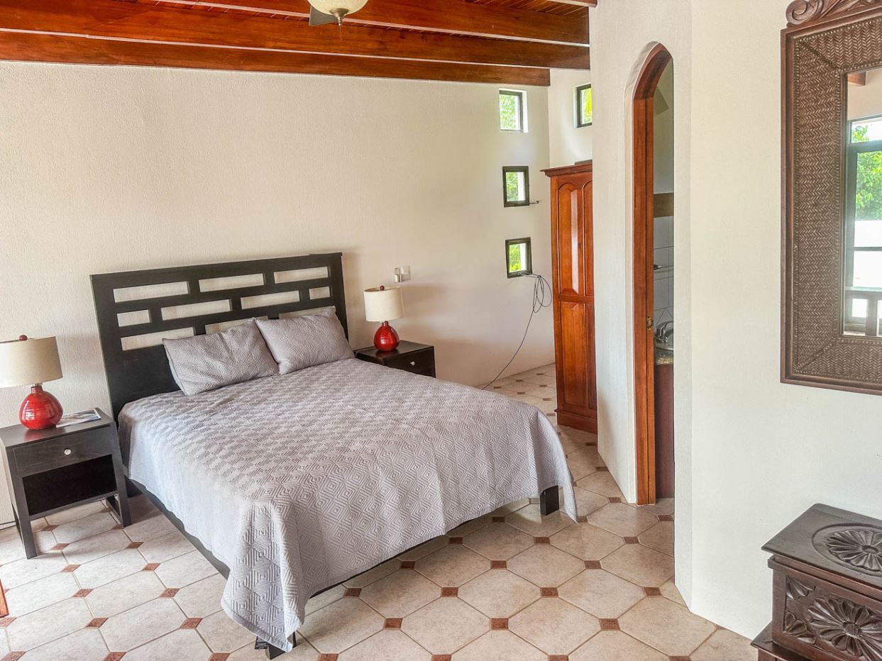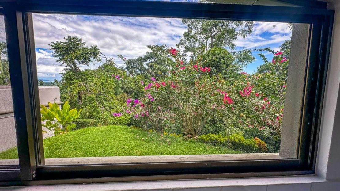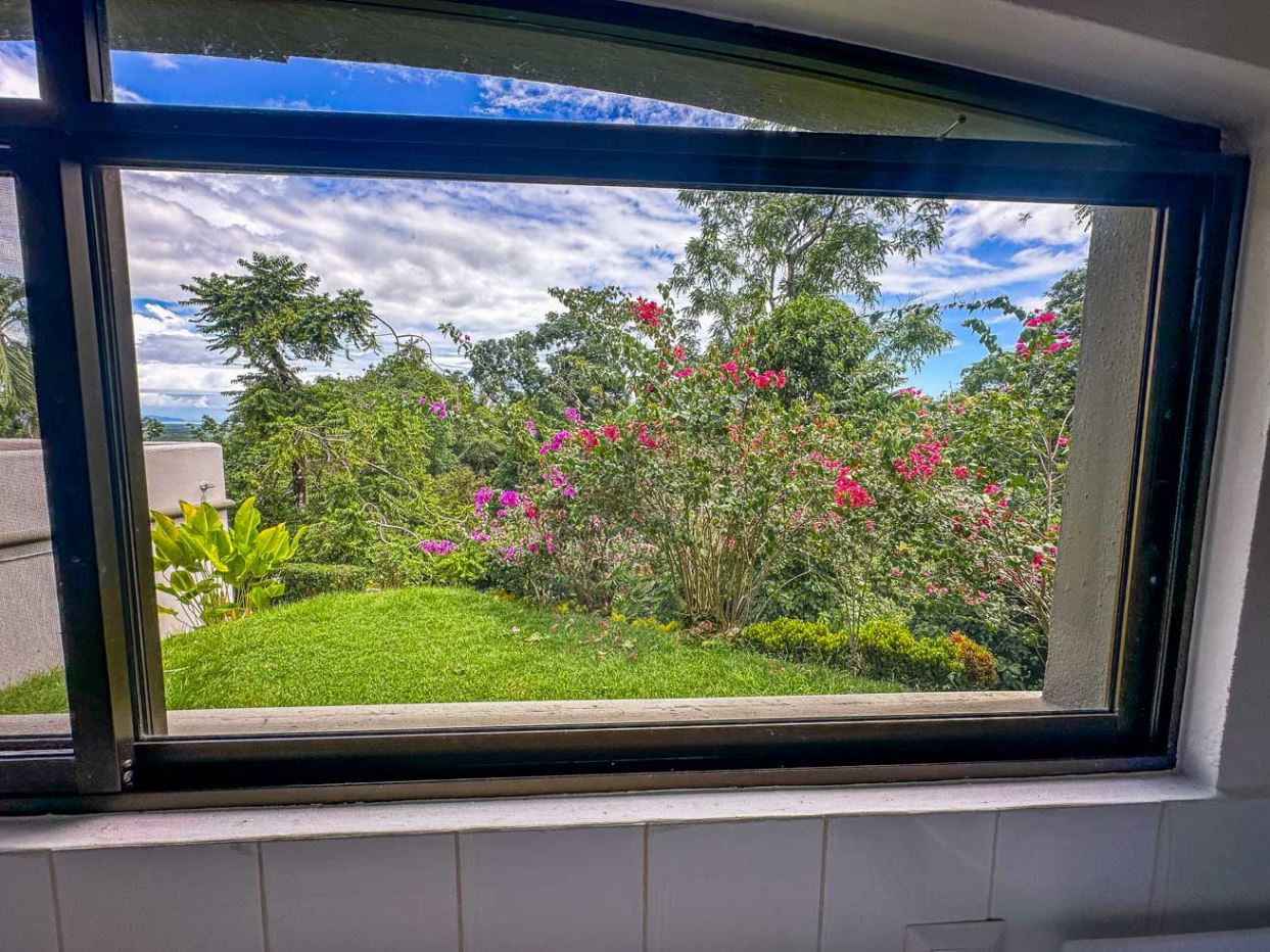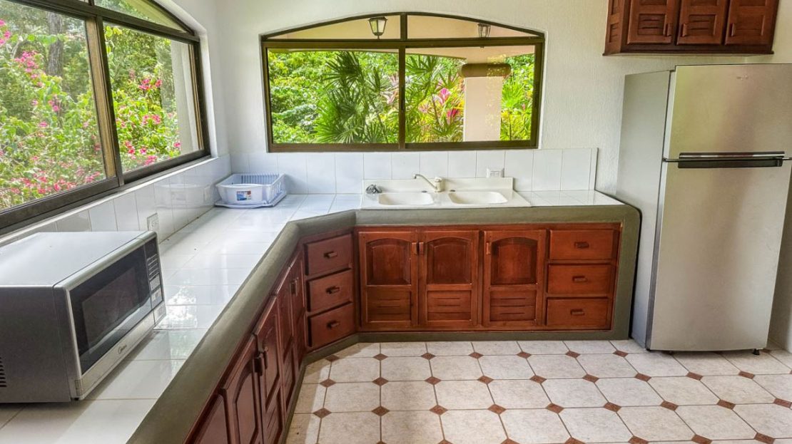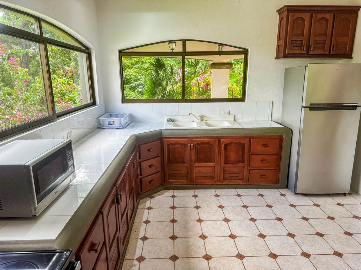 The white walls, bright tiles, and lumber cabinets & accents create a light, airy and inviting atmosphere. Air conditioning is provided throughout, and the window views offer calming jungle and landscaped garden vistas.