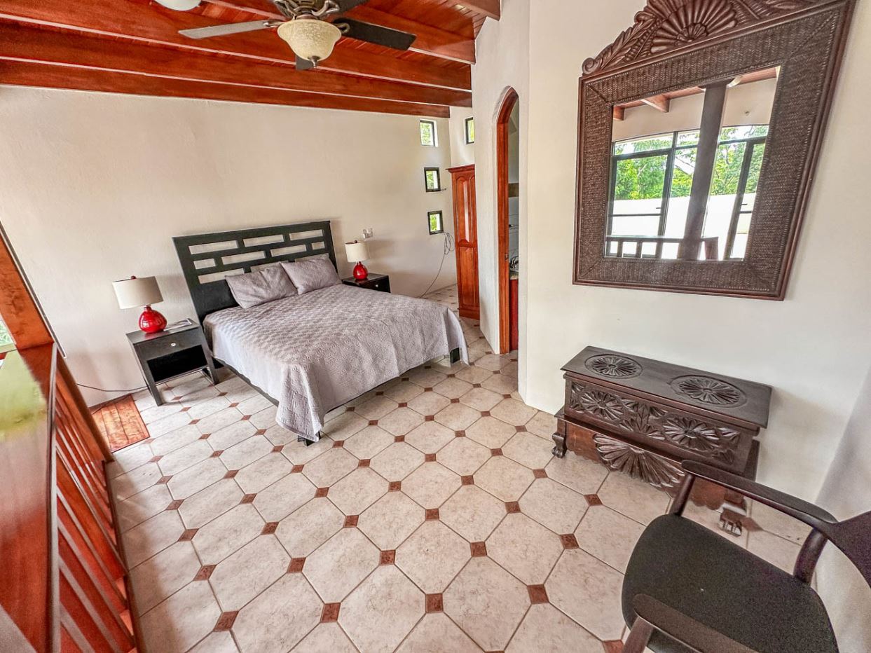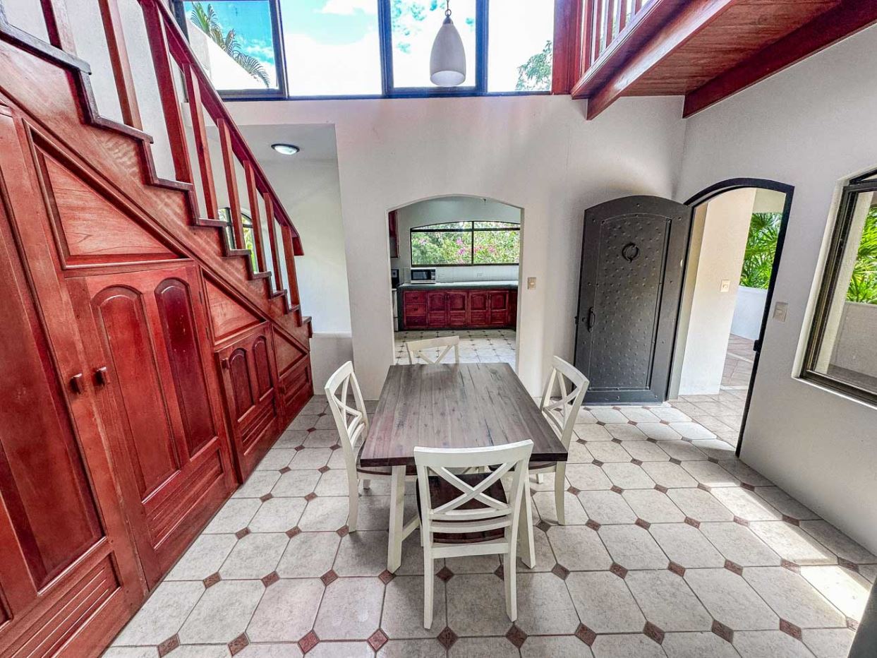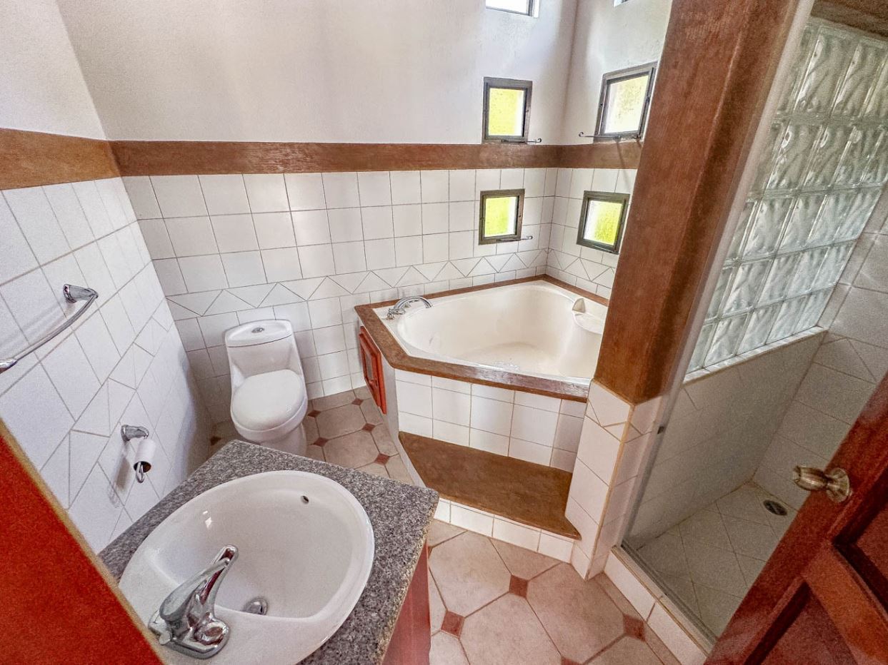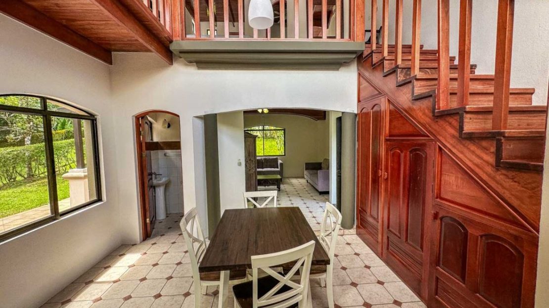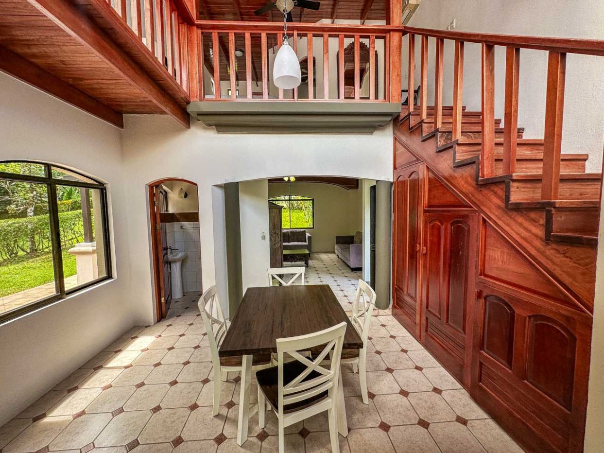 The white walls, bright tiles, and lumber cabinets & accents create a light, airy and inviting atmosphere. Air conditioning is provided throughout, and the window views offer calming jungle and landscaped garden vistas.