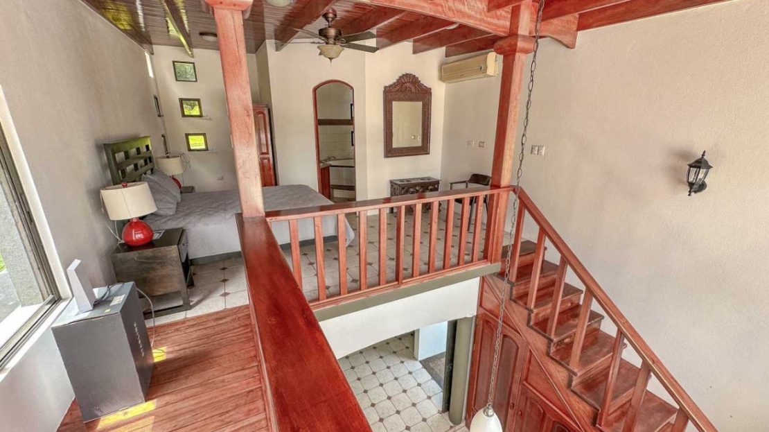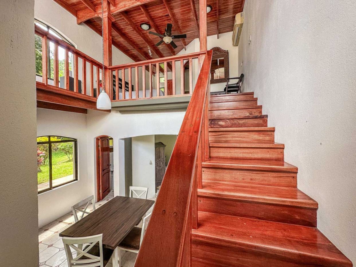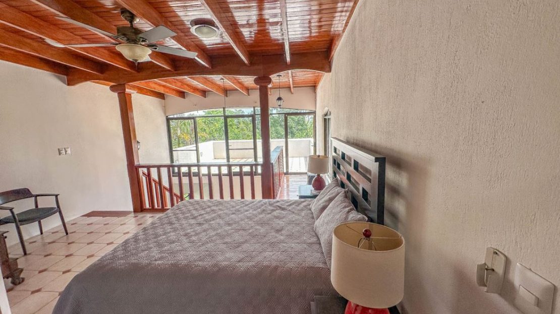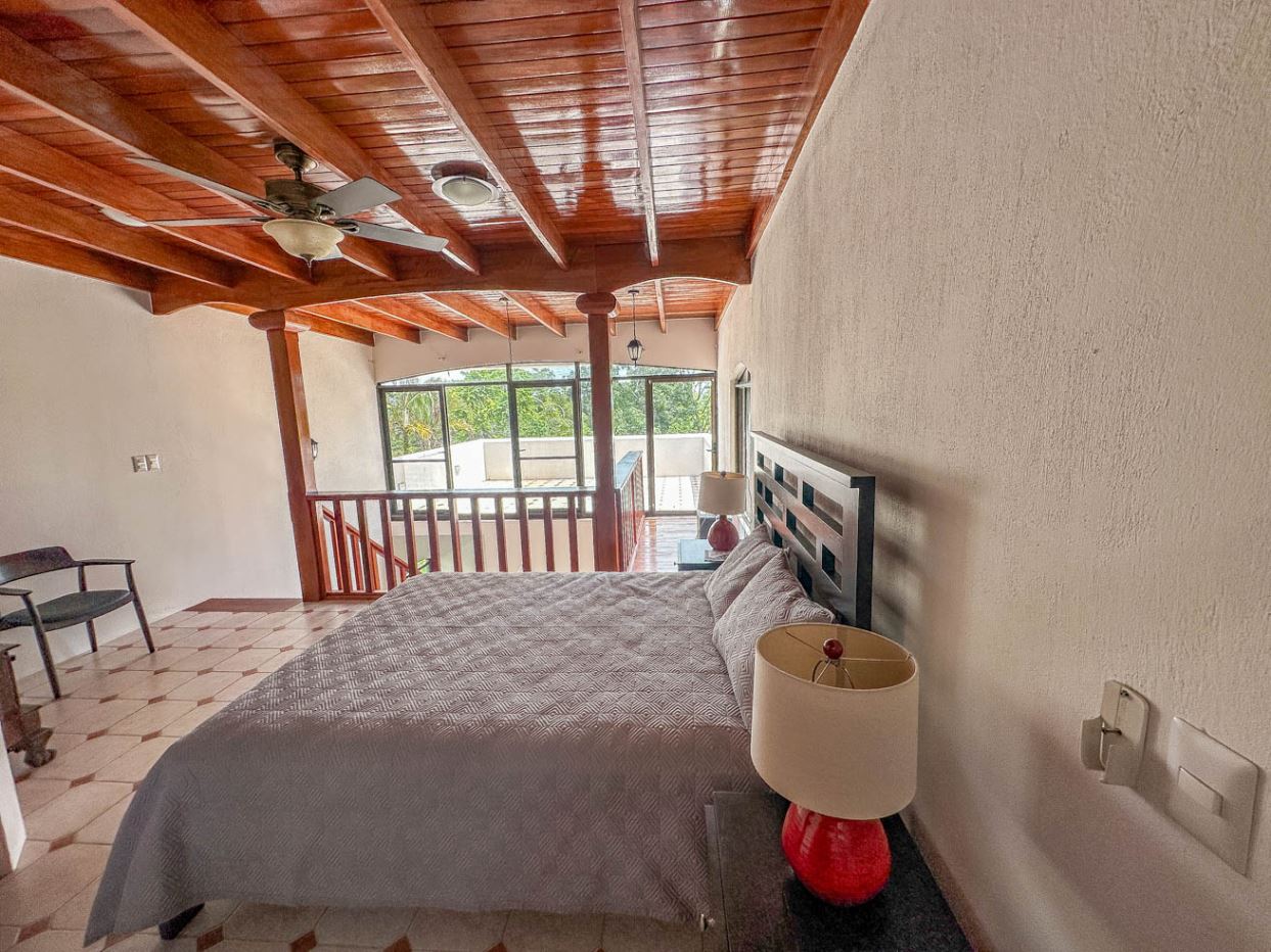 The home’s lower level holds a big and fully equipped kitchen, masterfully designed with ample storage and counter space. The kitchen opens to a central dining area and then a large & spacious living space which can be shaped to fit any desire. Outside, a large covered deck invites you to enjoy the peace & views under the protection from the midday sun and passing rain showers – but sunny sections are also available if you choose to catch a tan! A staircase ascends to the upper floor and the loft master bedroom and shower & jacuzzi bath ensuite – this upper floor loft is fully open and leads to a sunny outdoor terrace which is exposed by wall-to-wall panoramic windows. Imagine waking up to the sounds of a stirring jungle as you walk onto the terrace to glimpse the pastel colors of a stirring dawn under the roar of the jungle chorus…this is paradise.