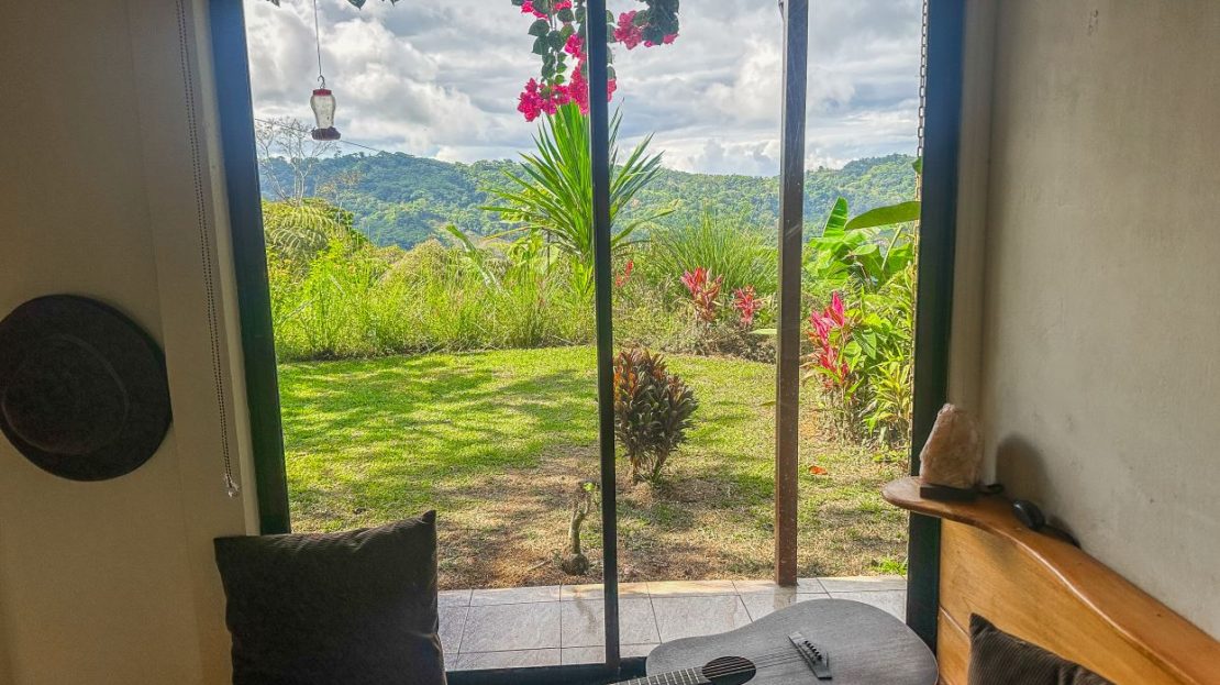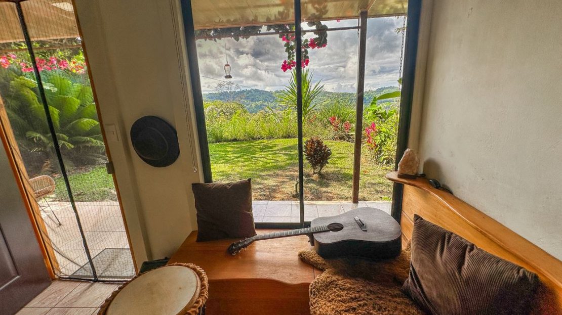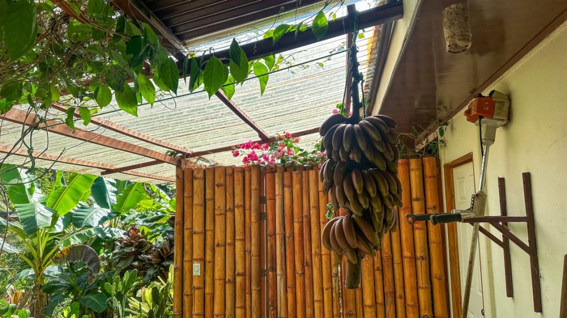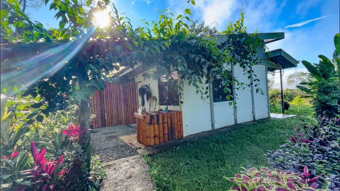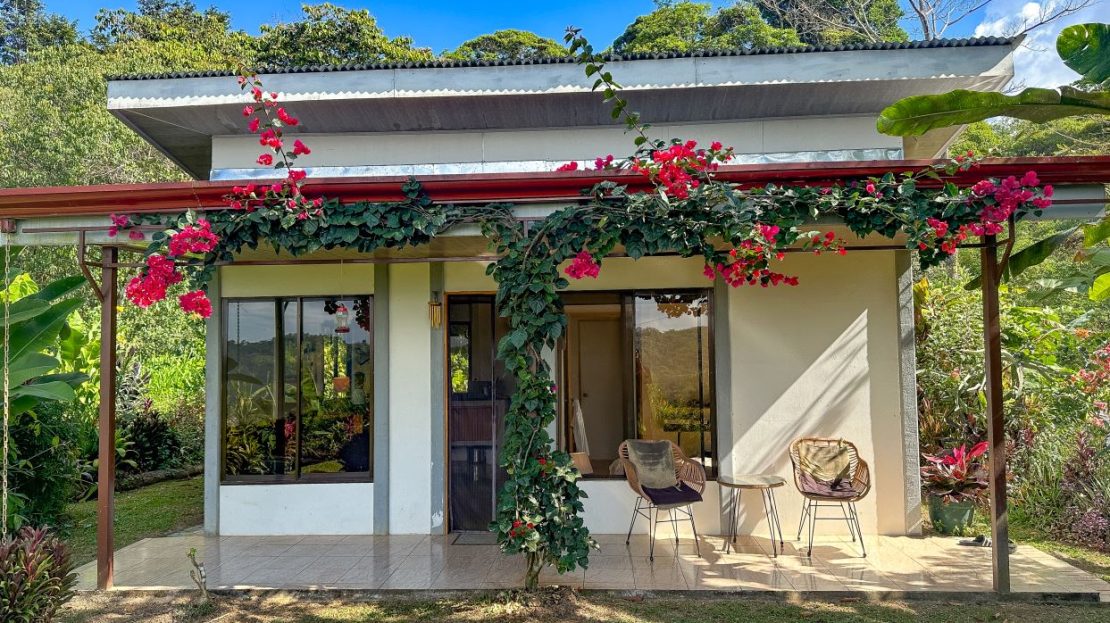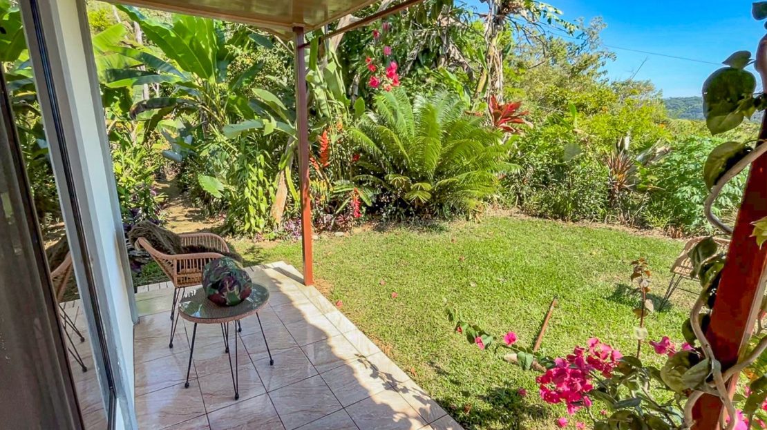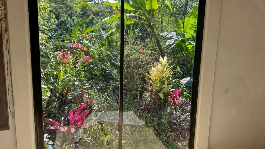 The single-bed house, with a million-dollar view, offers a tropical, bright, and open living concept. The bathroom / laundry area is especially striking in that regard – under a translucent roof, you can feel the warm sun which also nourishes the flowering bougainvillea that sneak into the space along the open ceiling. Numerous plants, some potted and some growing straight through the gravel flooring, add a touch of brilliant & bursting rainforest vibe – you have NEVER seen a bathroom quite like this one! The kitchen holds a fridge, gas burner, electric oven and plenty of storage – this kitchen space is also shared with a living area which opens into the front entrance / patio. The bedroom is bright, with the large windows welcoming the sunshine and exotic vistas. Up front, a covered entrance / patio is graced by climbing bougainvillea, manicured lawn & garden, and tropical mountain views – offering a place of relaxation, meditation or entertainment. A perfect spot for your morning coffee or afternoon drinks.