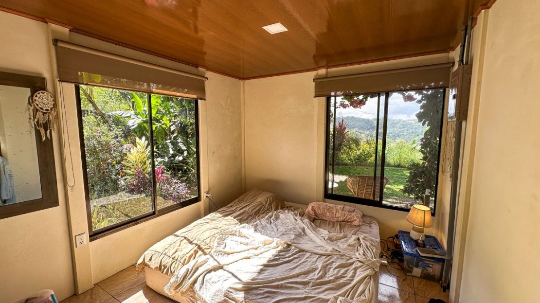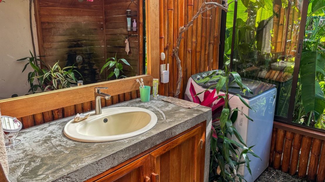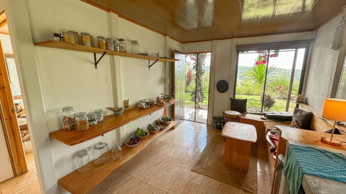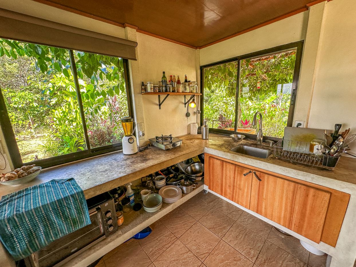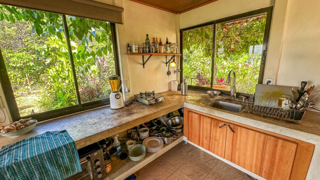 The single-bed house, with a million-dollar view, offers a tropical, bright, and open living concept. The bathroom / laundry area is especially striking in that regard – under a translucent roof, you can feel the warm sun which also nourishes the flowering bougainvillea that sneak into the space along the open ceiling. Numerous plants, some potted and some growing straight through the gravel flooring, add a touch of brilliant & bursting rainforest vibe – you have NEVER seen a bathroom quite like this one! The kitchen holds a fridge, gas burner, electric oven and plenty of storage – this kitchen space is also shared with a living area which opens into the front entrance / patio. The bedroom is bright, with the large windows welcoming the sunshine and exotic vistas. Up front, a covered entrance / patio is graced by climbing bougainvillea, manicured lawn & garden, and tropical mountain views – offering a place of relaxation, meditation or entertainment. A perfect spot for your morning coffee or afternoon drinks.