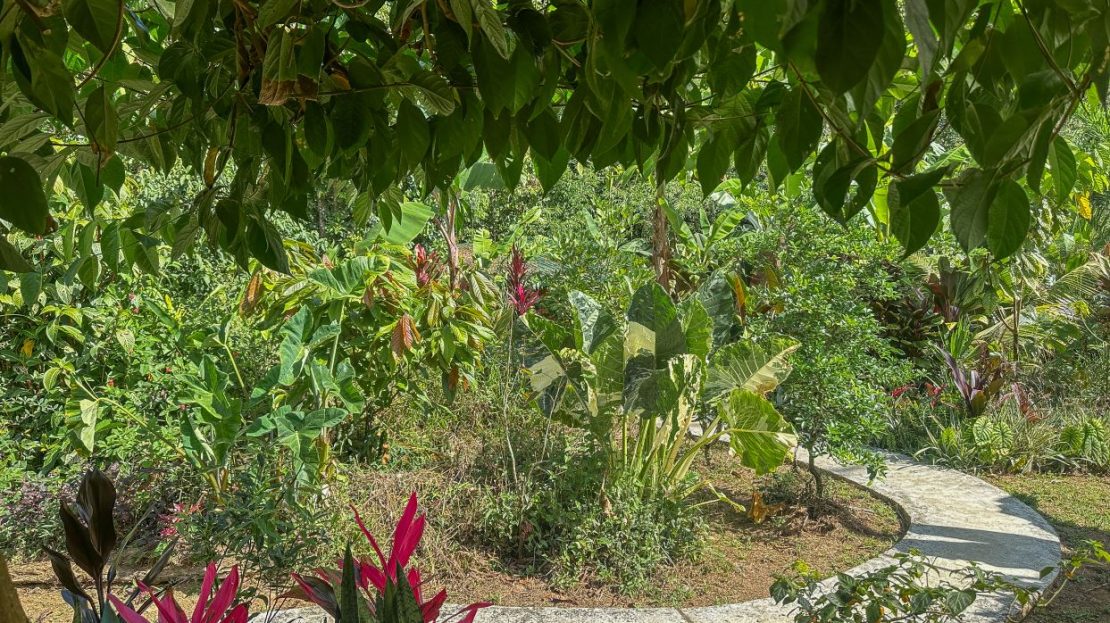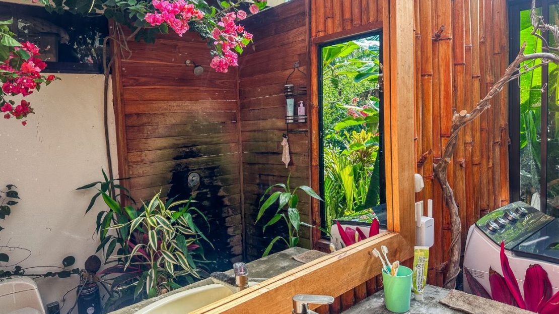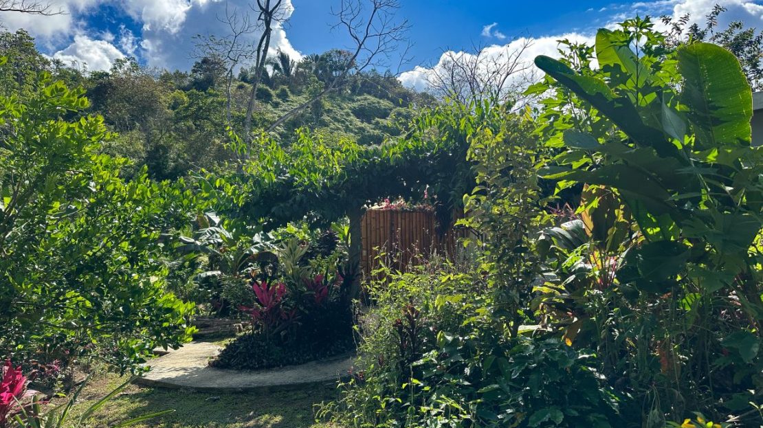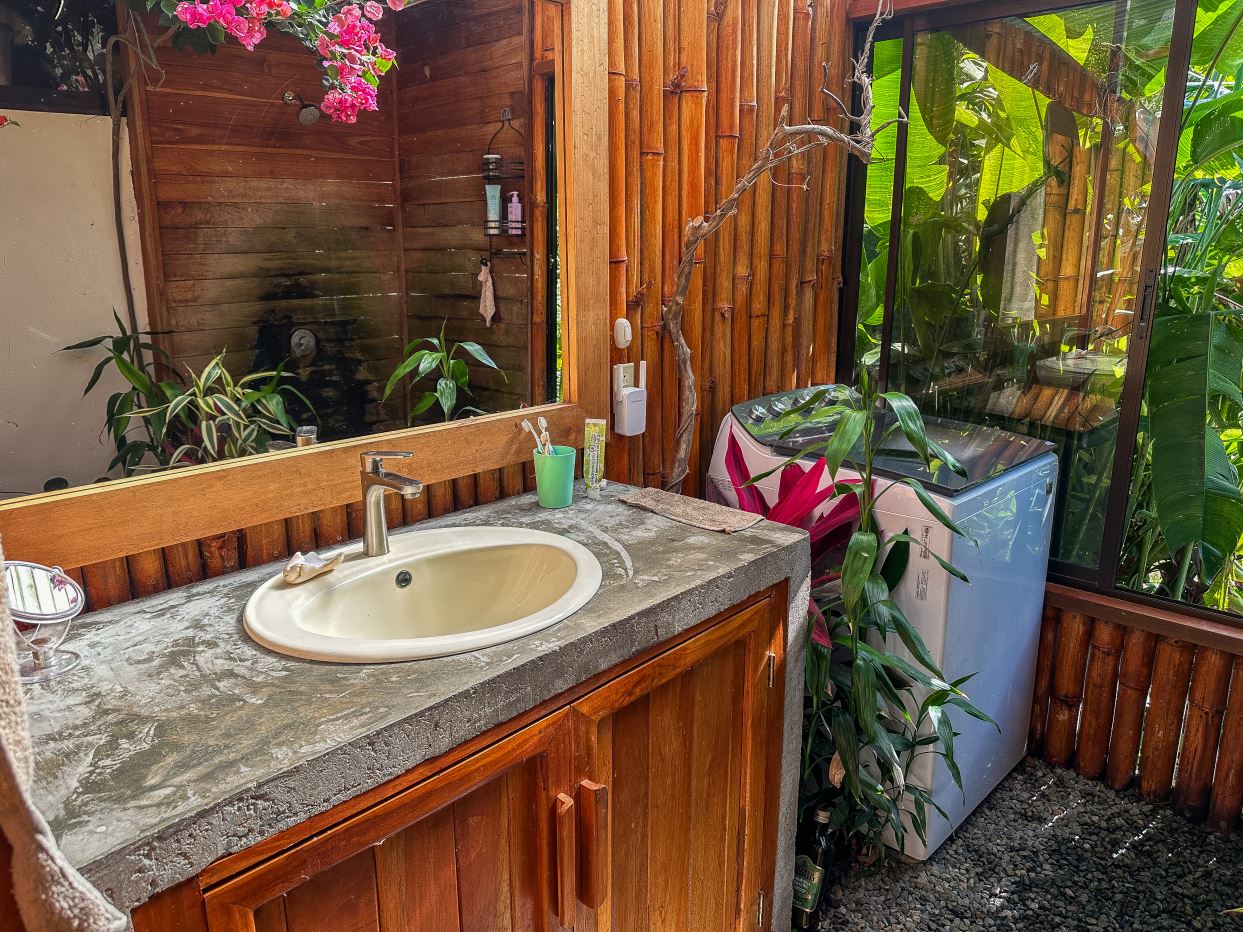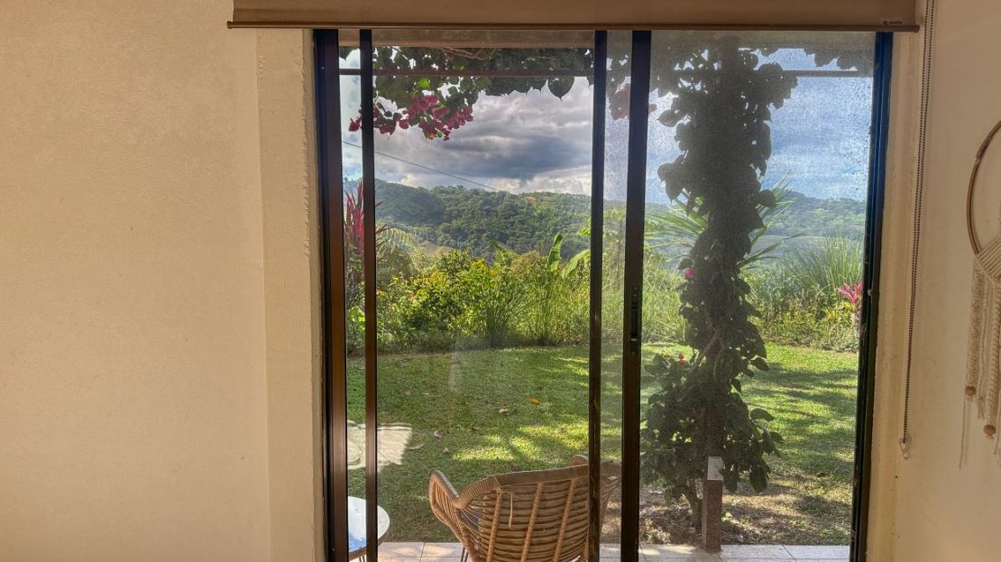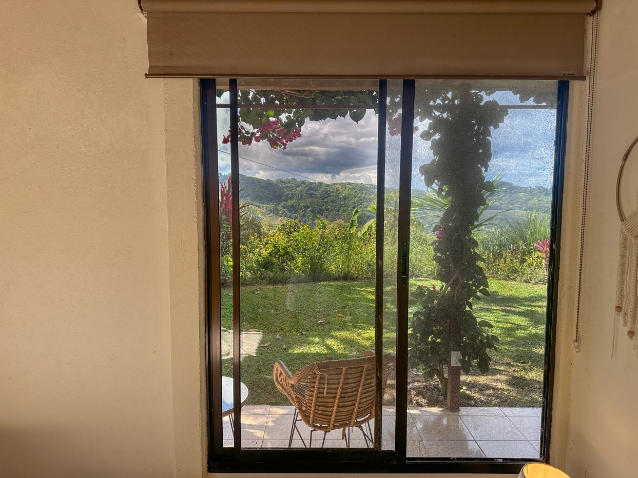 The single-bed house, with a million-dollar view, offers a tropical, bright, and open living concept. The bathroom / laundry area is especially striking in that regard – under a translucent roof, you can feel the warm sun which also nourishes the flowering bougainvillea that sneak into the space along the open ceiling. Numerous plants, some potted and some growing straight through the gravel flooring, add a touch of brilliant & bursting rainforest vibe – you have NEVER seen a bathroom quite like this one! The kitchen holds a fridge, gas burner, electric oven and plenty of storage – this kitchen space is also shared with a living area which opens into the front entrance / patio. The bedroom is bright, with the large windows welcoming the sunshine and exotic vistas. Up front, a covered entrance / patio is graced by climbing bougainvillea, manicured lawn & garden, and tropical mountain views – offering a place of relaxation, meditation or entertainment. A perfect spot for your morning coffee or afternoon drinks.