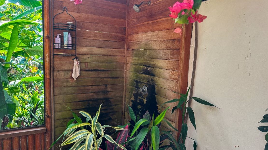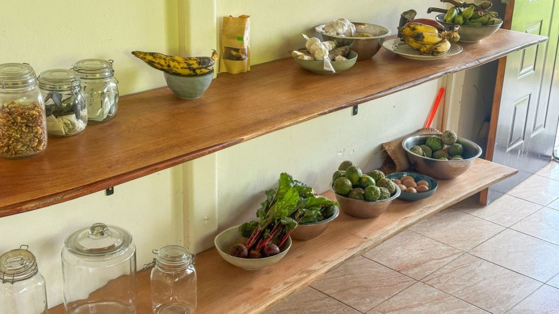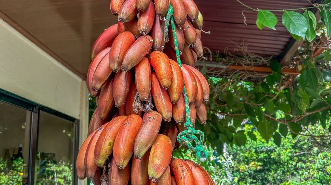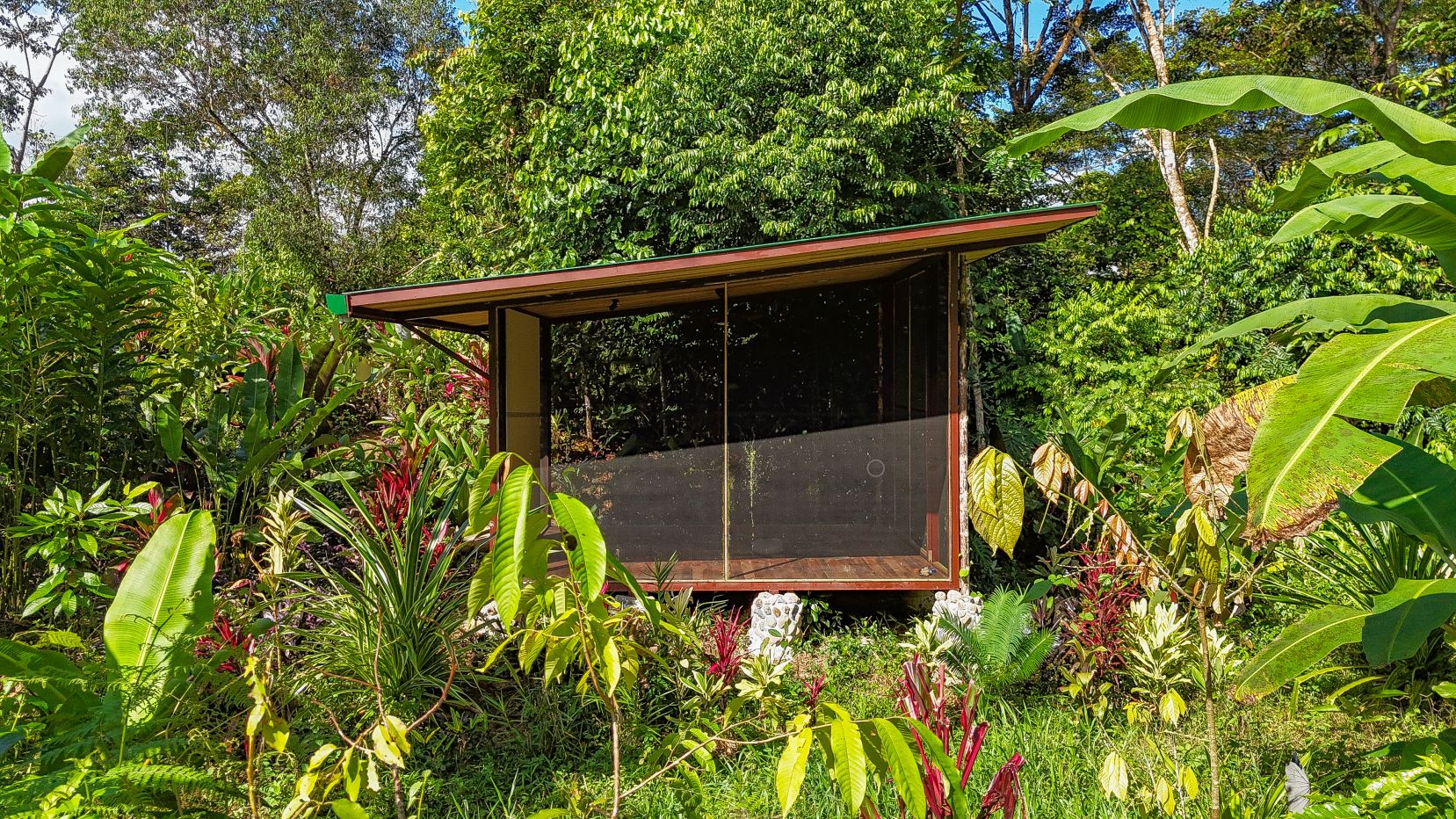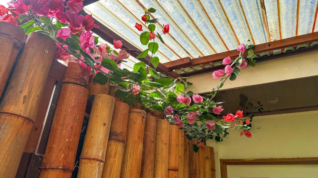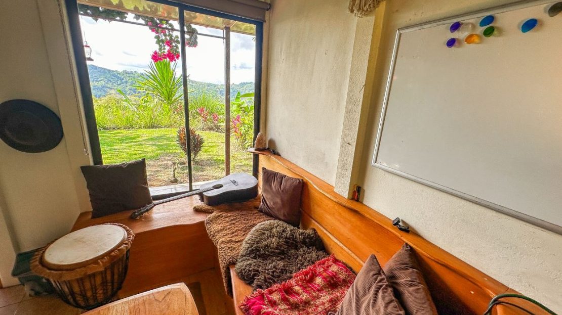 The single-bed house, with a million-dollar view, offers a tropical, bright, and open living concept. The bathroom / laundry area is especially striking in that regard – under a translucent roof, you can feel the warm sun which also nourishes the flowering bougainvillea that sneak into the space along the open ceiling. Numerous plants, some potted and some growing straight through the gravel flooring, add a touch of brilliant & bursting rainforest vibe – you have NEVER seen a bathroom quite like this one! The kitchen holds a fridge, gas burner, electric oven and plenty of storage – this kitchen space is also shared with a living area which opens into the front entrance / patio. The bedroom is bright, with the large windows welcoming the sunshine and exotic vistas. Up front, a covered entrance / patio is graced by climbing bougainvillea, manicured lawn & garden, and tropical mountain views – offering a place of relaxation, meditation or entertainment. A perfect spot for your morning coffee or afternoon drinks.