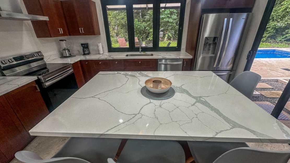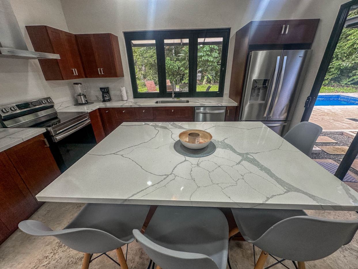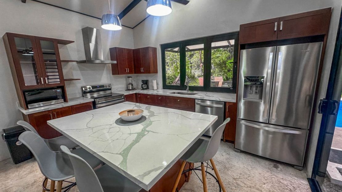 A covered entranceway leads to the central hallway which connects the two parts of the home. The left portion holds a large & fully-equipped kitchen which looks onto the lush towering jungles – a grande view while you are chopping onions or mixing the stir fry. Marble countertops and rich, lumber cabinets provide the perfect contrast. The kitchen holds a large marble-top island that can accommodate the dining needs of a large family – although a more traditional six-place dining table is also provided. Behind the dining table, the living area invites with an L-couch, big-screen TV, and beautiful art & accents.