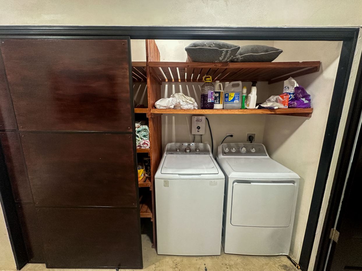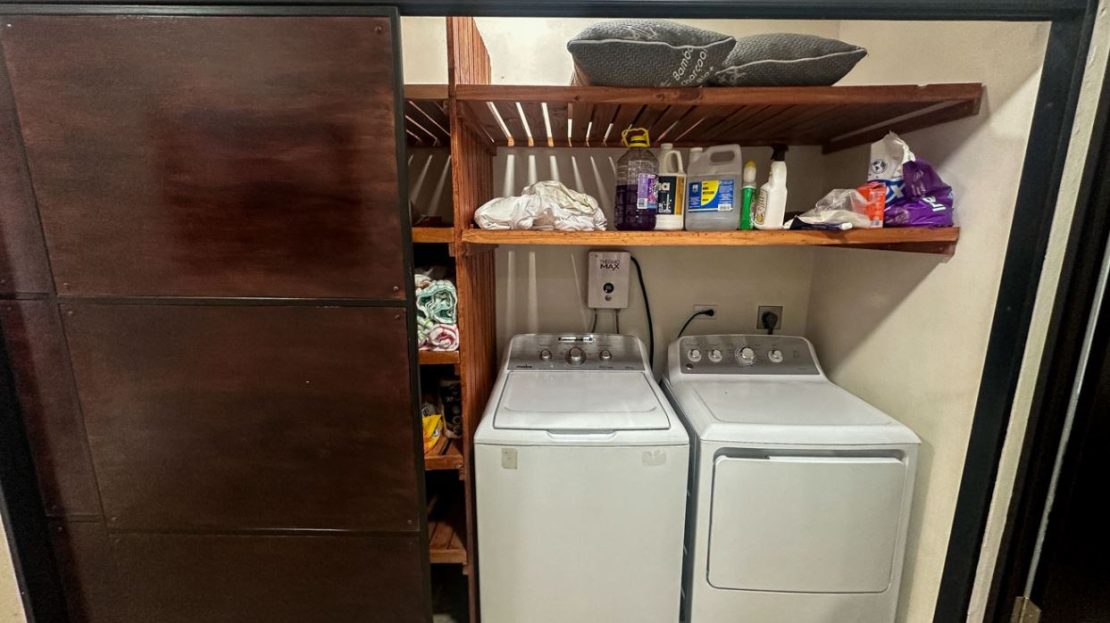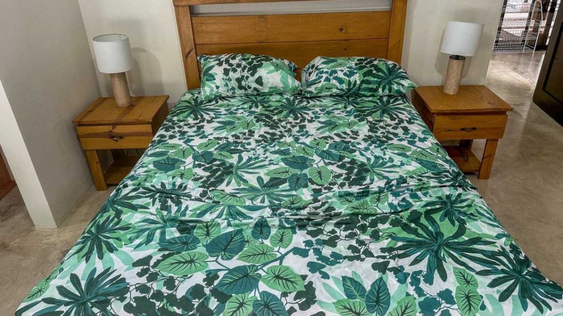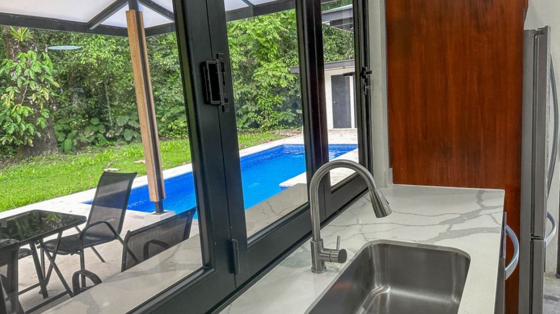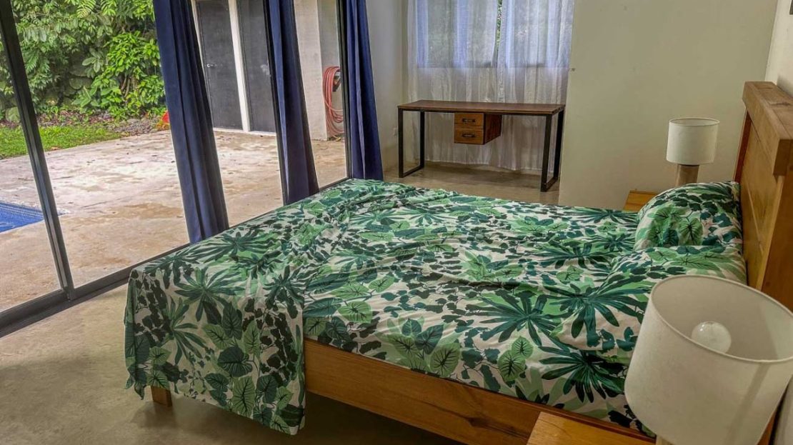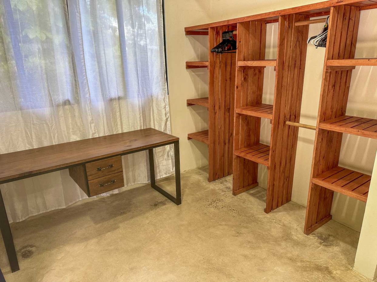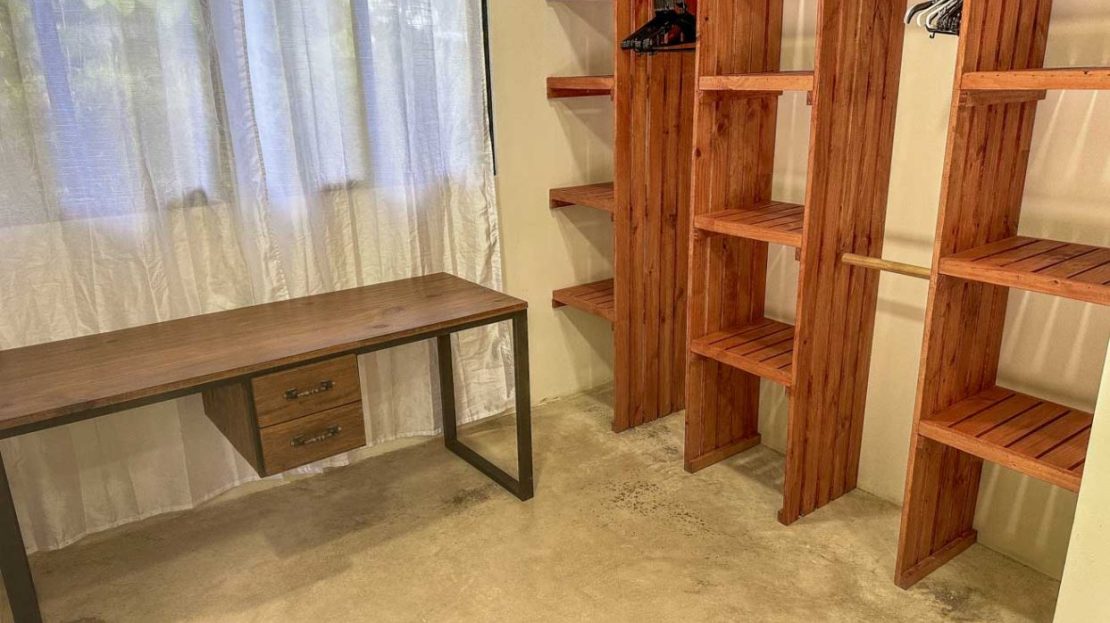 The other part of the home holds three bedrooms and a single bathroom. The large Master Bedroom looks onto the deck, pool and majestic jungles just over an arm’s reach away. It offers extensive storage and floor-to-ceiling glazing with direct patio-door access to the backyard. The other two bedroom are also bright, airy and provide plenty of storage space – and all three rooms impress with beautiful lumber beds, furniture, and shelving. The bathroom is accented with black marble tile – the large shower and monsoon shower-head add a touch of comfort & luxury.