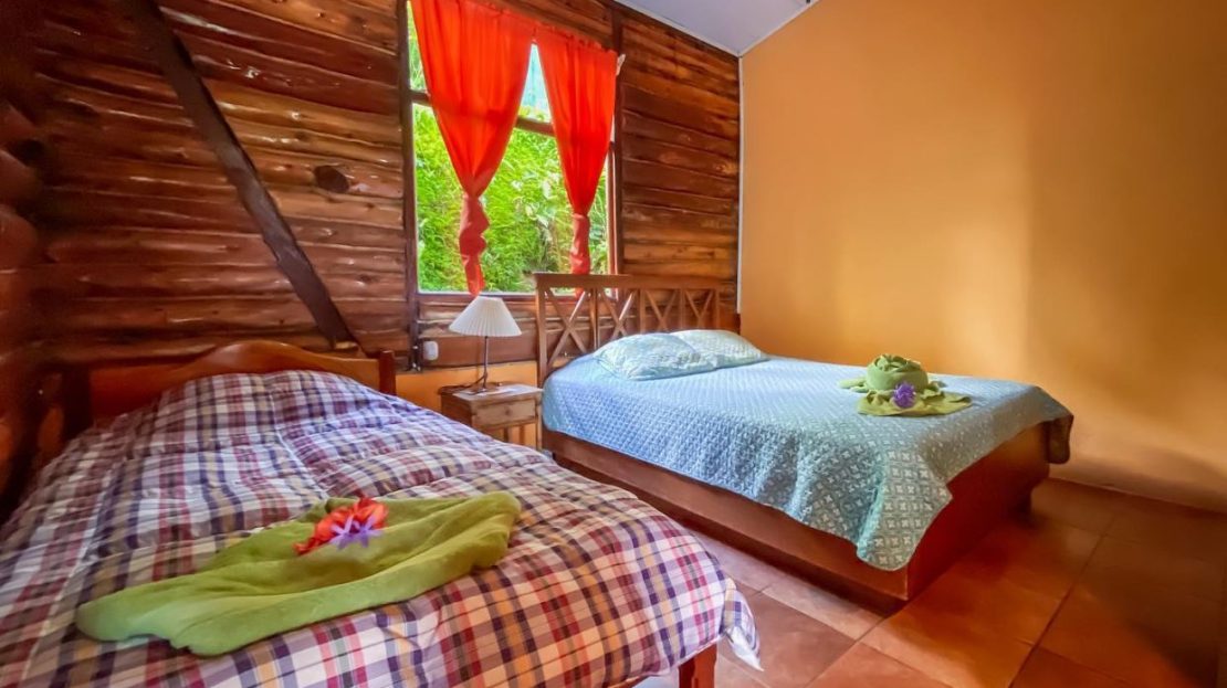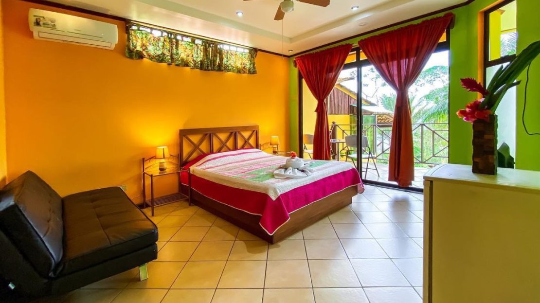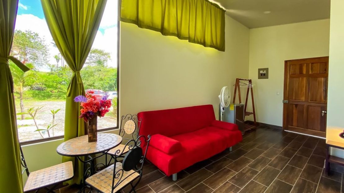Arenal Garden Lodge boasts 8 beautifully designed rooms, including 2 luxurious Suites with Jacuzzi, 2 comfortable Junior Suites, and 1 room adapted to meet the needs of those with disabilities There is also an apartment with a full kitchen, perfect for longer stays, along with a rustic remodeled cabin divided into two rooms, each equipped with a kitchenette for added convenience. The inviting cafeteria/reception area creates a warm and welcoming space for guests to relax and enjoy their surroundings.