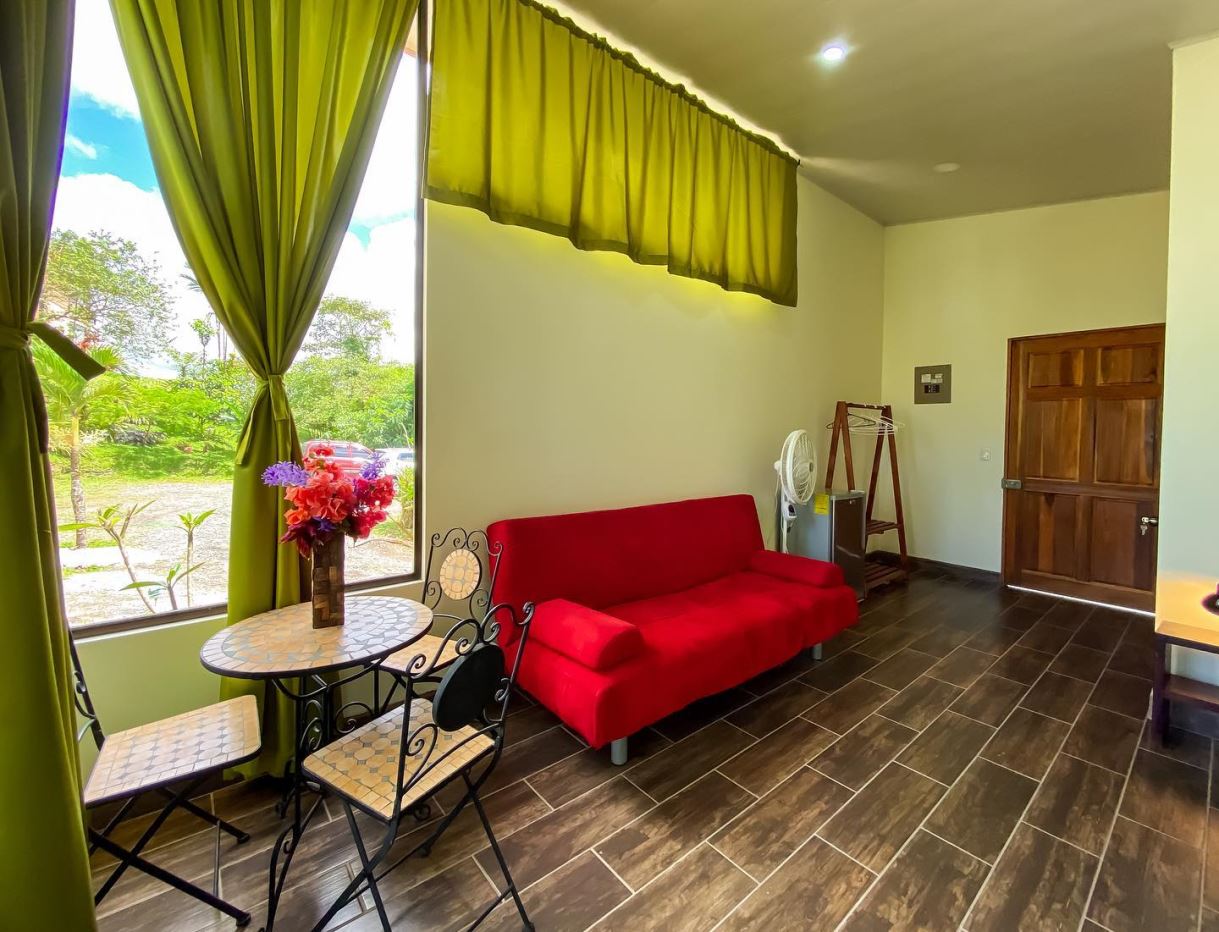 Arenal Garden Lodge boasts 8 beautifully designed rooms, including 2 luxurious Suites with Jacuzzi, 2 comfortable Junior Suites, and 1 room adapted to meet the needs of those with disabilities There is also an apartment with a full kitchen, perfect for longer stays, along with a rustic remodeled cabin divided into two rooms, each equipped with a kitchenette for added convenience. The inviting cafeteria/reception area creates a warm and welcoming space for guests to relax and enjoy their surroundings.
