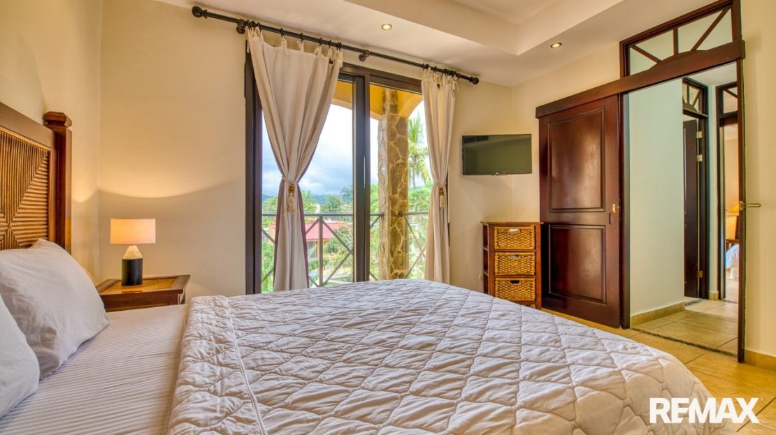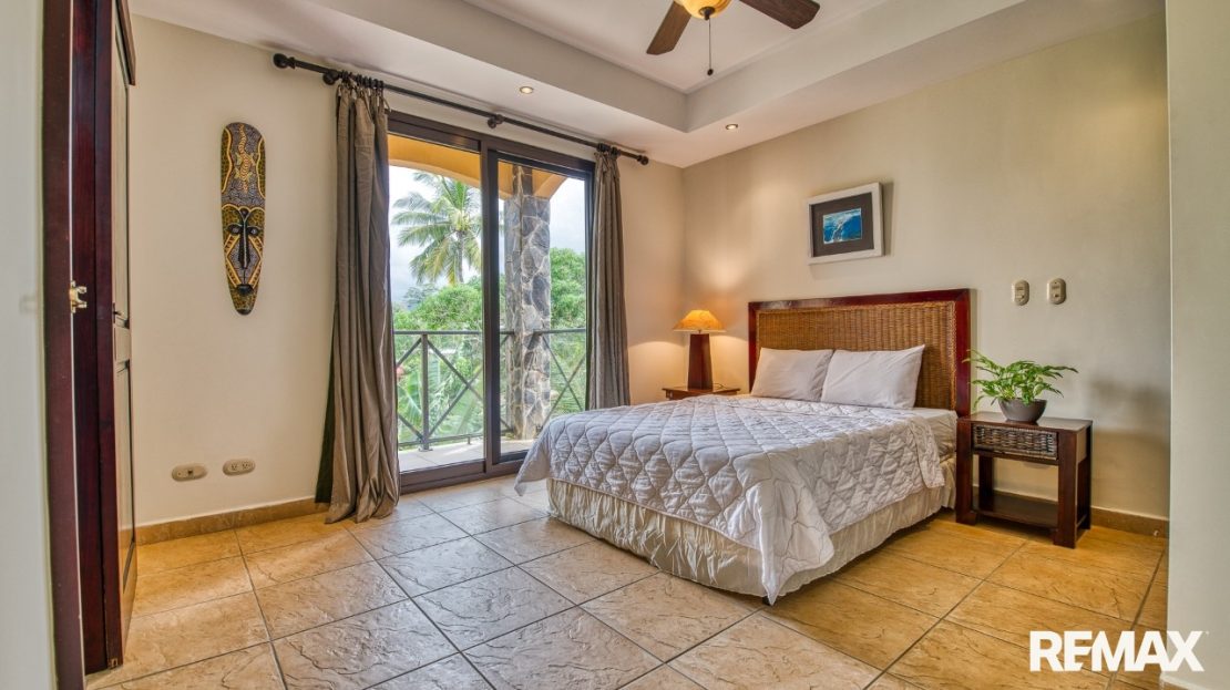 Every bedroom in this residence features its own private balcony overlooking the lush green hills that cradle Jaco—ideal for morning coffee or peaceful evenings. The spacious master suite includes a king-size bed, a walk-in closet, and a private ensuite bathroom complete with a bathtub for ultimate relaxation.