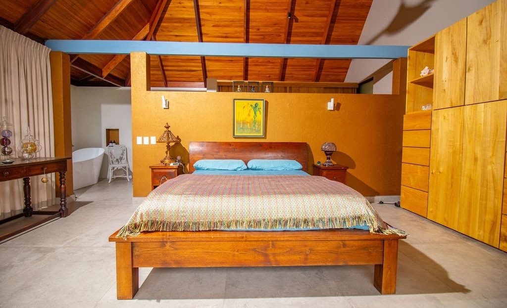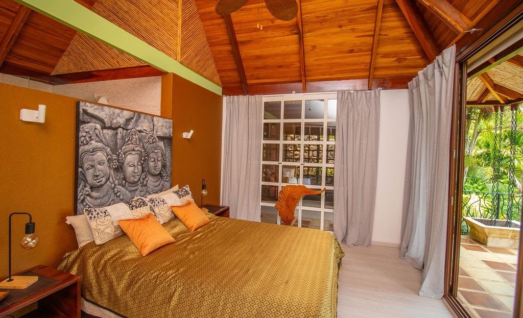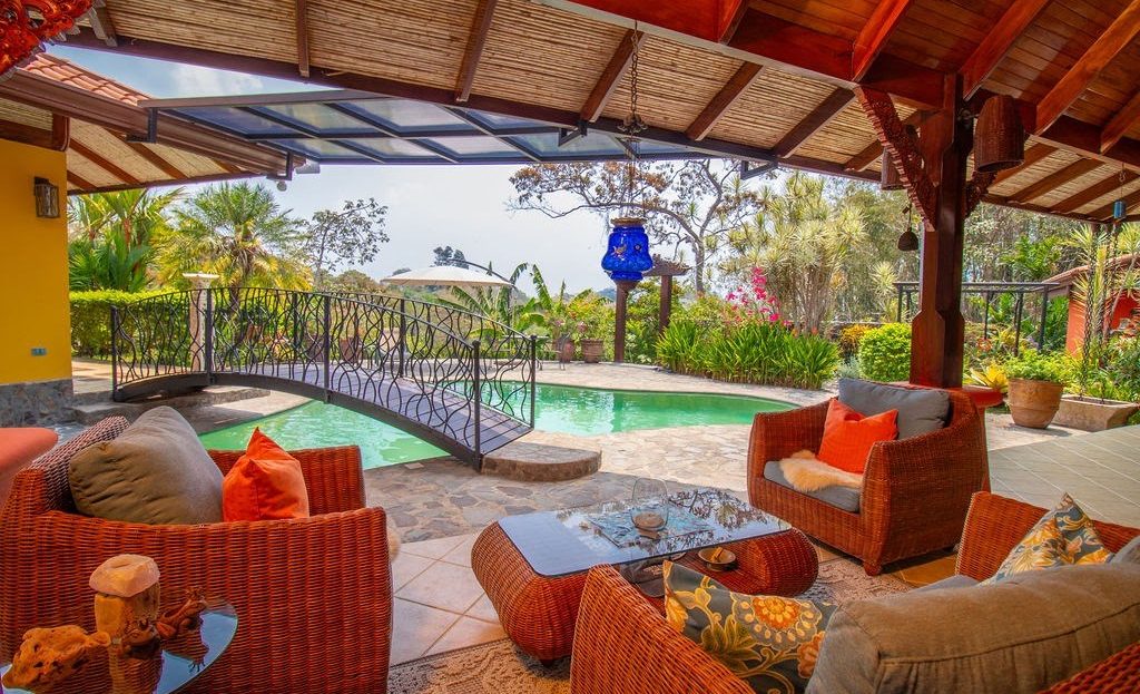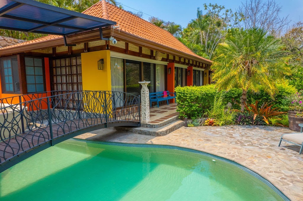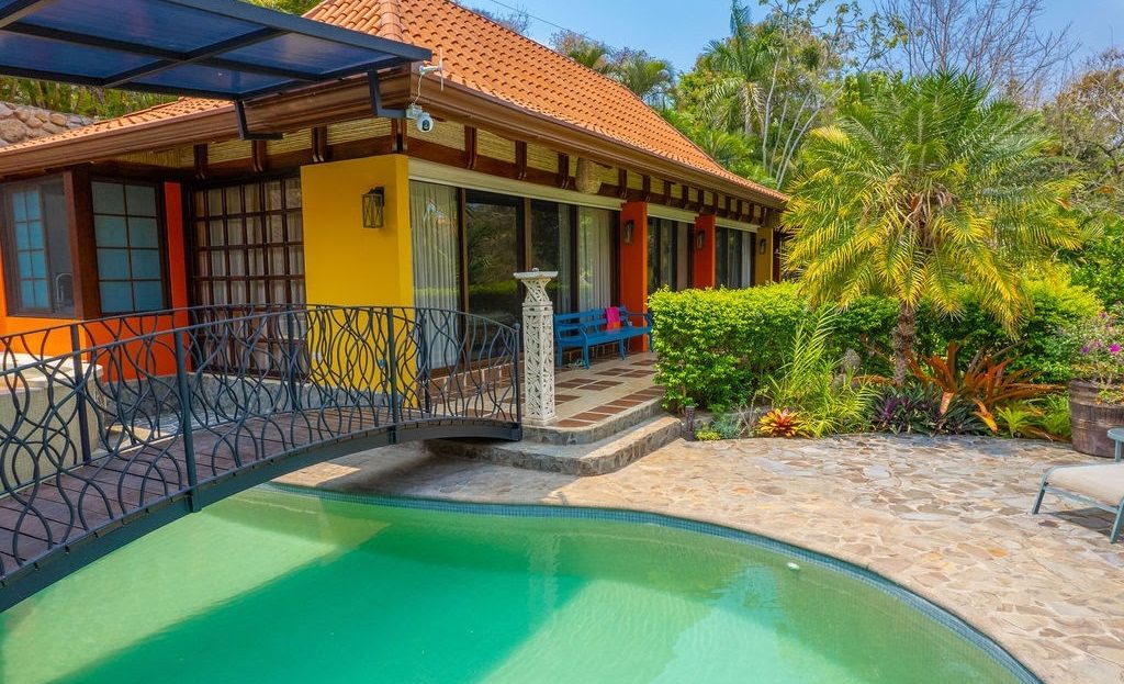 Cross over the swimming pool with the bridge that connects you to the bedroom pavilion.