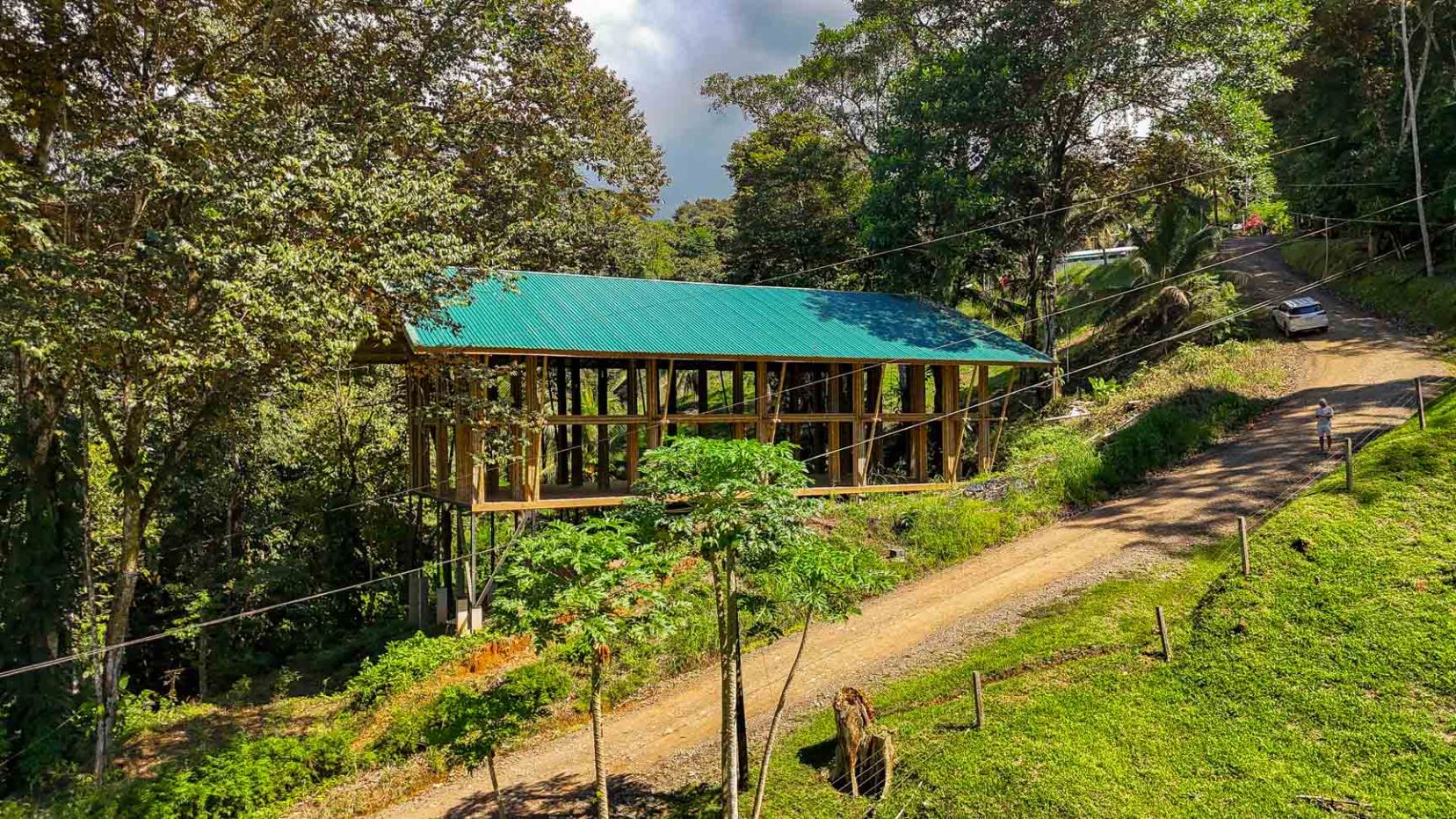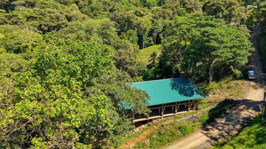 Perched above a lush valley, the building appears to float over the rainforest canopy, offering a rare sense of openness and connection to nature. Towering, mature rainforest trees circle the structure. The bold blend of concrete, metal, and timber delivers a contemporary yet primal aesthetic—perfectly aligned with the dramatic jungles, mountain backdrops, and rugged Pacific coastline that define the Costa Ballena region.