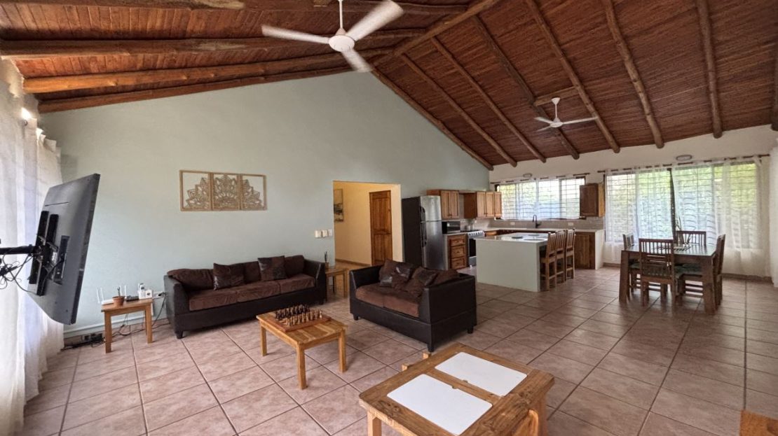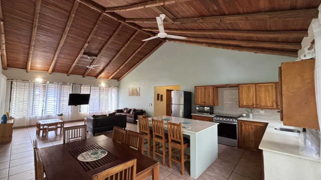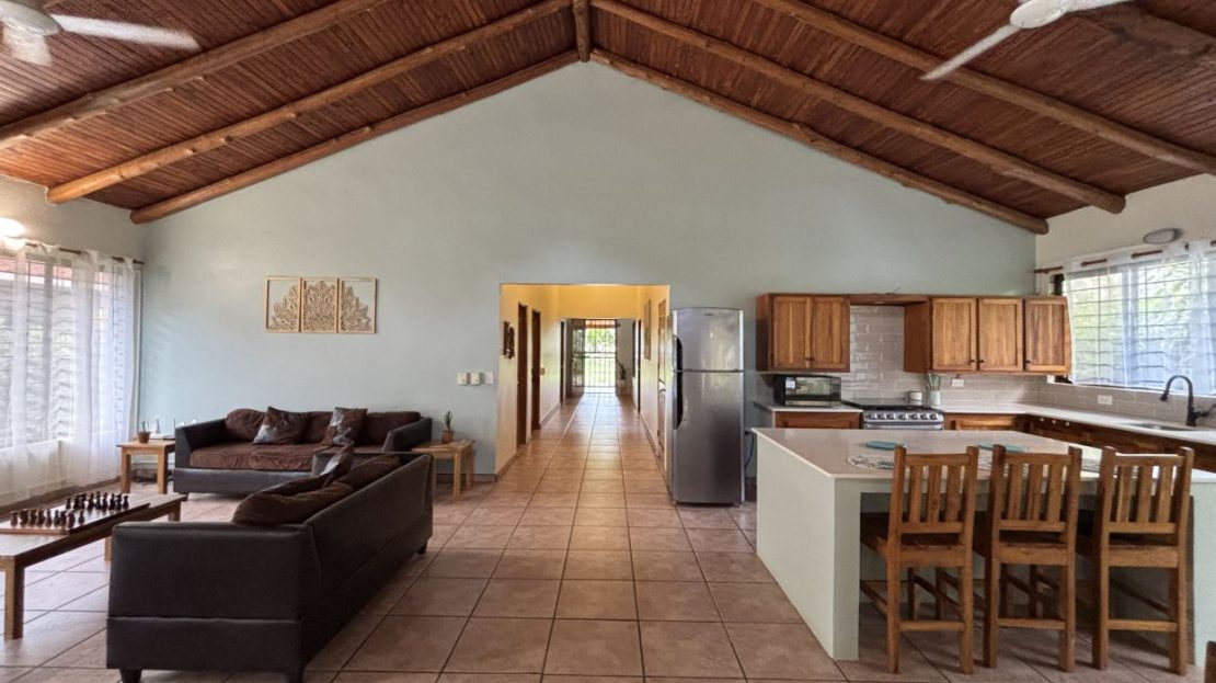 Cocina y Sala de Estar de Concepto Abierto – techos altos de madera, excelente iluminación y un diseño acogedor