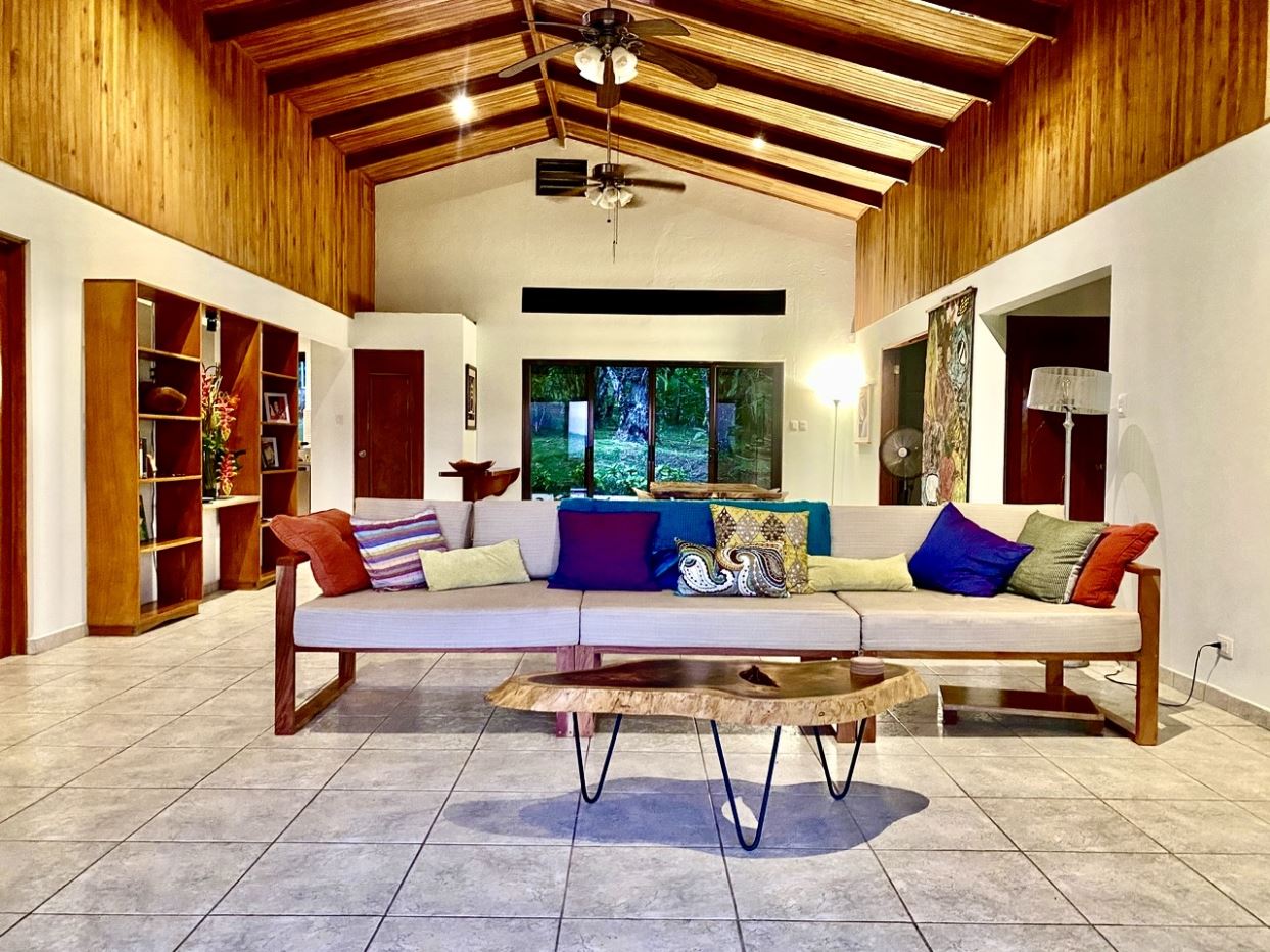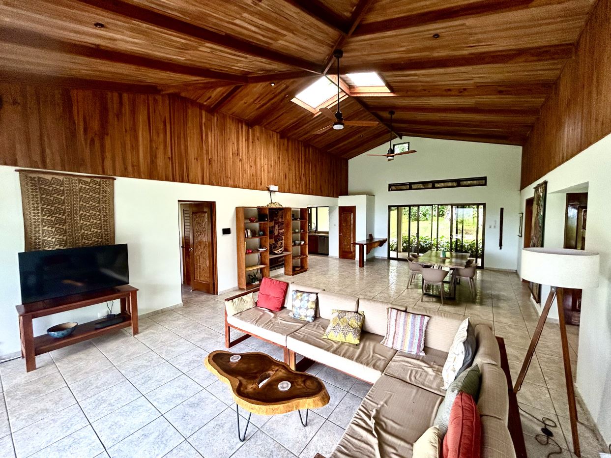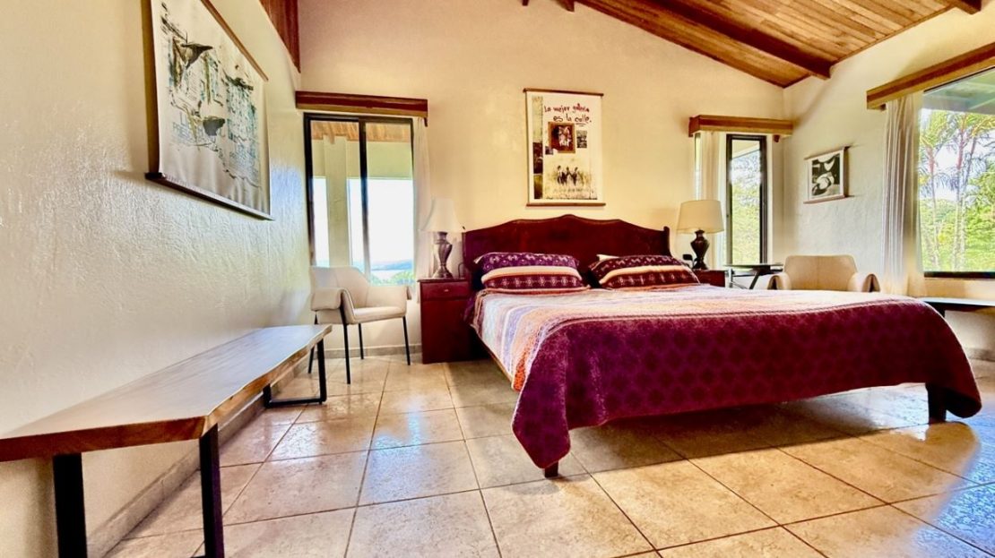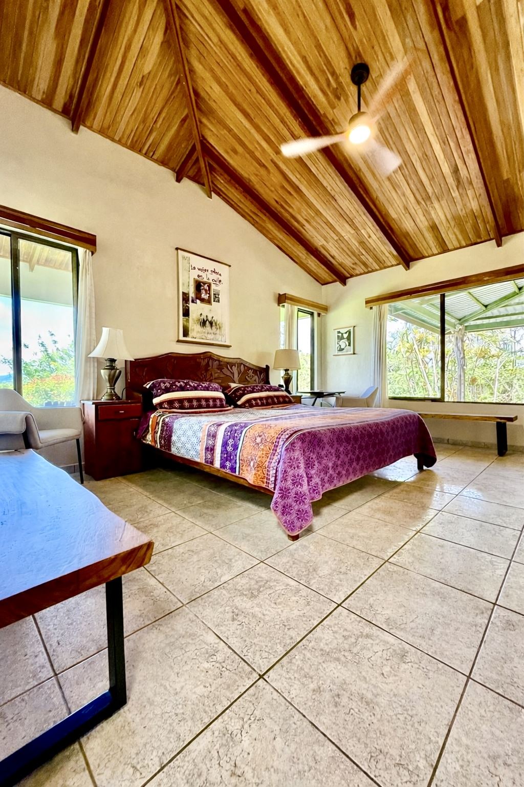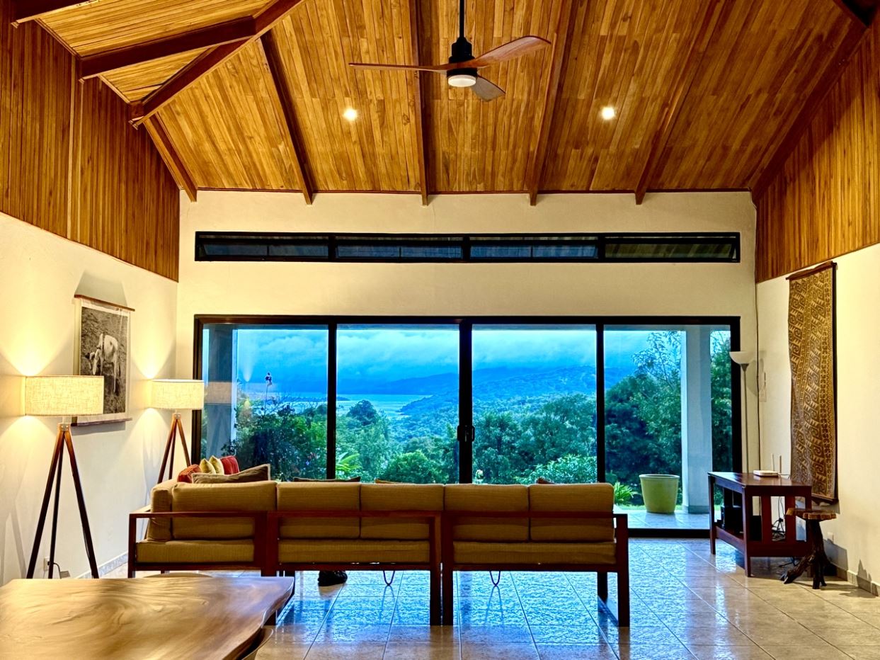 The home showcases an open-concept layout with thoughtful décor throughout and is tastefully furnished and offered for sale turnkey. There are several striking features of this home, most notably the 15-foot-high wood ceilings, which feature a living room skylight and define the main living and dining areas as the heart of the home. In addition, all doors are crafted from exotic wood and carved with designs specific to Costa Rican, adding warmth, character, and authentic local artistry. This central living space offers a strong sense of openness, natural light, and visual appeal, and flows seamlessly to covered terraces at both the front and rear, offering lake and volcano views to the front and a more secluded, tropical-inspired setting to the rear.