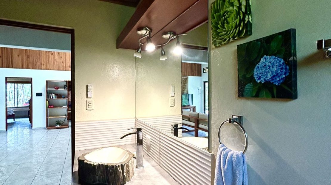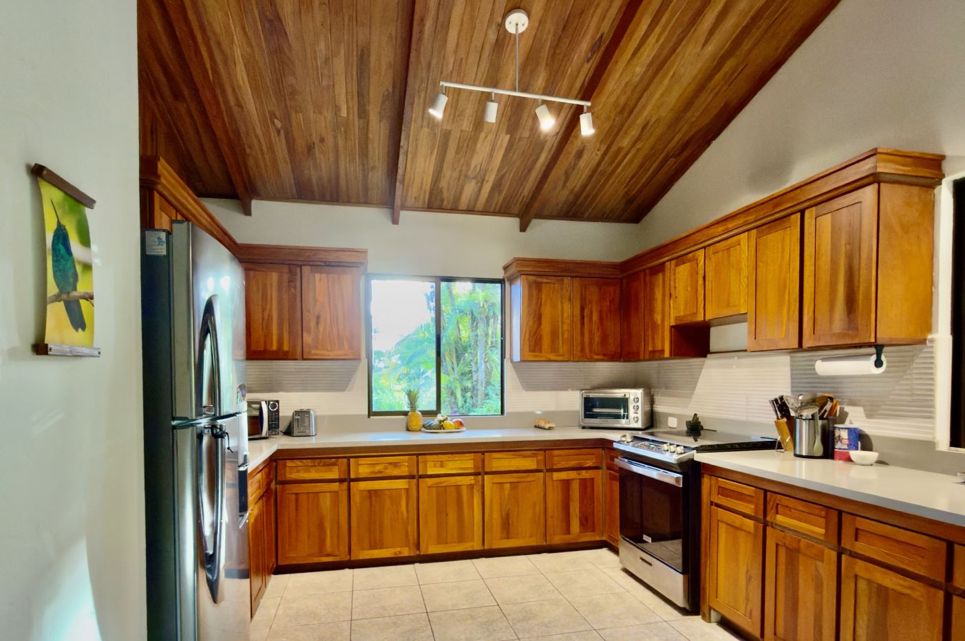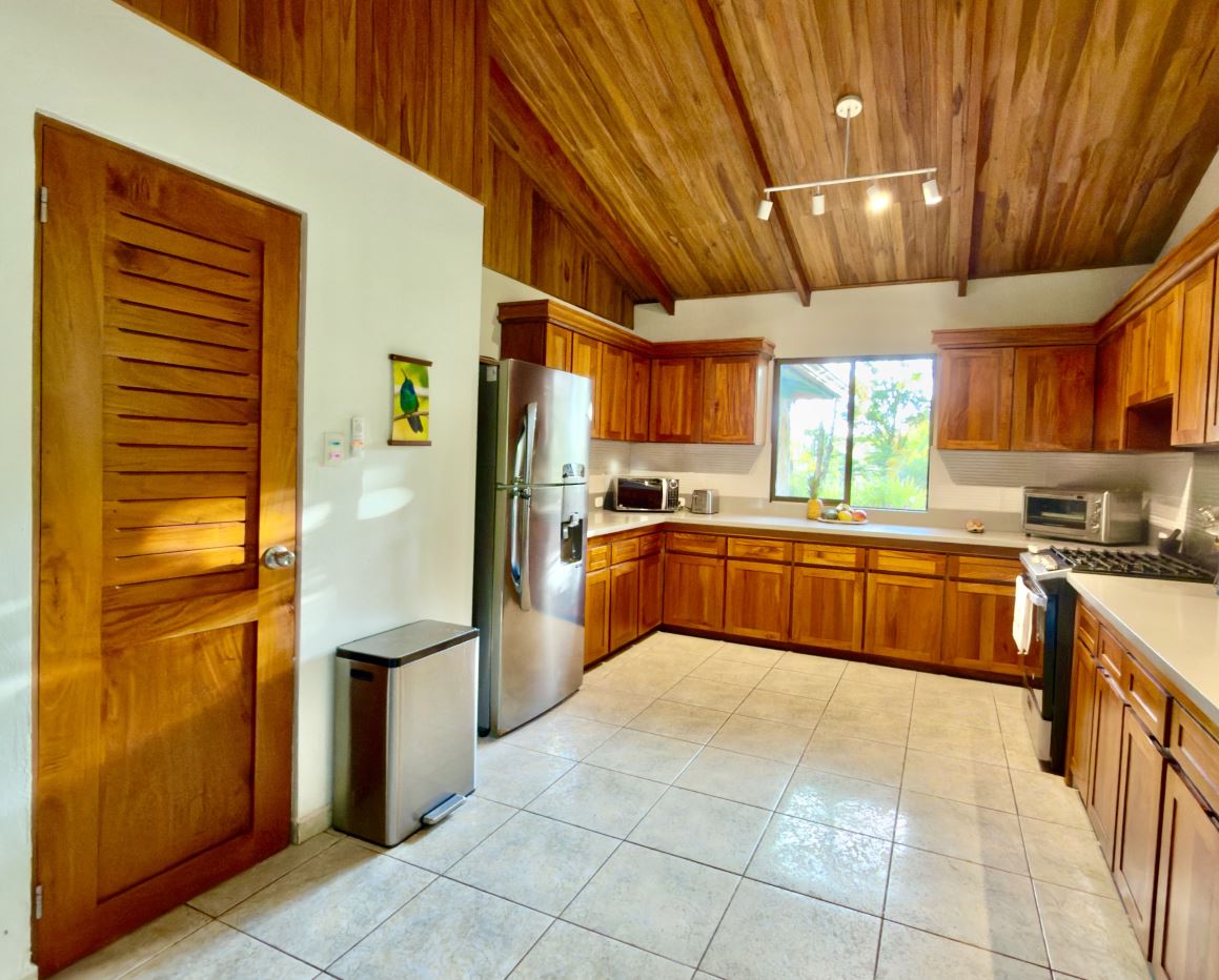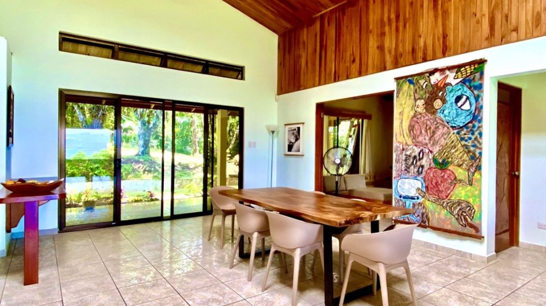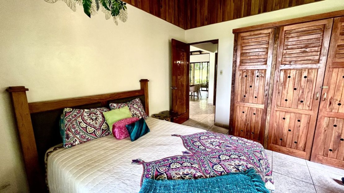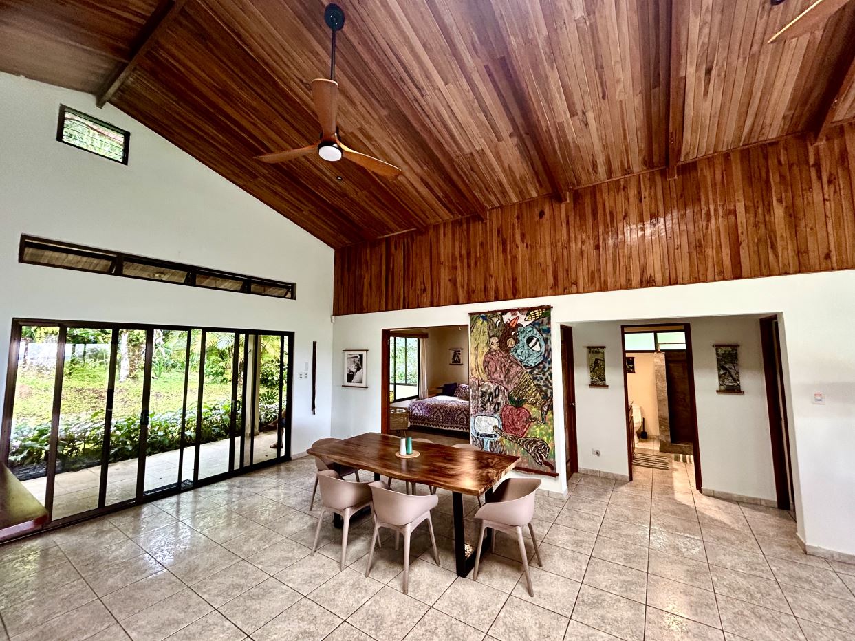 The home showcases an open-concept layout with thoughtful décor throughout and is tastefully furnished and offered for sale turnkey. There are several striking features of this home, most notably the 15-foot-high wood ceilings, which feature a living room skylight and define the main living and dining areas as the heart of the home. In addition, all doors are crafted from exotic wood and carved with designs specific to Costa Rican, adding warmth, character, and authentic local artistry. This central living space offers a strong sense of openness, natural light, and visual appeal, and flows seamlessly to covered terraces at both the front and rear, offering lake and volcano views to the front and a more secluded, tropical-inspired setting to the rear.