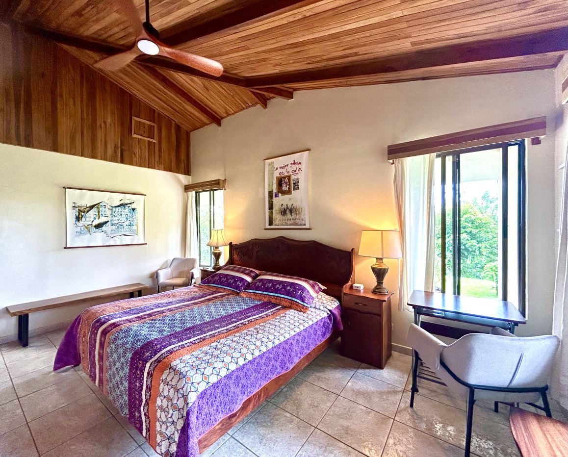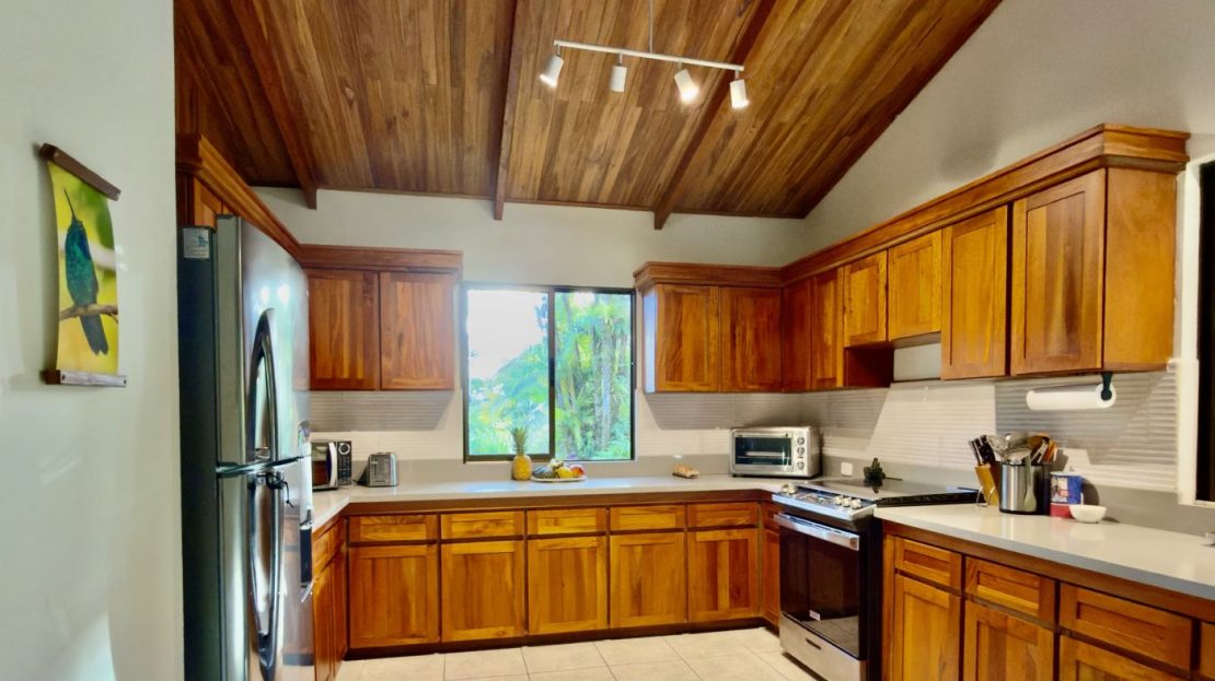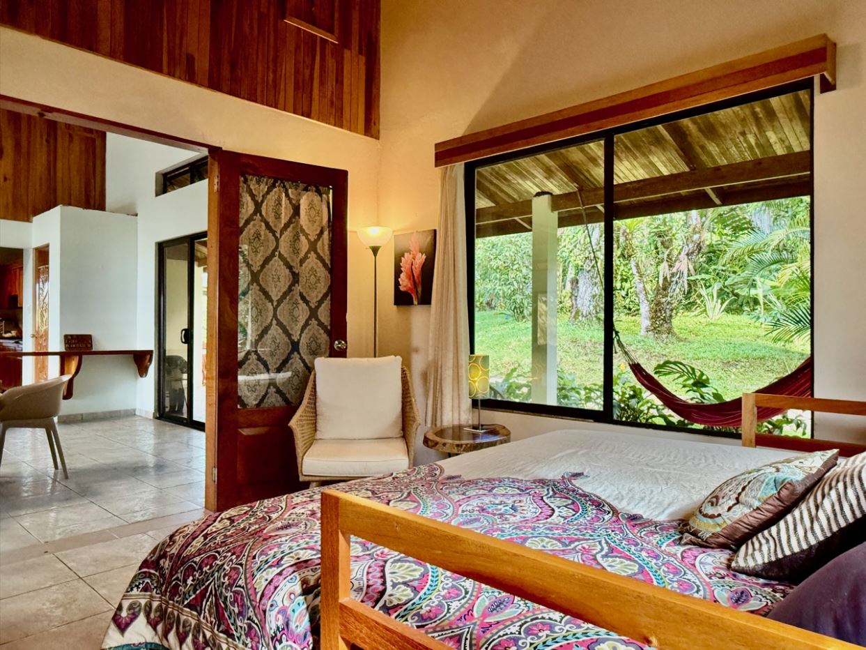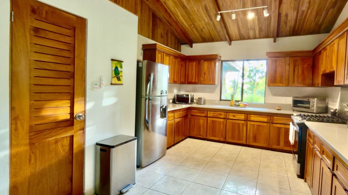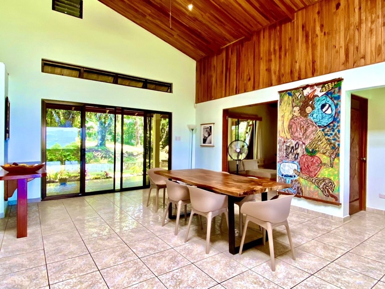The home showcases an open-concept layout with thoughtful décor throughout and is tastefully furnished and offered for sale turnkey. There are several striking features of this home, most notably the 15-foot-high wood ceilings, which feature a living room skylight and define the main living and dining areas as the heart of the home. In addition, all doors are crafted from exotic wood and carved with designs specific to Costa Rican, adding warmth, character, and authentic local artistry. This central living space offers a strong sense of openness, natural light, and visual appeal, and flows seamlessly to covered terraces at both the front and rear, offering lake and volcano views to the front and a more secluded, tropical-inspired setting to the rear.