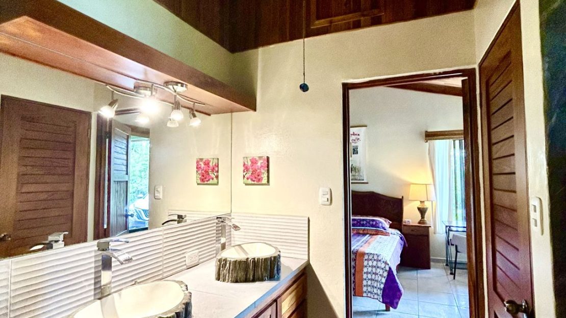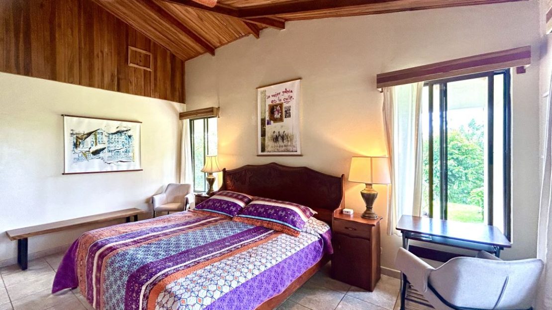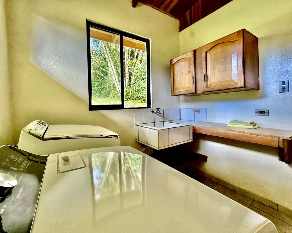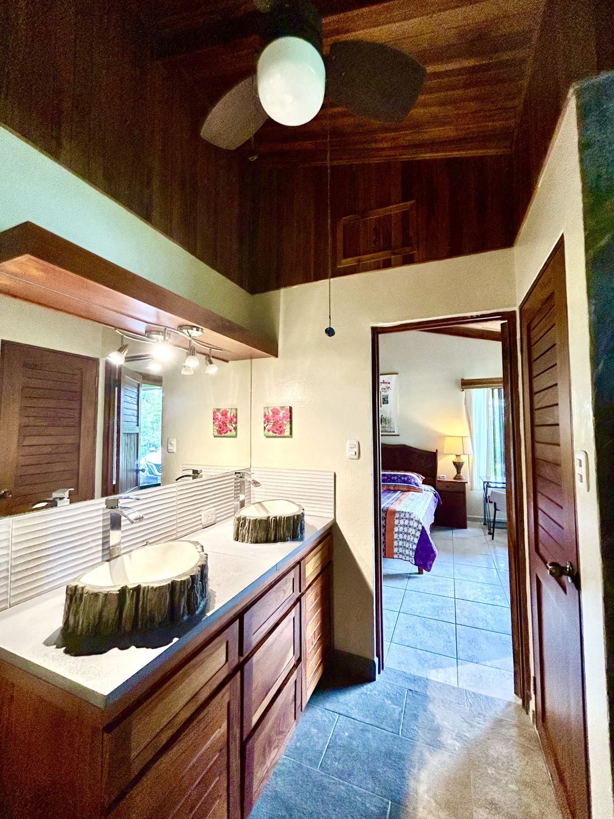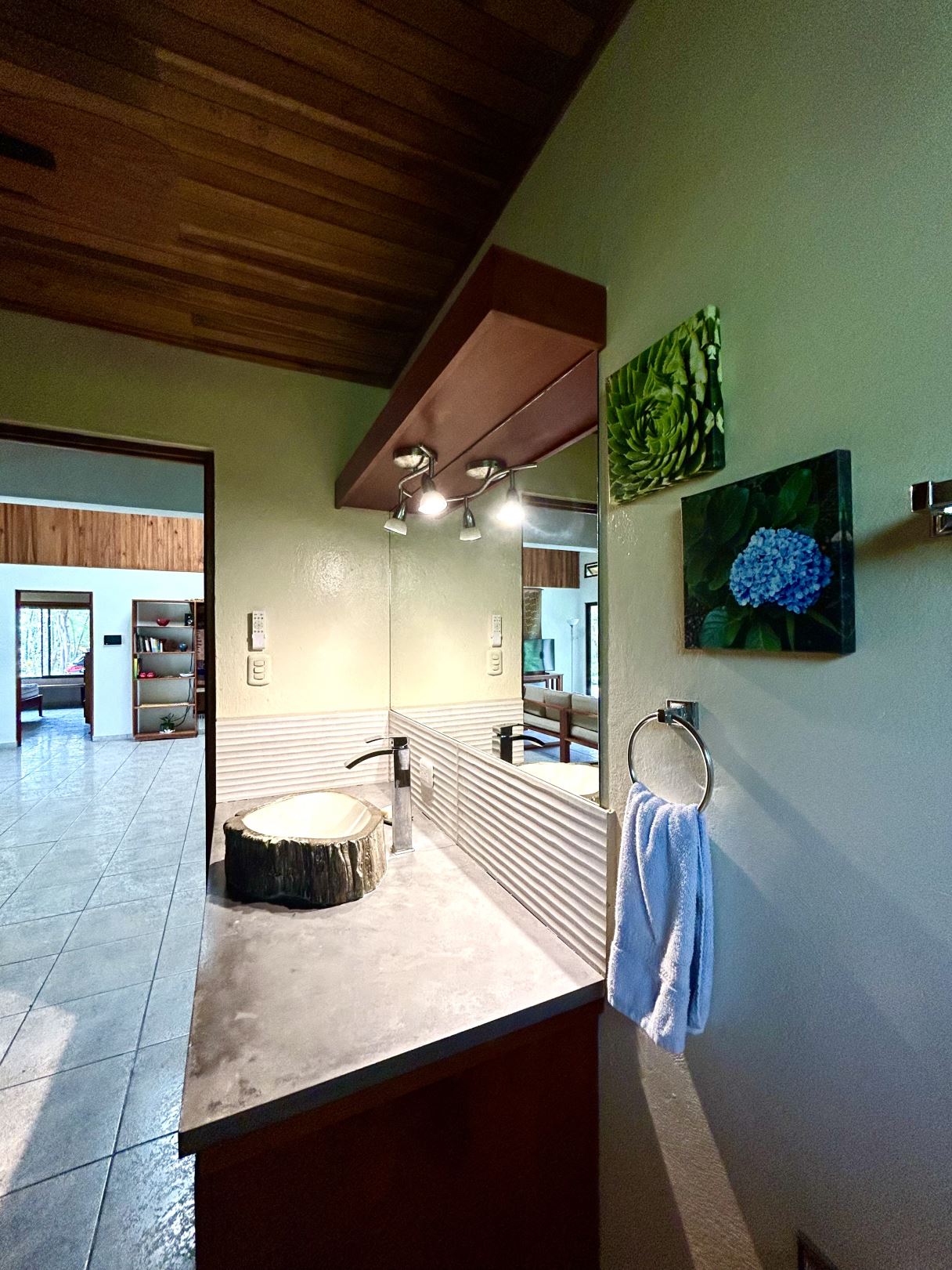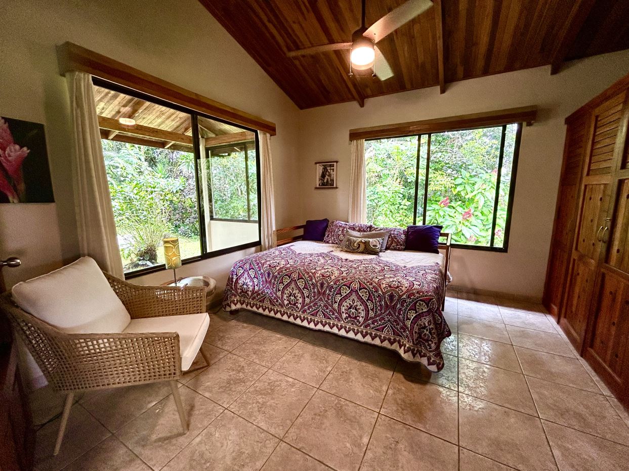 The home showcases an open-concept layout with thoughtful décor throughout and is tastefully furnished and offered for sale turnkey. There are several striking features of this home, most notably the 15-foot-high wood ceilings, which feature a living room skylight and define the main living and dining areas as the heart of the home. In addition, all doors are crafted from exotic wood and carved with designs specific to Costa Rican, adding warmth, character, and authentic local artistry. This central living space offers a strong sense of openness, natural light, and visual appeal, and flows seamlessly to covered terraces at both the front and rear, offering lake and volcano views to the front and a more secluded, tropical-inspired setting to the rear.