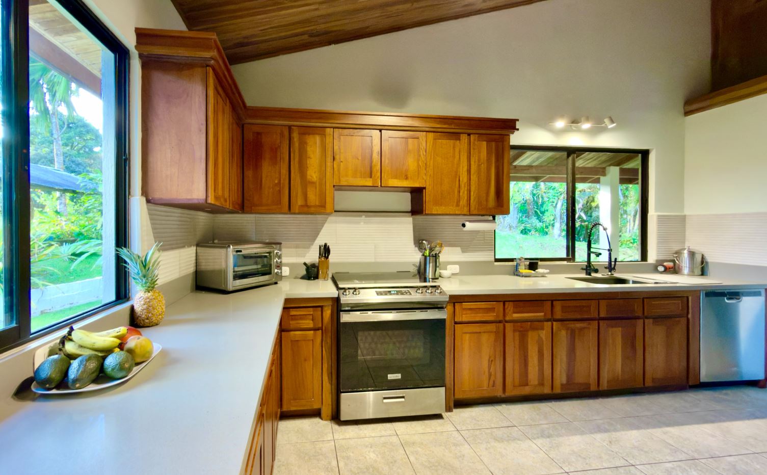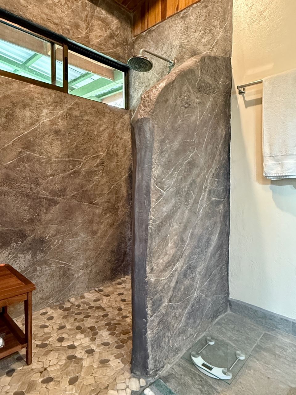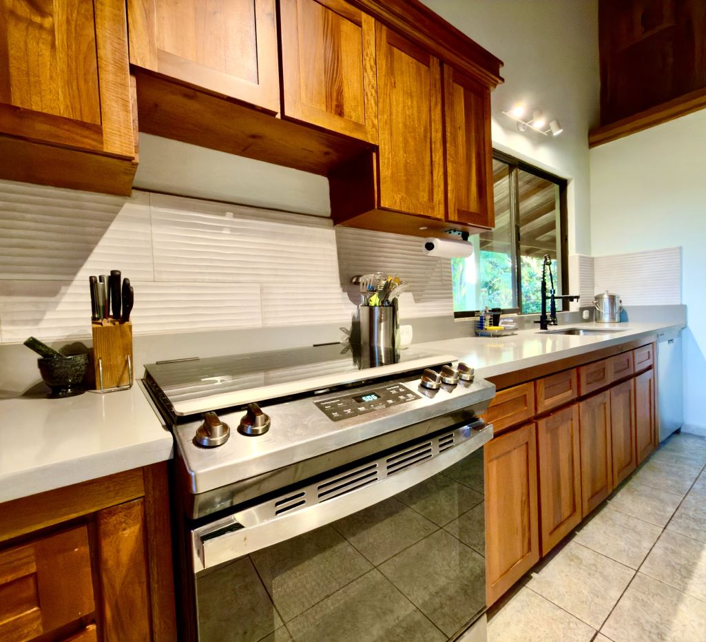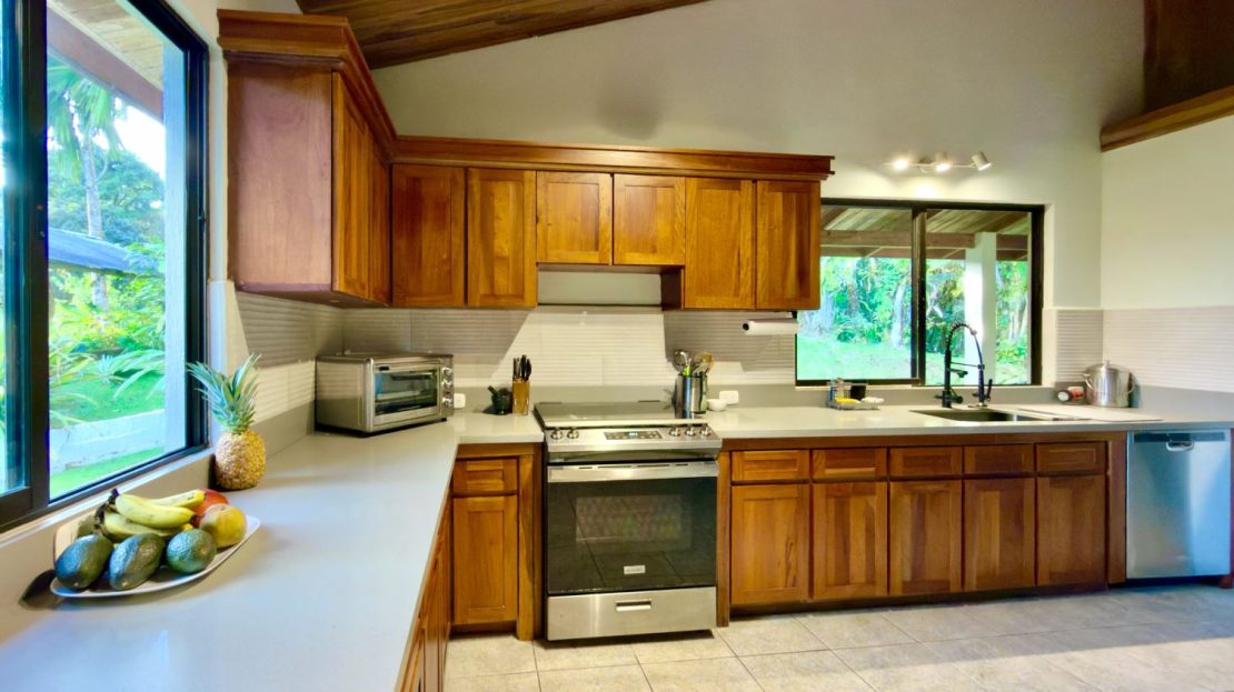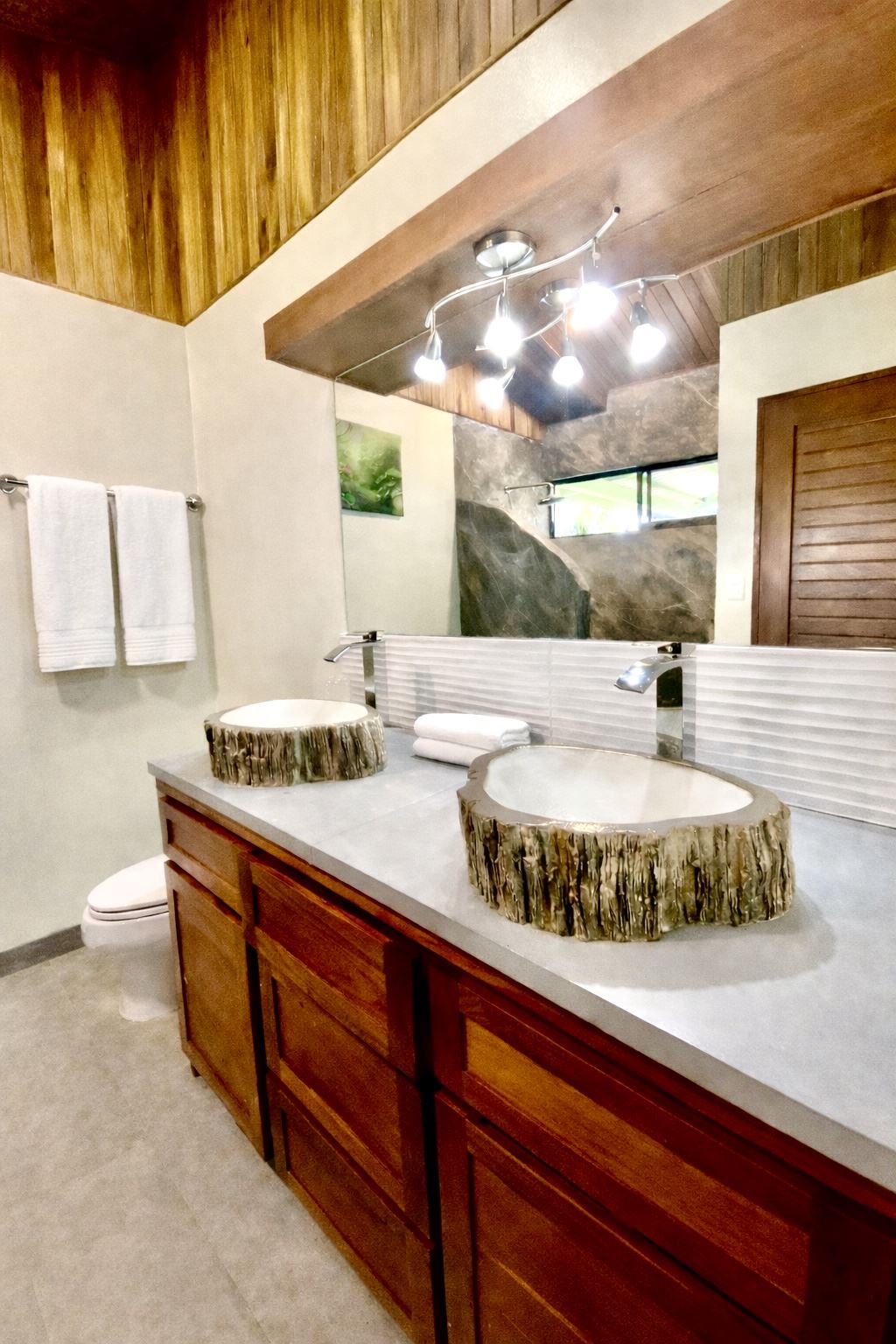 The home showcases an open-concept layout with thoughtful décor throughout and is tastefully furnished and offered for sale turnkey. There are several striking features of this home, most notably the 15-foot-high wood ceilings, which feature a living room skylight and define the main living and dining areas as the heart of the home. In addition, all doors are crafted from exotic wood and carved with designs specific to Costa Rican, adding warmth, character, and authentic local artistry. This central living space offers a strong sense of openness, natural light, and visual appeal, and flows seamlessly to covered terraces at both the front and rear, offering lake and volcano views to the front and a more secluded, tropical-inspired setting to the rear.
