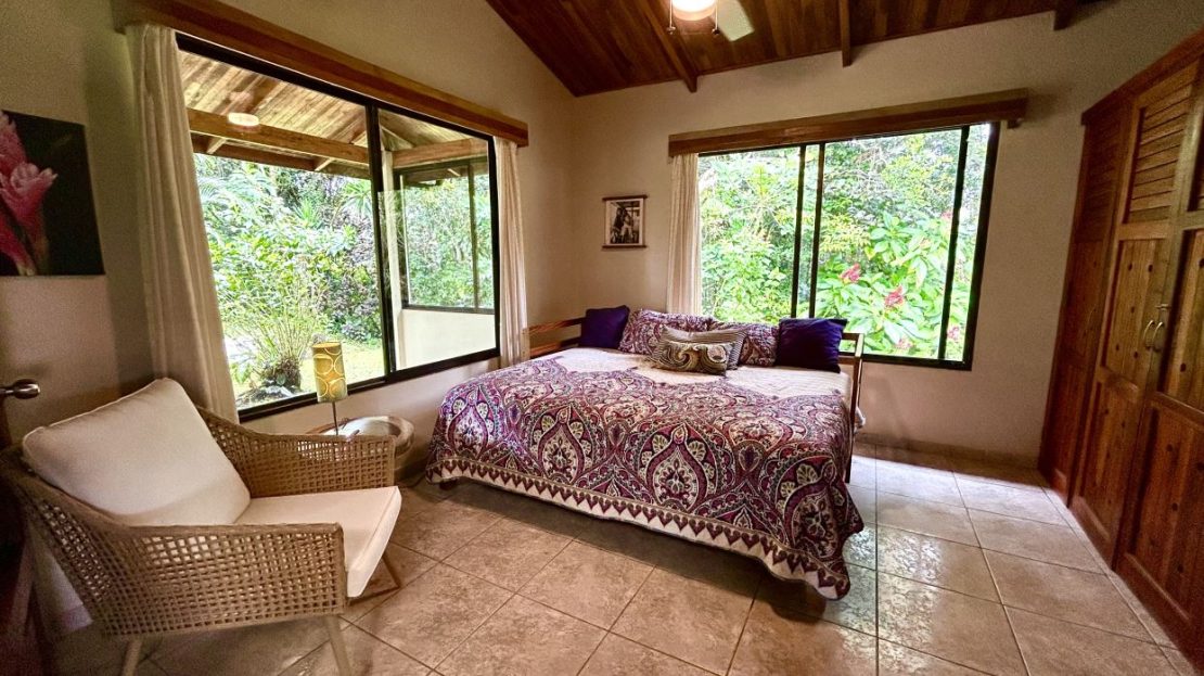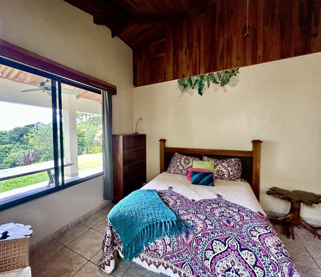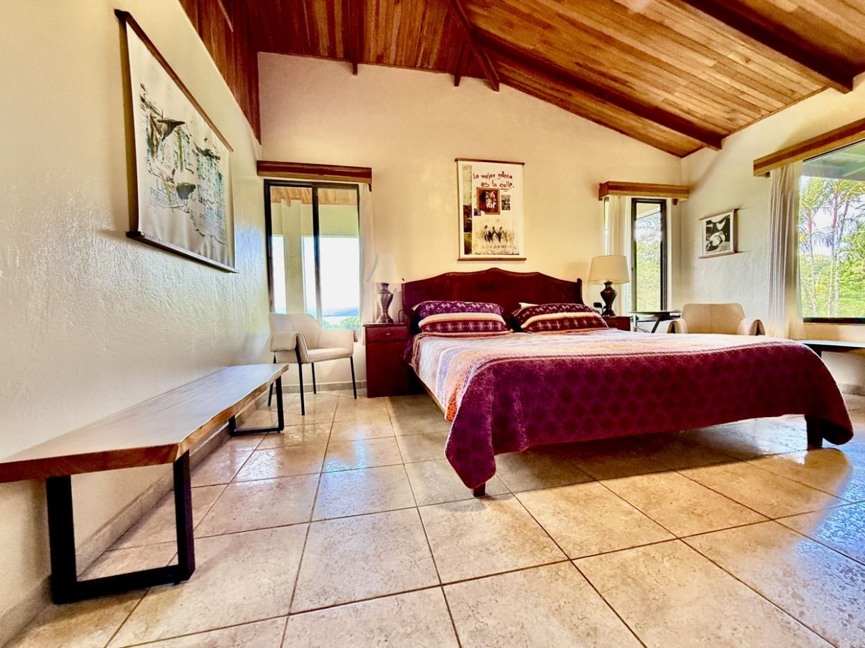 The main living area enjoys expansive views of the gardens and beyond to the rolling hills of Lake Arenal, with stunning sunrise and sunset vistas that create a true wow factor. The covered terrace is seamlessly accessed from the living area, extending the home’s indoor–outdoor flow. Very few homes offer views of this caliber, encompassing the Lake Arenal, surrounding mountains, and the Arenal Volcano, and extending in the distance toward Monteverde, an element that truly sets this home apart.