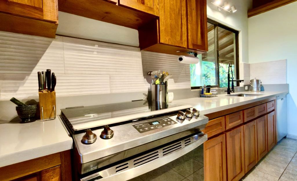 The generously sized kitchen, conveniently located adjacent to the dining room, is finished with exotic wood cabinetry, quartz countertops, and generous workspace. It features a breakfast bar, quality appliances including a refrigerator, gas stove, and dishwasher, multiple large pantries, and large picture windows overlooking the gardens and nearby rancho, which functions as an outdoor kitchen and entertaining area and has the convenience of a bathroom.
