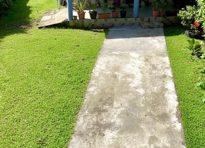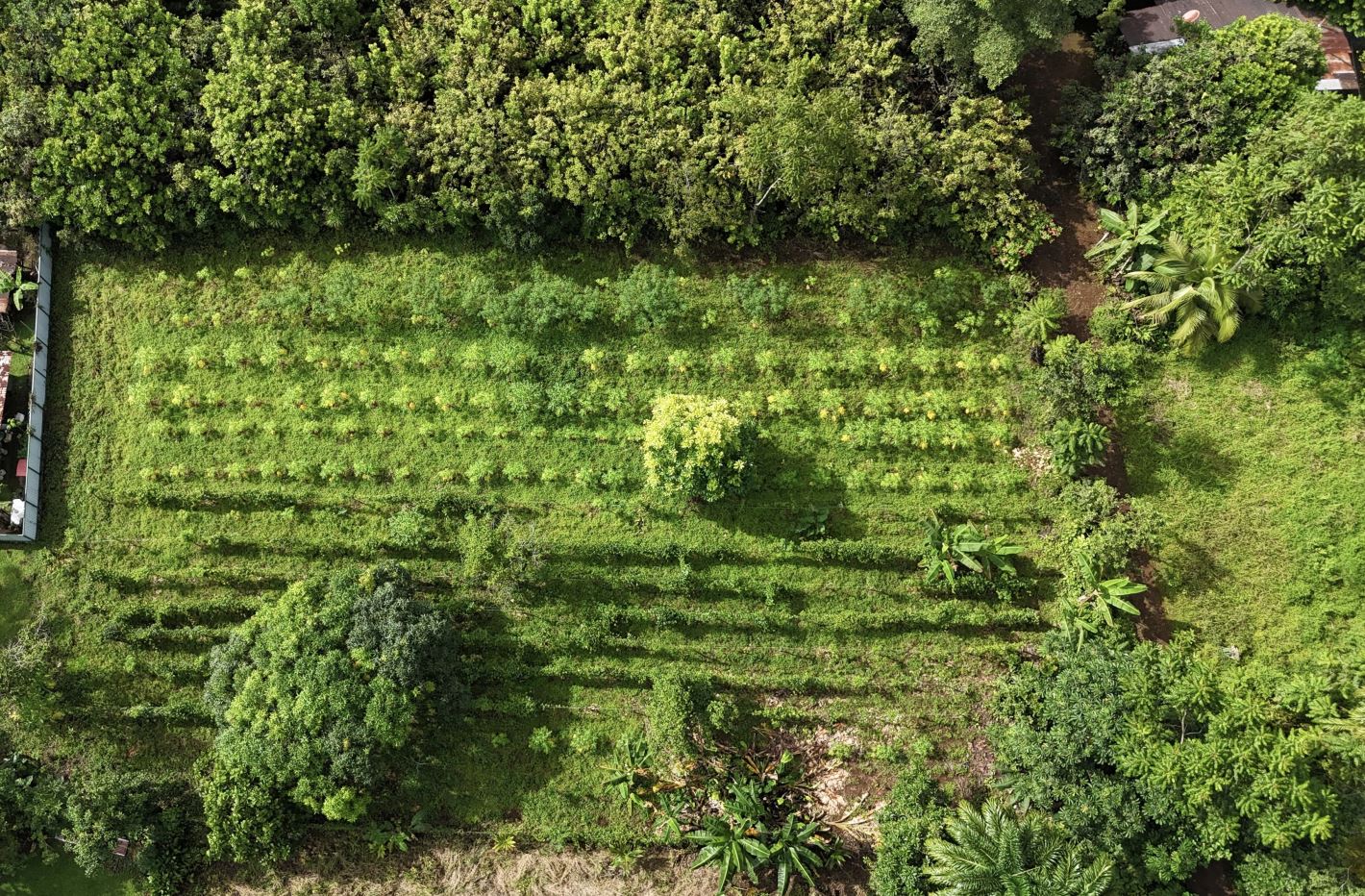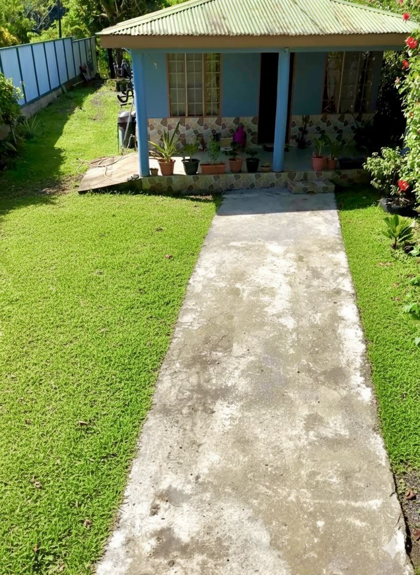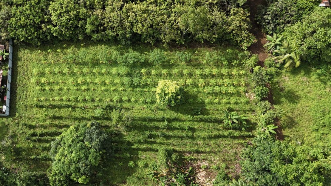The home includes 2 bedrooms, 1 full bathroom, and a spacious living room, surrounded by lush tropical vegetation. The highlight is the expansive 5,900 m² lot, rich in fertile soil and an abundance of mature fruit trees, including tropical varieties that allow you to enjoy fresh produce straight from your own land.