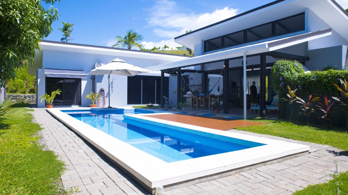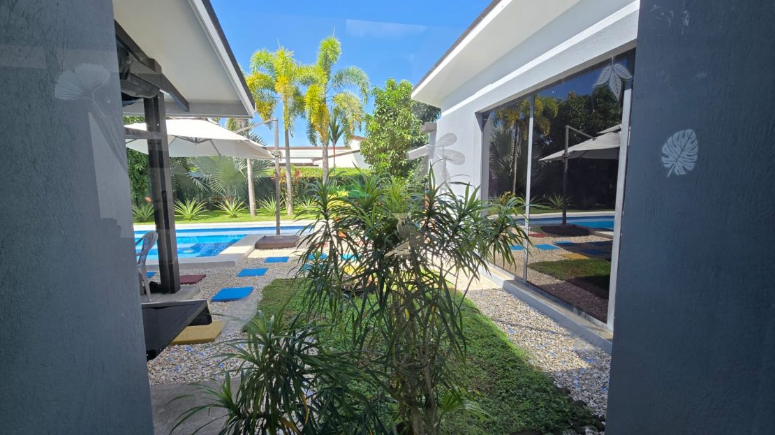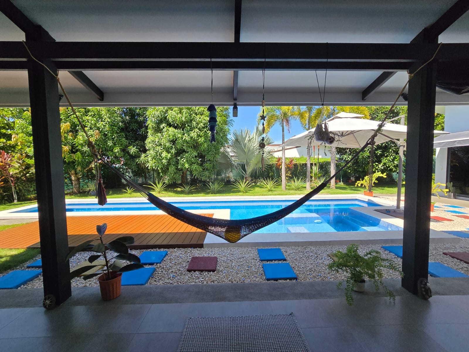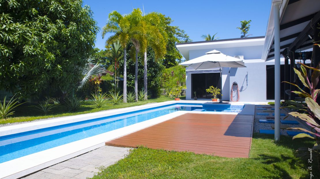 Stepping outside, you’ll find a landscaped garden, a sparkling lap pool, and a covered patio that extends the home’s living space. These areas create an inviting environment for relaxing, hosting gatherings, or enjoying quiet mornings. Walking trails near the property wind through tropical surroundings, and it’s common to spot wildlife such as monkeys, sloths, and parrots.