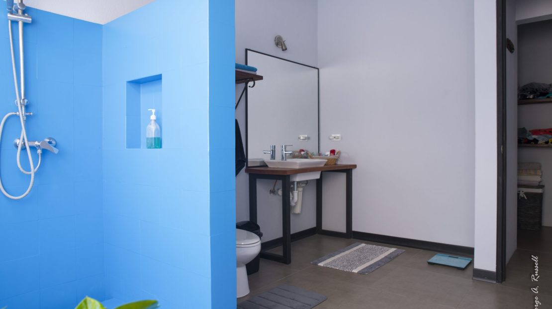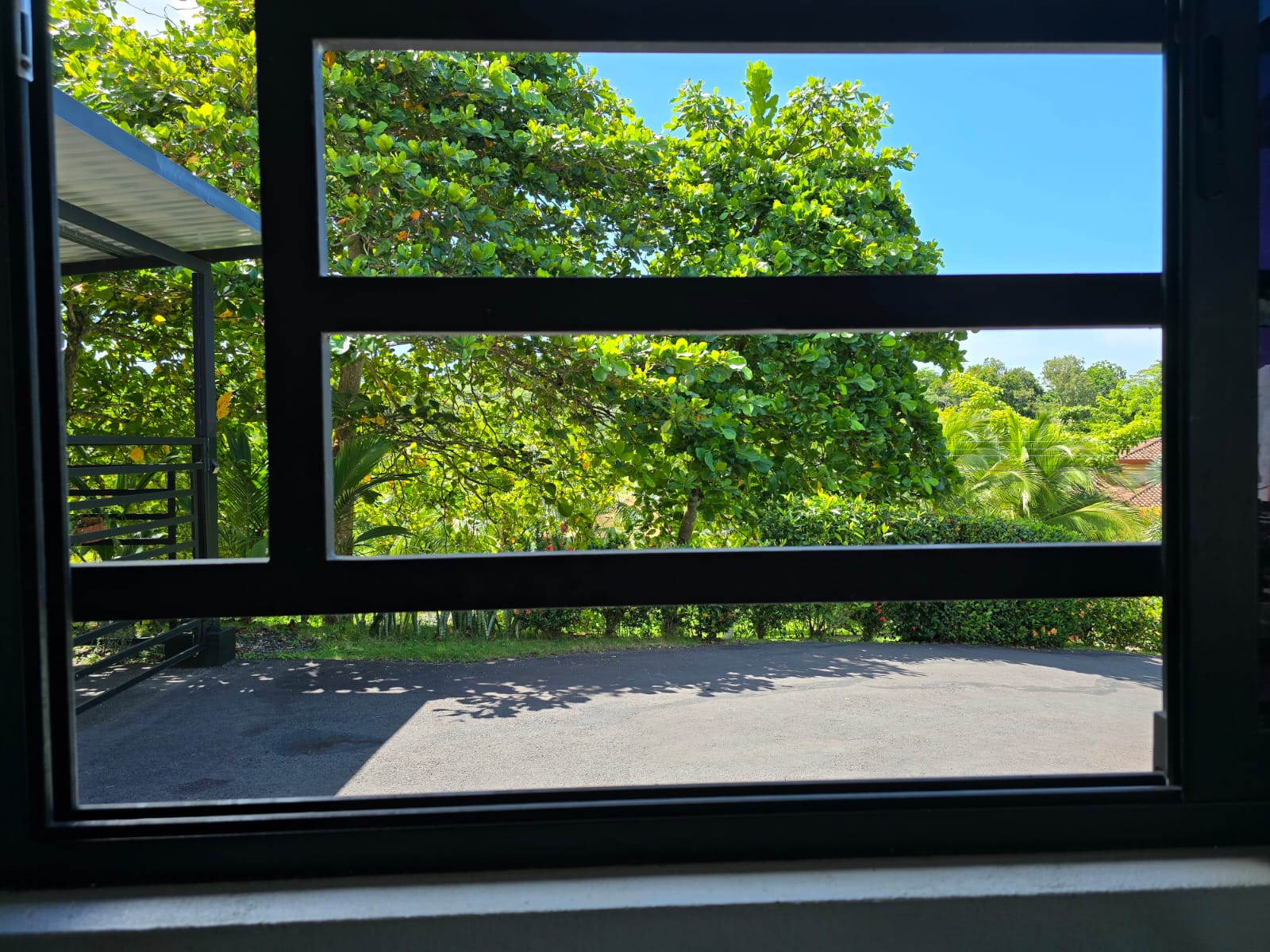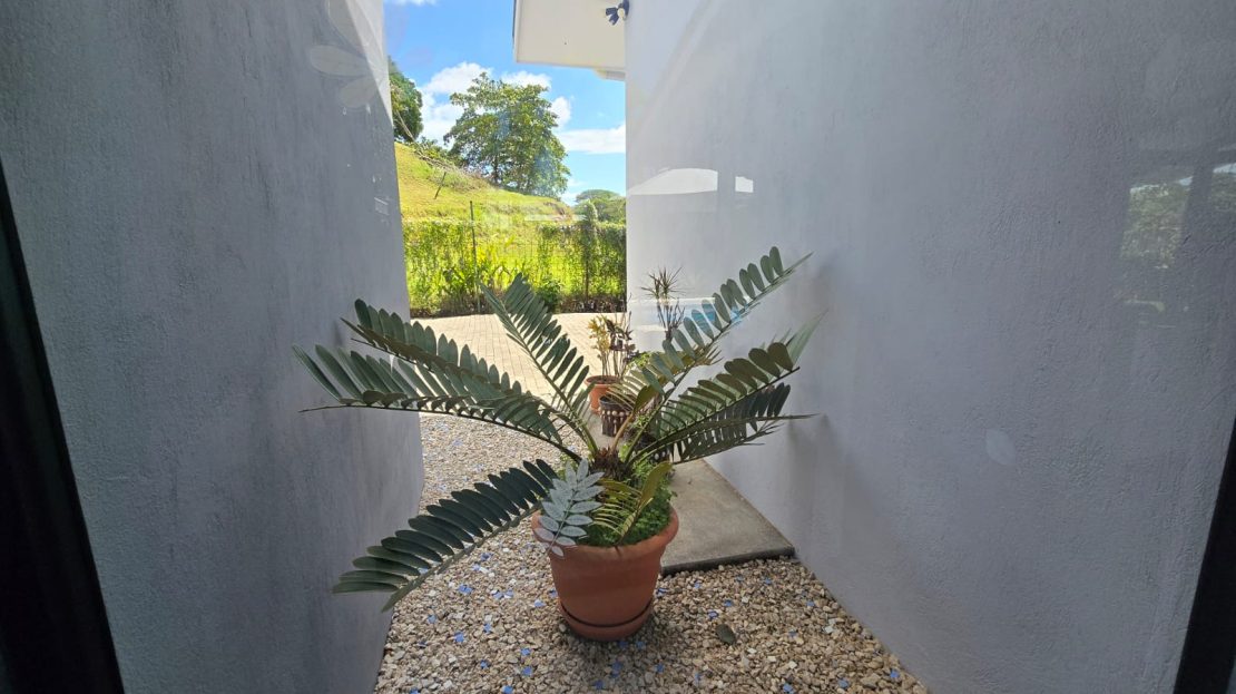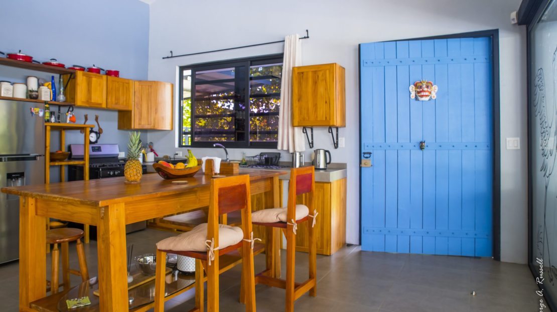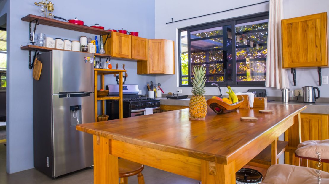 Stepping outside, you’ll find a landscaped garden, a sparkling lap pool, and a covered patio that extends the home’s living space. These areas create an inviting environment for relaxing, hosting gatherings, or enjoying quiet mornings. Walking trails near the property wind through tropical surroundings, and it’s common to spot wildlife such as monkeys, sloths, and parrots.