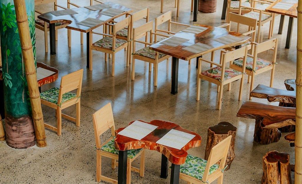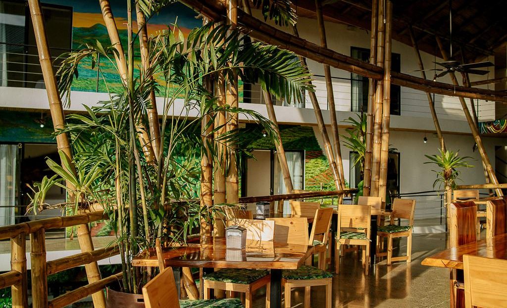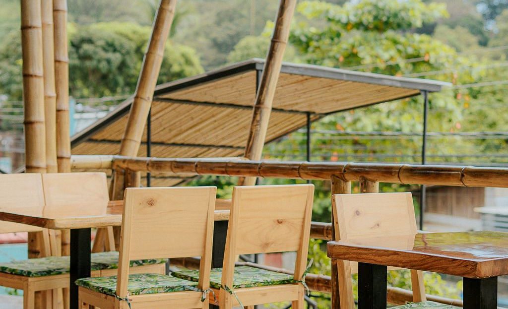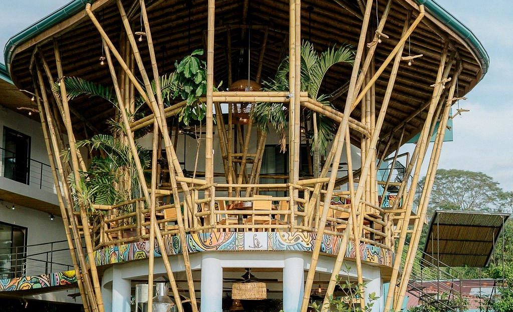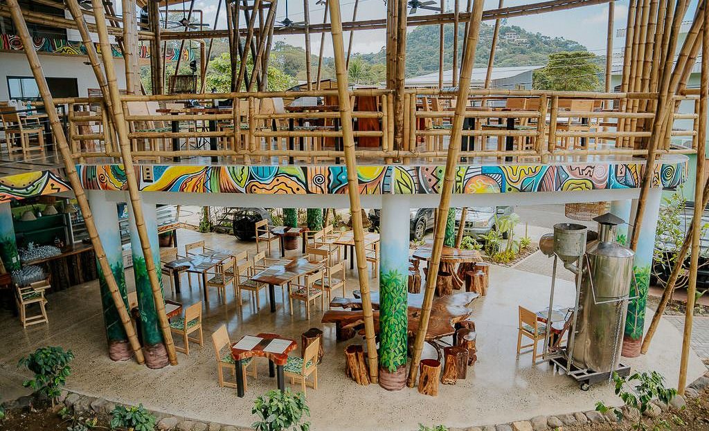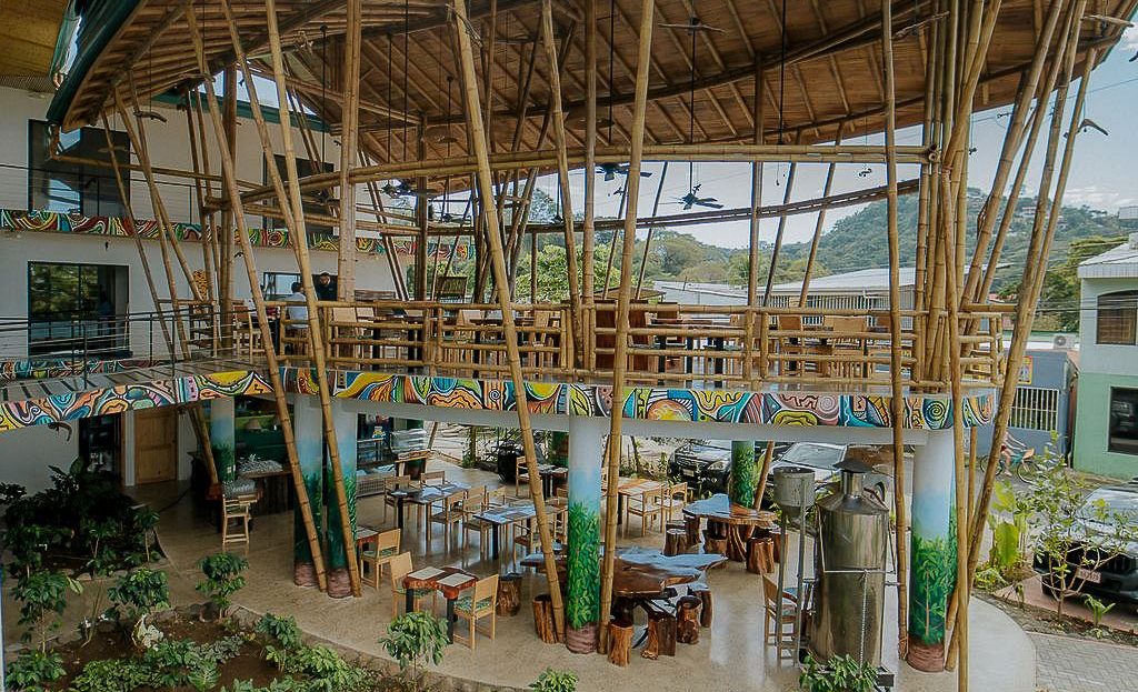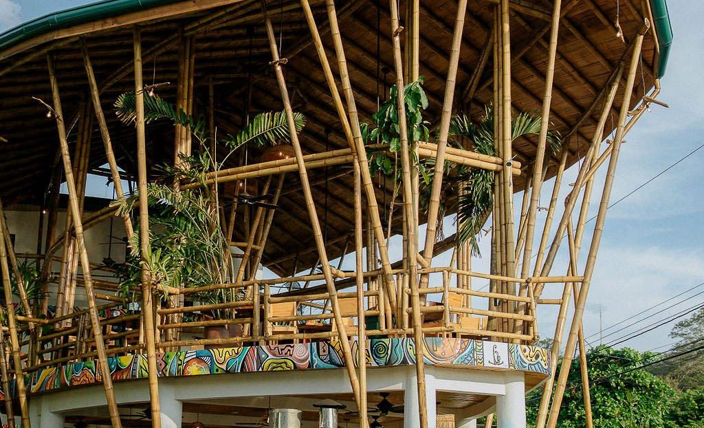 Café/restaurante de bambú de 2 pisos, construido con materiales locales