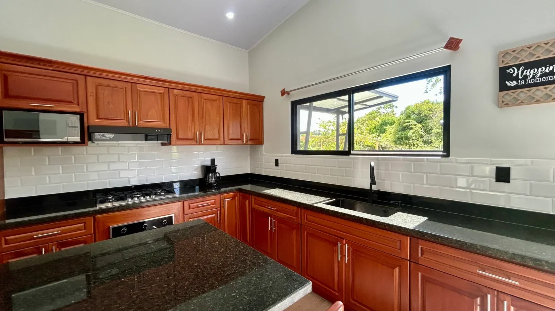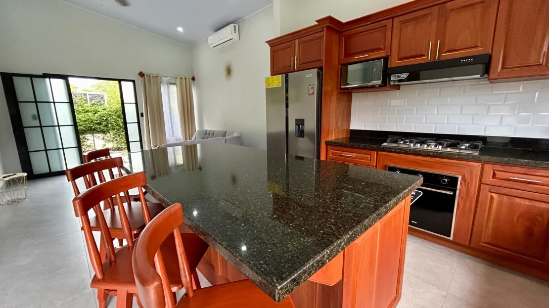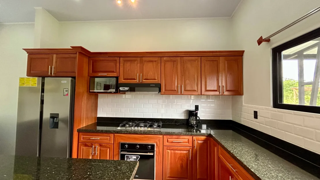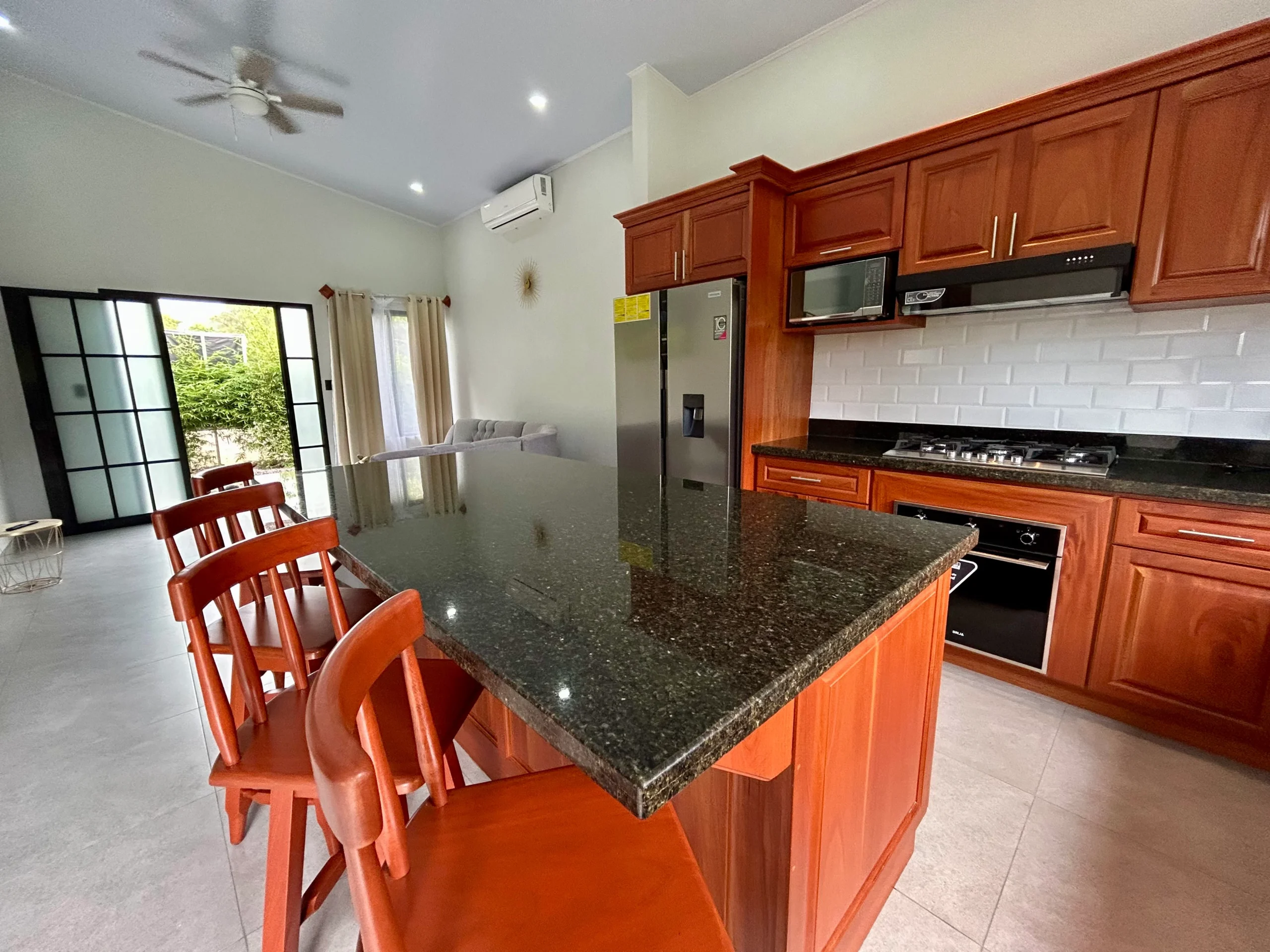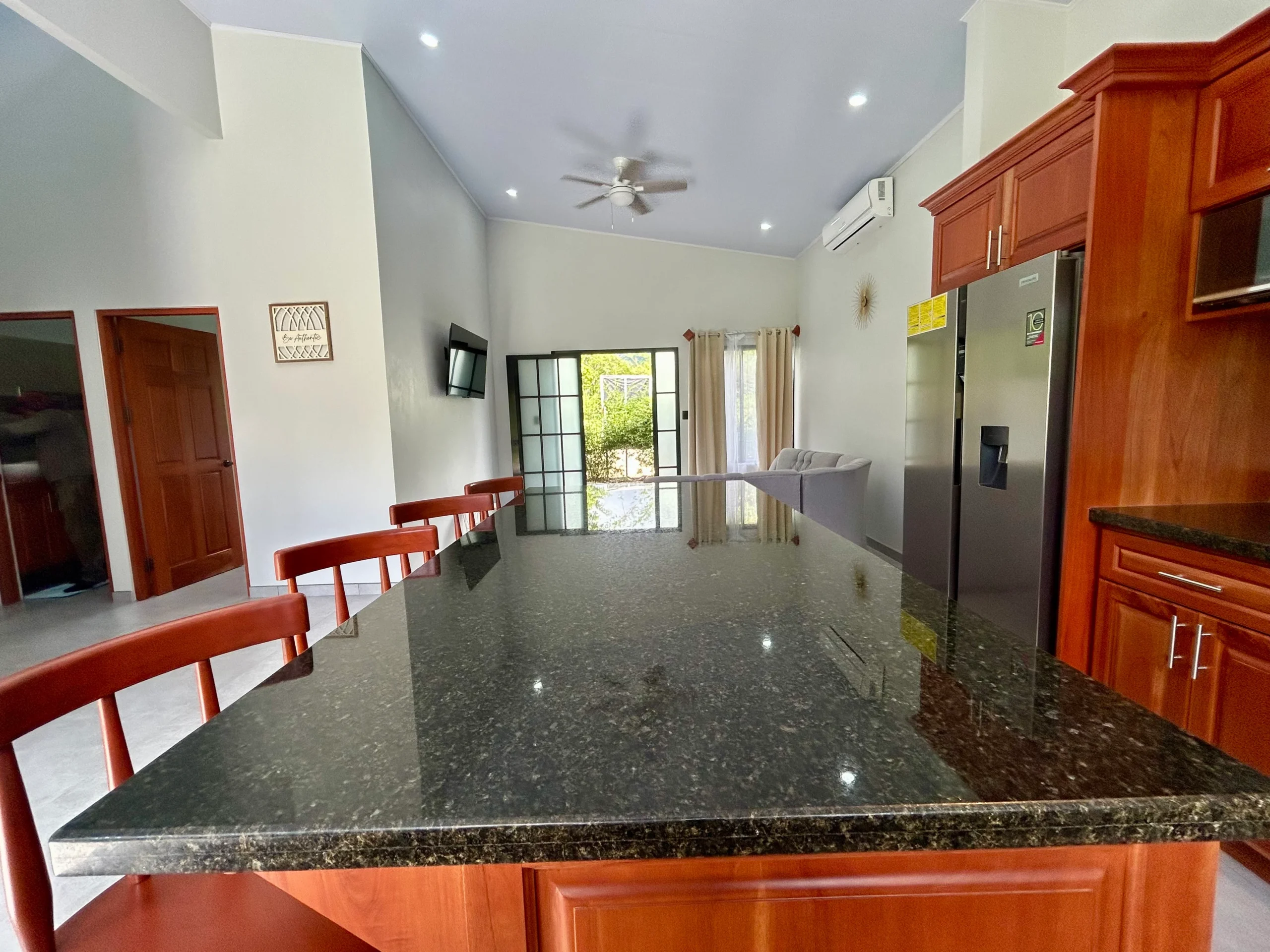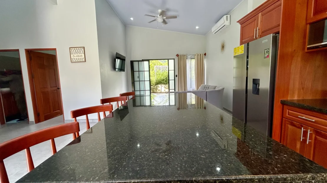 Upon arriving at the house, a welcoming parking area for up to two cars greets you. Lush green tropical gardens surround the house, and crafted wooden accents guide you to the fully furnished living room area. It’s ready for you and your family to spend quality time while preparing delicious meals in the spacious kitchen. The kitchen boasts elegant quartz countertops, cabinets, and all the necessary home appliances for perfect living. A handcrafted wooden dining table from Costa Rica divides the kitchen and living room, adding an elegant touch to your home.