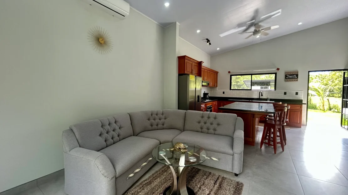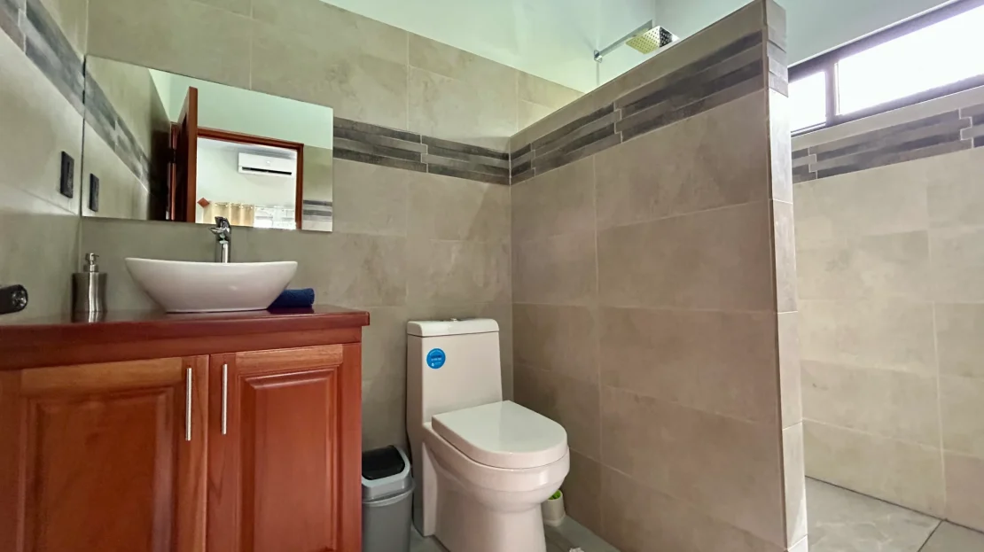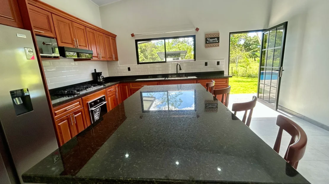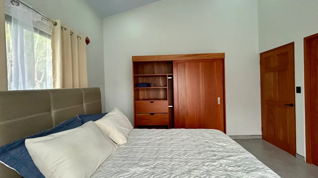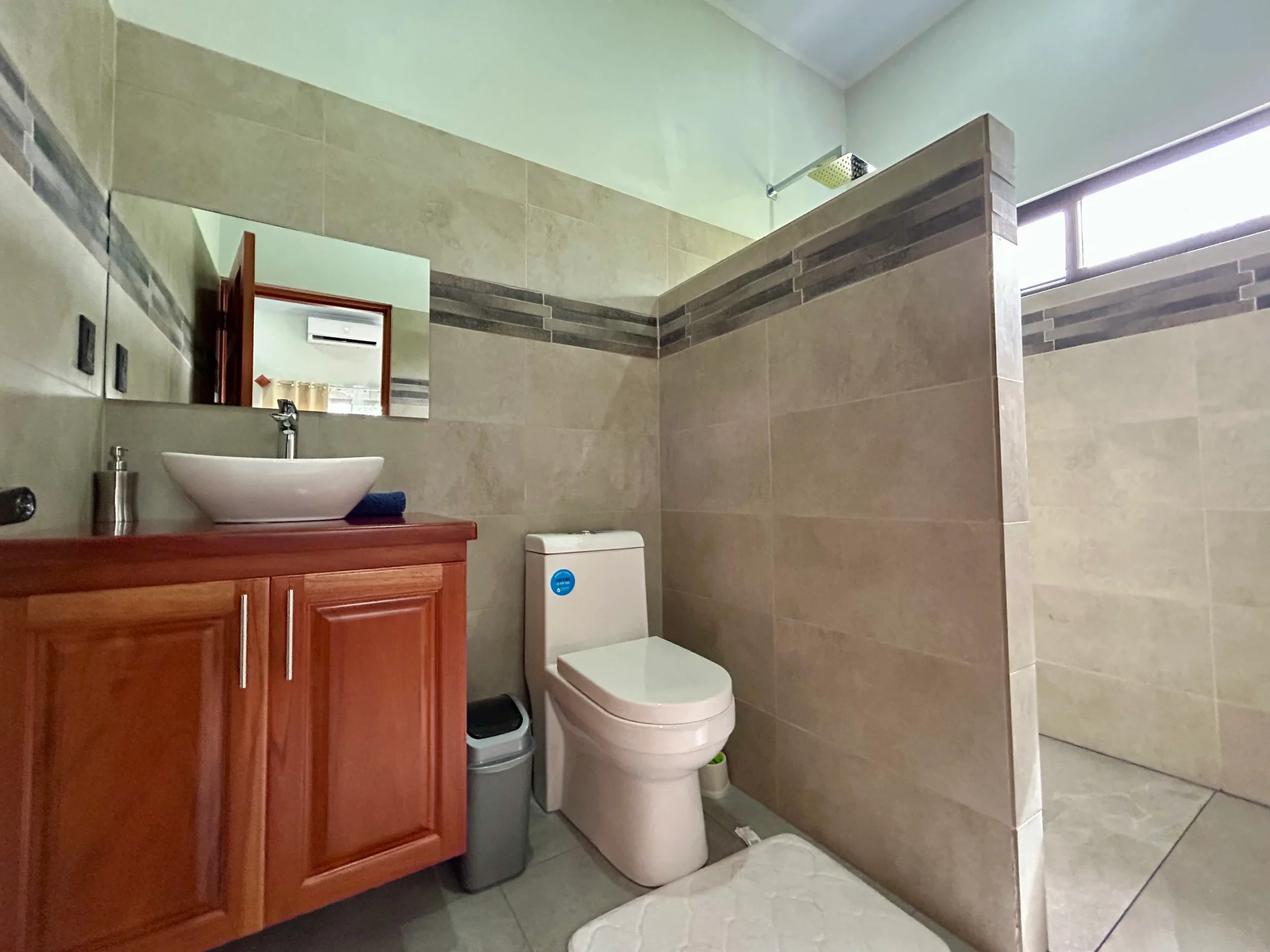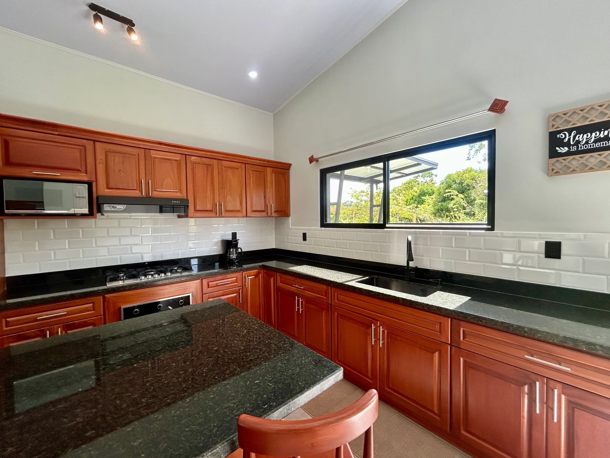 Upon arriving at the house, a welcoming parking area for up to two cars greets you. Lush green tropical gardens surround the house, and crafted wooden accents guide you to the fully furnished living room area. It’s ready for you and your family to spend quality time while preparing delicious meals in the spacious kitchen. The kitchen boasts elegant quartz countertops, cabinets, and all the necessary home appliances for perfect living. A handcrafted wooden dining table from Costa Rica divides the kitchen and living room, adding an elegant touch to your home.