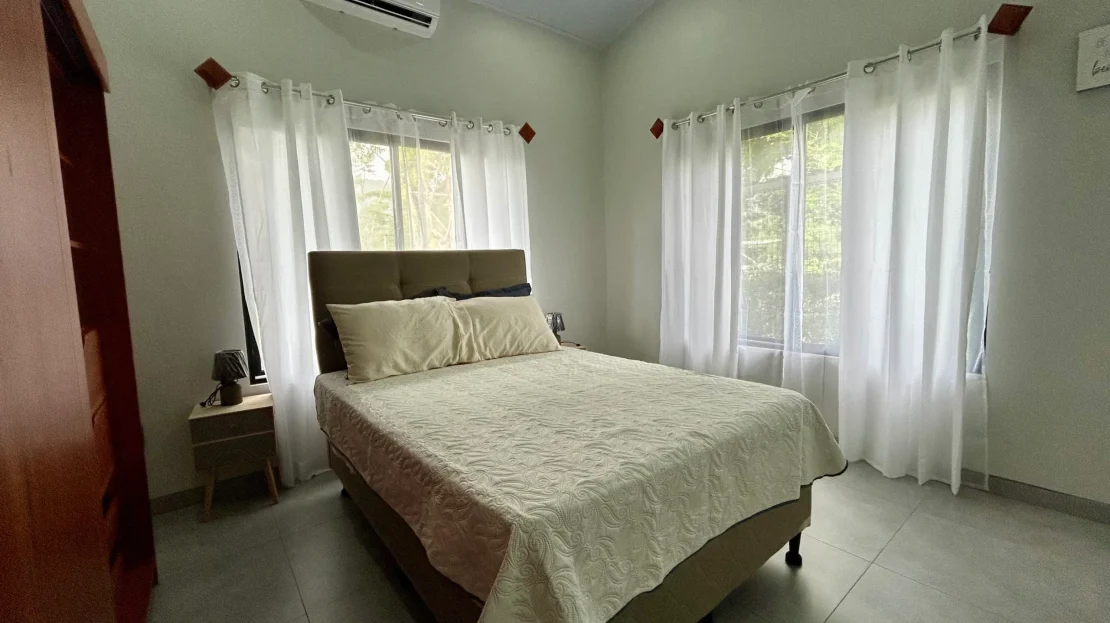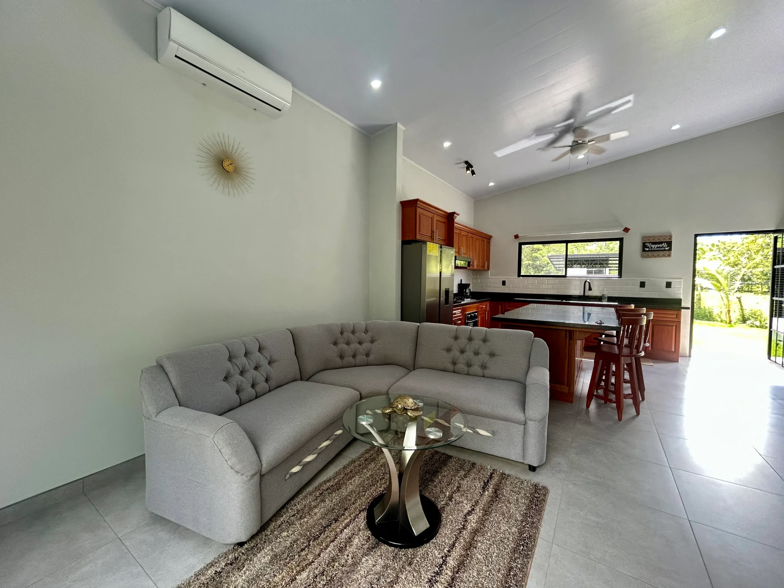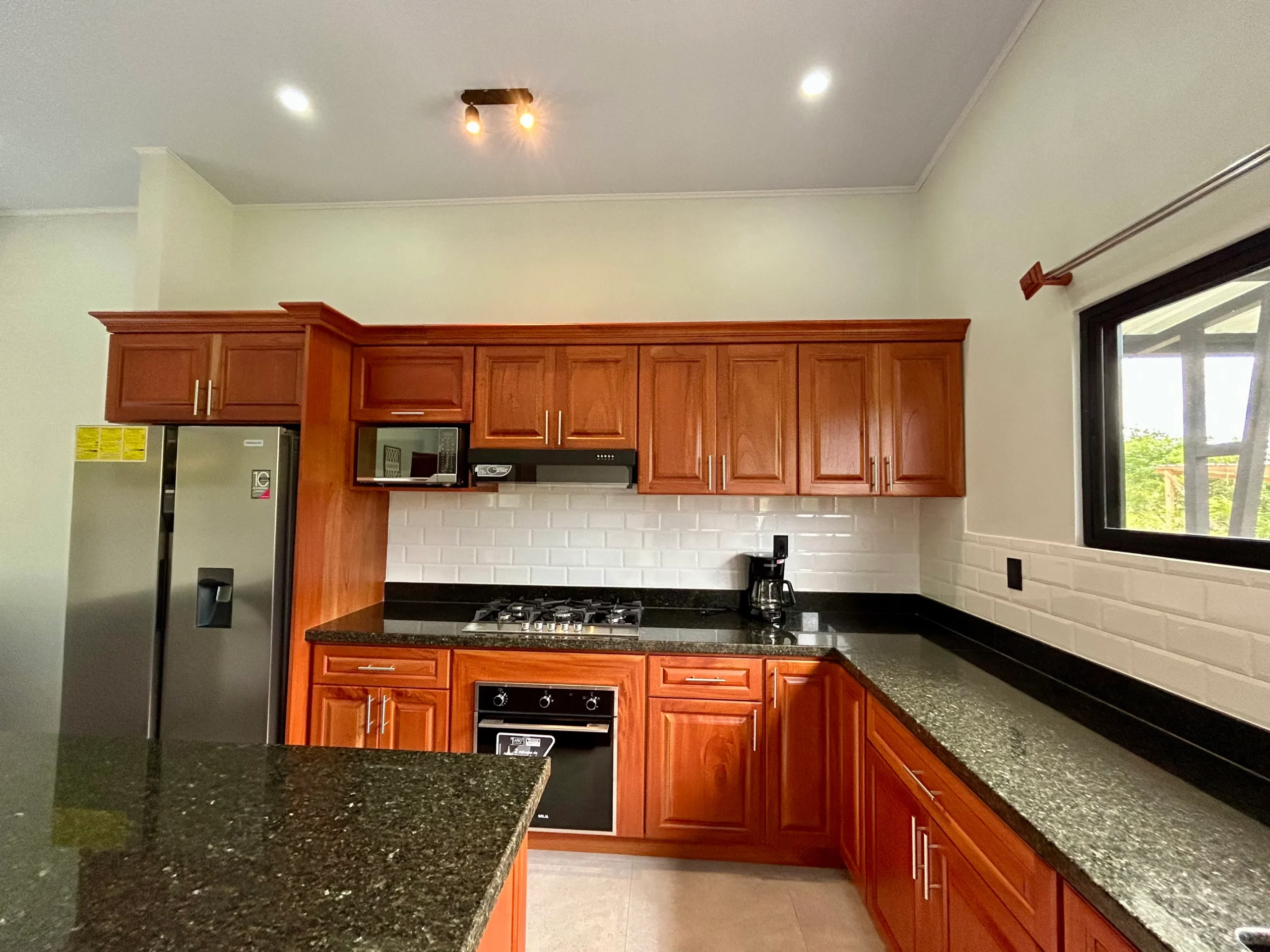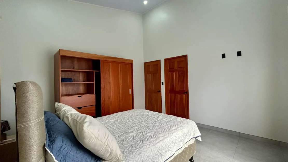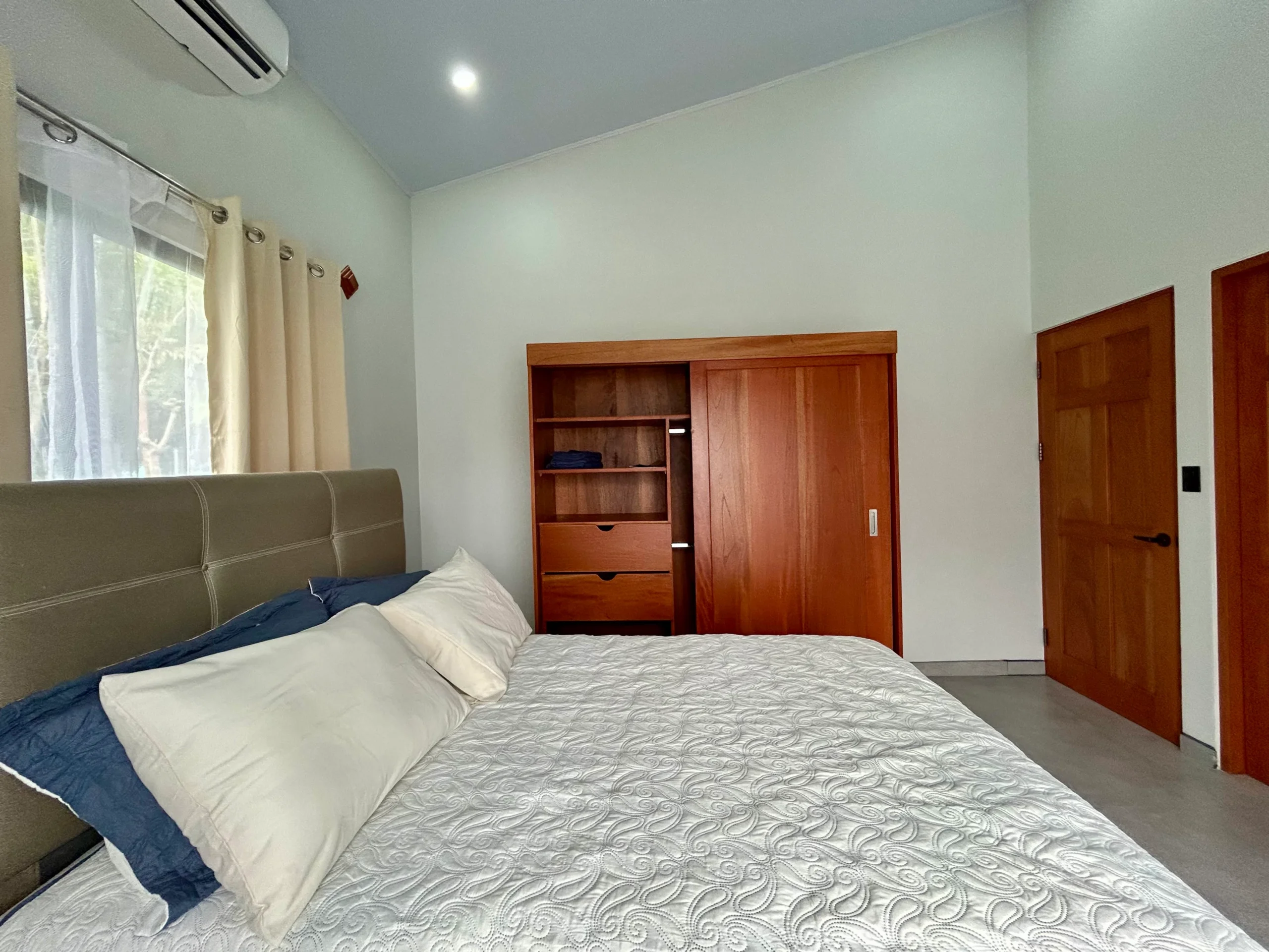 Upon arriving at the house, a welcoming parking area for up to two cars greets you. Lush green tropical gardens surround the house, and crafted wooden accents guide you to the fully furnished living room area. It’s ready for you and your family to spend quality time while preparing delicious meals in the spacious kitchen. The kitchen boasts elegant quartz countertops, cabinets, and all the necessary home appliances for perfect living. A handcrafted wooden dining table from Costa Rica divides the kitchen and living room, adding an elegant touch to your home.
