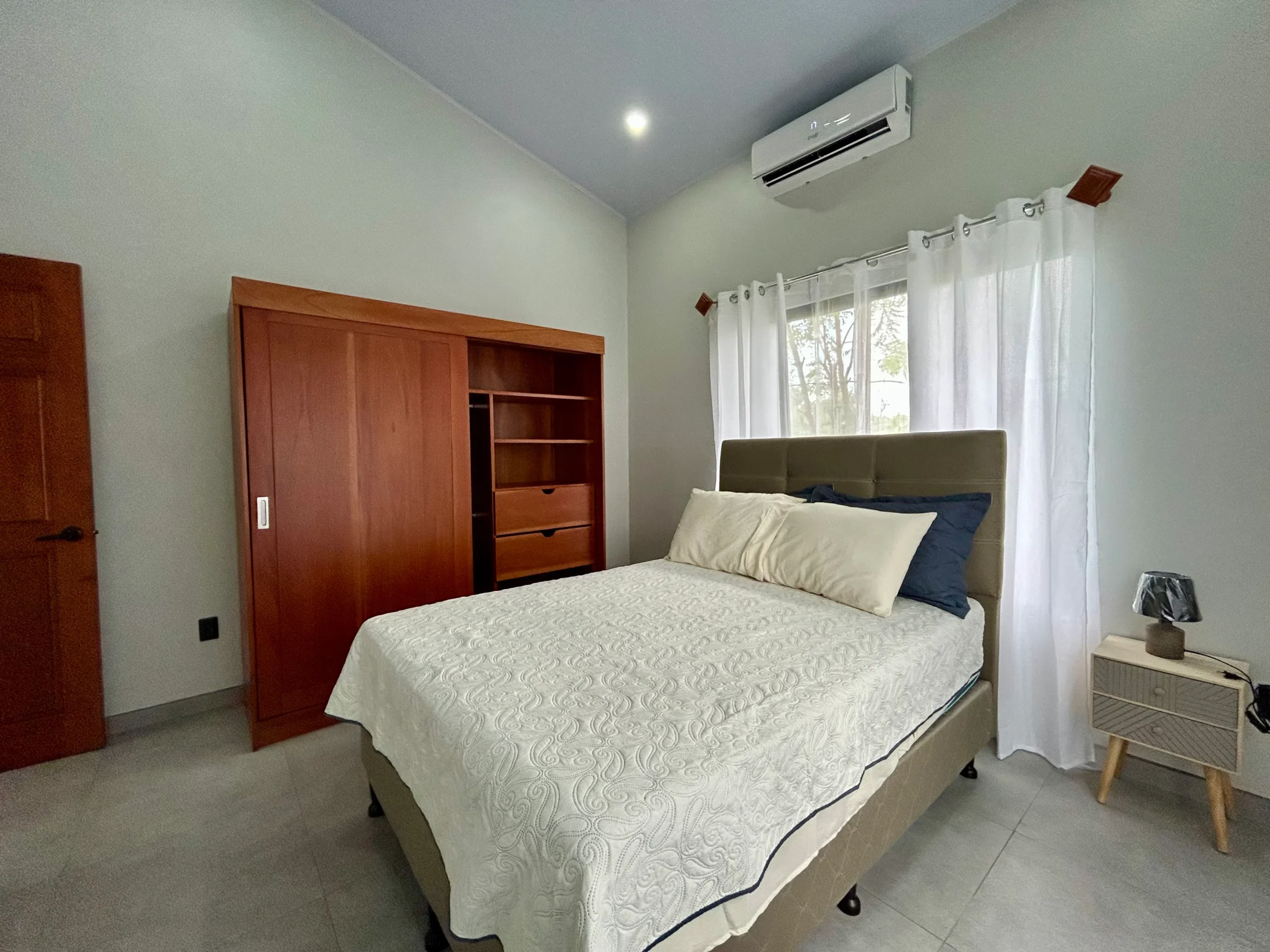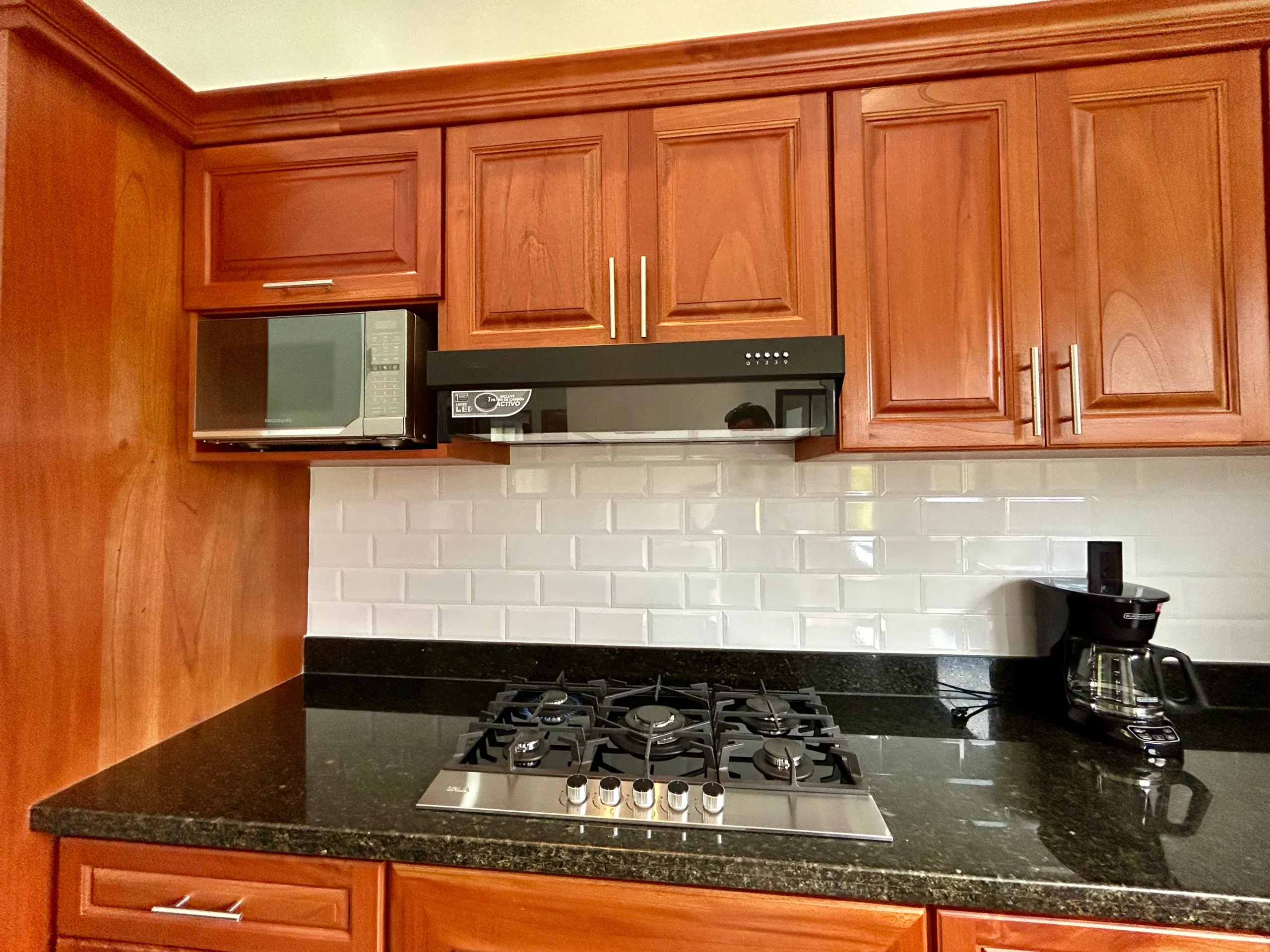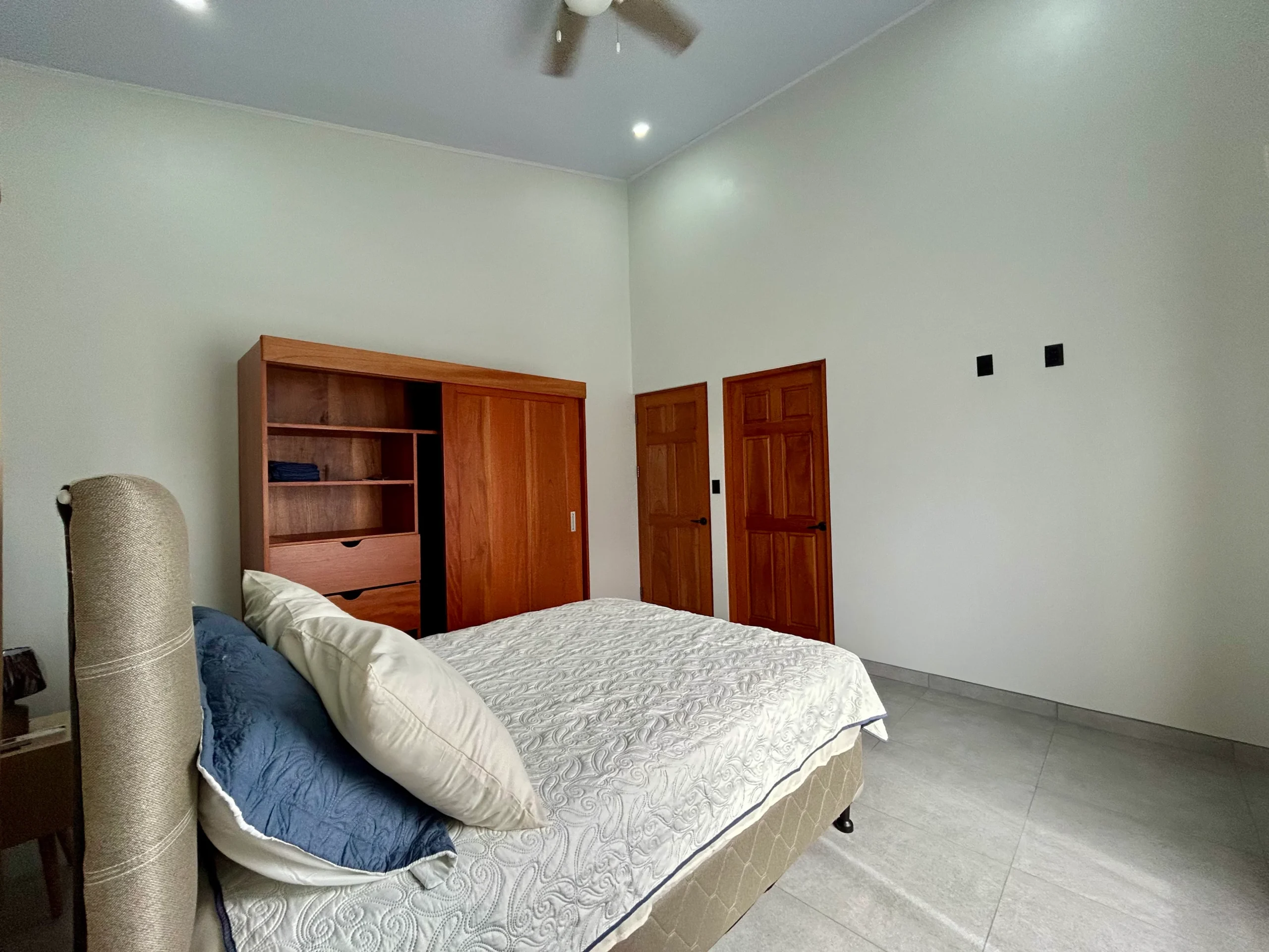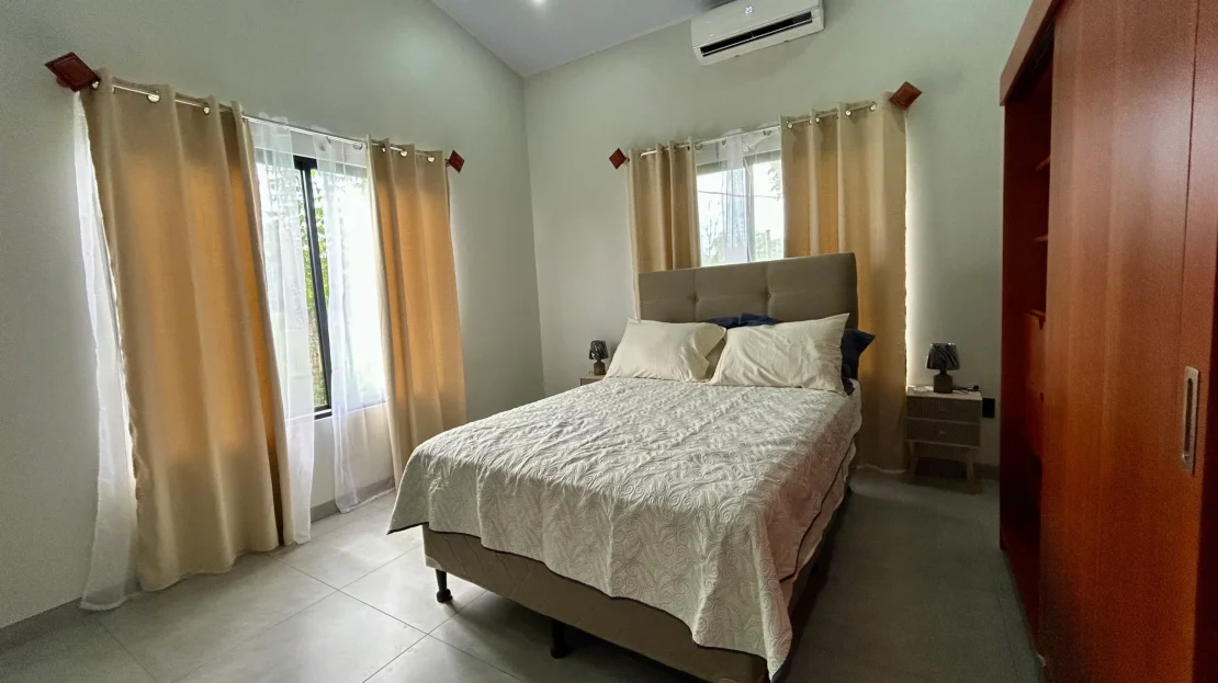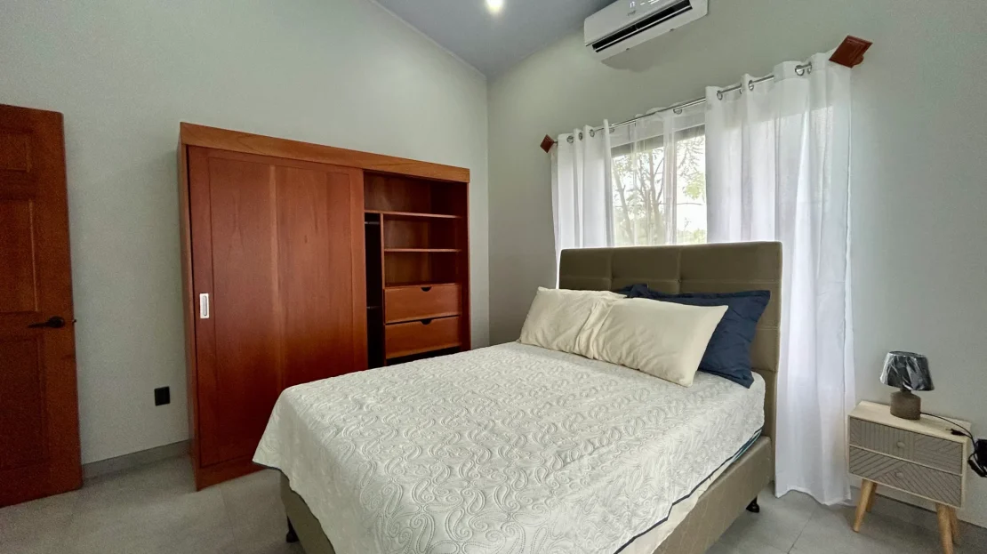 Upon arriving at the house, a welcoming parking area for up to two cars greets you. Lush green tropical gardens surround the house, and crafted wooden accents guide you to the fully furnished living room area. It’s ready for you and your family to spend quality time while preparing delicious meals in the spacious kitchen. The kitchen boasts elegant quartz countertops, cabinets, and all the necessary home appliances for perfect living. A handcrafted wooden dining table from Costa Rica divides the kitchen and living room, adding an elegant touch to your home.