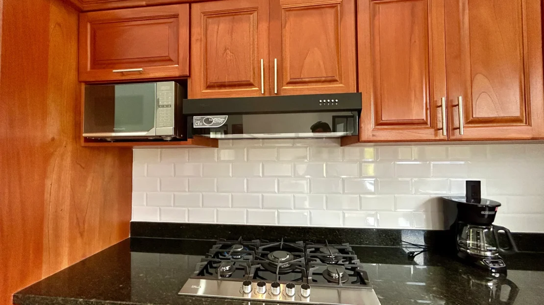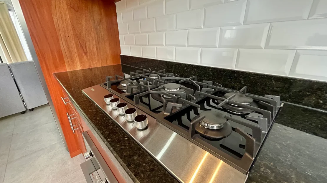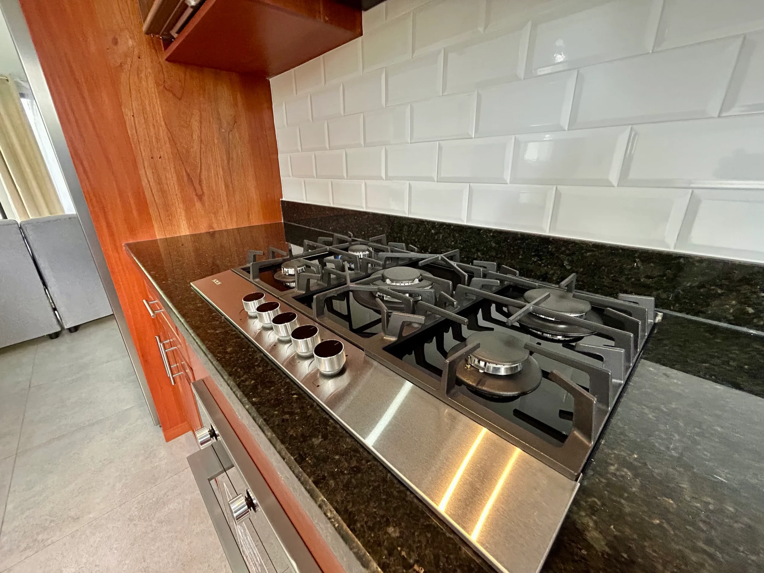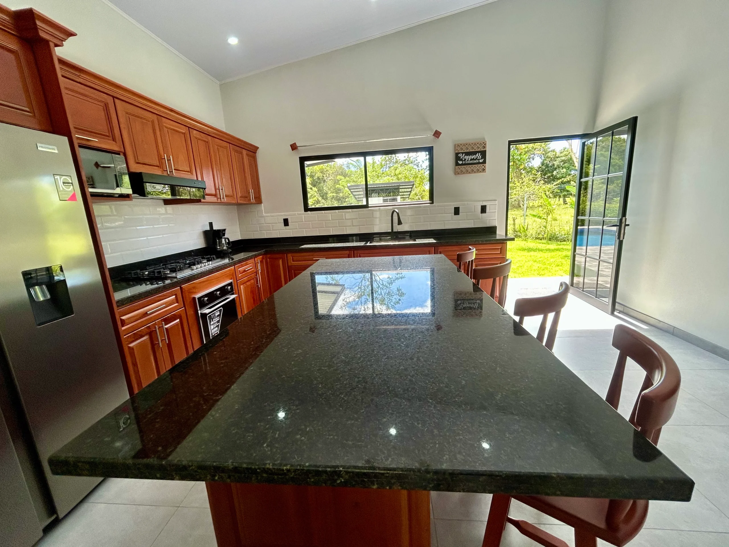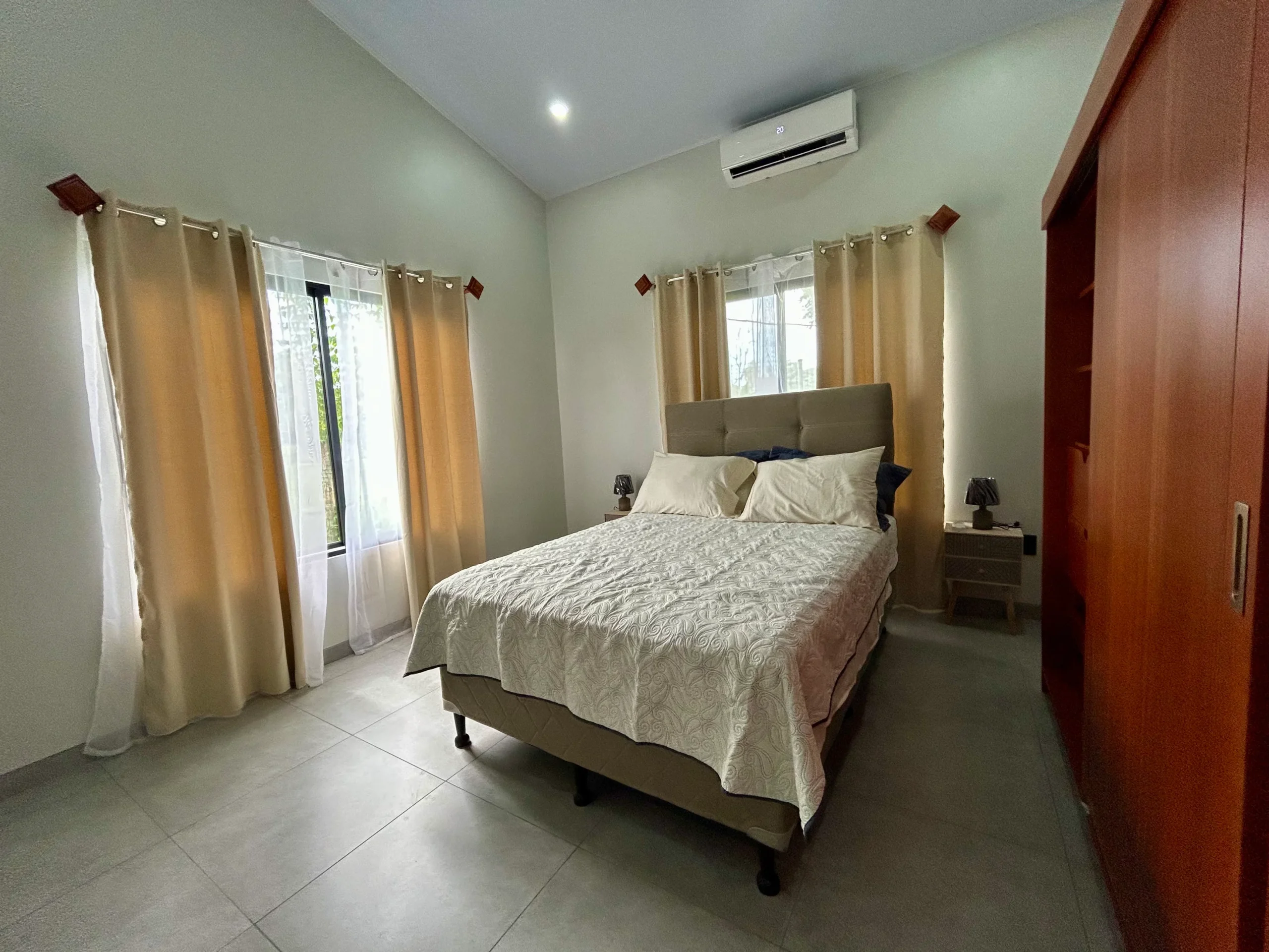 Upon arriving at the house, a welcoming parking area for up to two cars greets you. Lush green tropical gardens surround the house, and crafted wooden accents guide you to the fully furnished living room area. It’s ready for you and your family to spend quality time while preparing delicious meals in the spacious kitchen. The kitchen boasts elegant quartz countertops, cabinets, and all the necessary home appliances for perfect living. A handcrafted wooden dining table from Costa Rica divides the kitchen and living room, adding an elegant touch to your home.