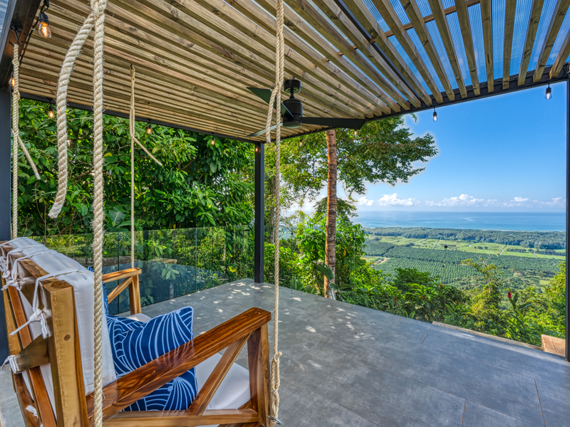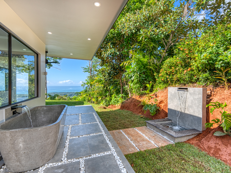 Step outside to experience luxurious outdoor living at its finest. The expansive covered front balcony overlooks the pool and ocean and is equipped with ceiling fans, ambient lighting, and custom teak furniture designed for both style and durability. Meandering stone paths lead to two peaceful outdoor lounge areas: one beneath a pergola with a swinging chair—perfect for morning yoga or meditation, and the other in the front courtyard, an ideal spot for enjoying your morning coffee as the sun rises over the hills.
