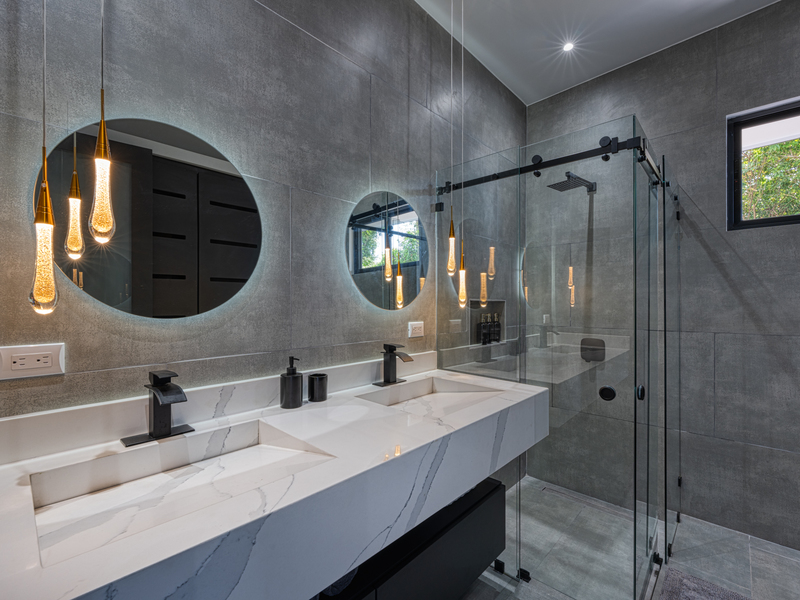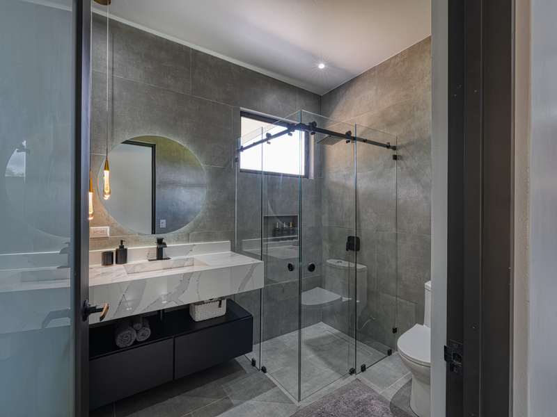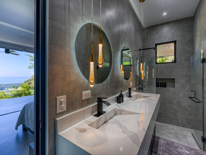 The spacious living room centers around a dramatic feature wall with a hidden door leading to the primary suite—a private sanctuary of comfort and design. Two of the three bedrooms feature ensuite bathrooms, each with dual vanities, integrated quartz sinks, floor-to-ceiling tiled walls, and striking black fixtures. Every bedroom is positioned to enjoy sweeping ocean views, while the third bedroom provides direct access to a serene outdoor bathtub, complete with custom water features. A third full bathroom, finished to the same impeccable standard, serves both guests and the common areas.