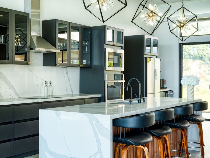 As you step inside, you’re greeted by a meticulously designed living space where elegance meets functionality. The chef-inspired kitchen is a true showpiece, featuring sleek quartz countertops with a striking waterfall island, top-of-the-line appliances—including a built-in under-counter ice maker—and a dedicated beverage and coffee bar. Pendant lighting, elegant accent walls, chic bar stools, and a luxurious leather sectional complete the look, making the space both inviting and stylish.