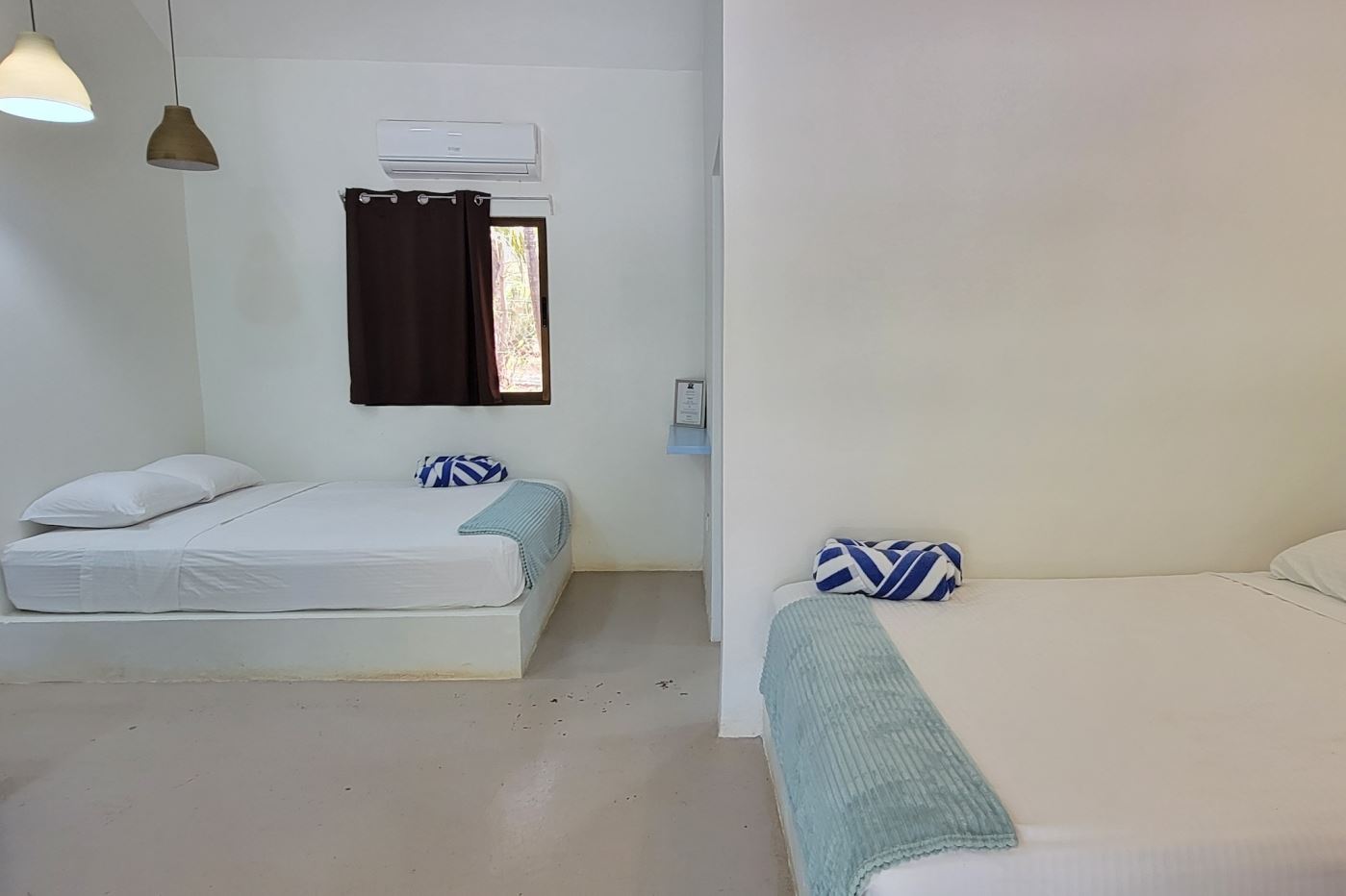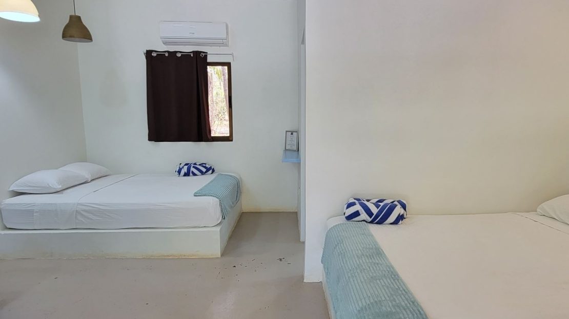 Suites 1 to 5 (35m² each) feature two queen beds, a private terrace, a kitchenette, and individual air conditioning, accommodating up to 4 adults. Suite 6 (40m²) offers more spacious interiors with large built-in wardrobes, while Suite 7 (50m²) stands out with enhanced comfort, including a King bed, a full-size refrigerator, and a large terrace. Additional spaces include a laundry room (13.5m²), a garage (24m²), and a pool equipment room (4m²).
