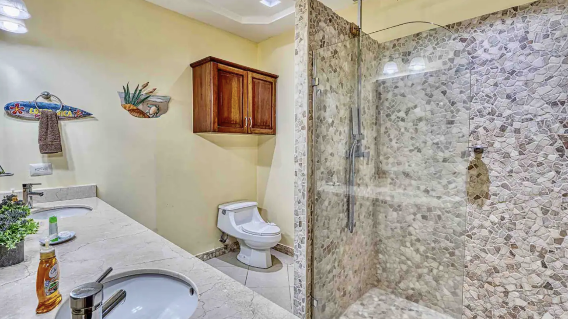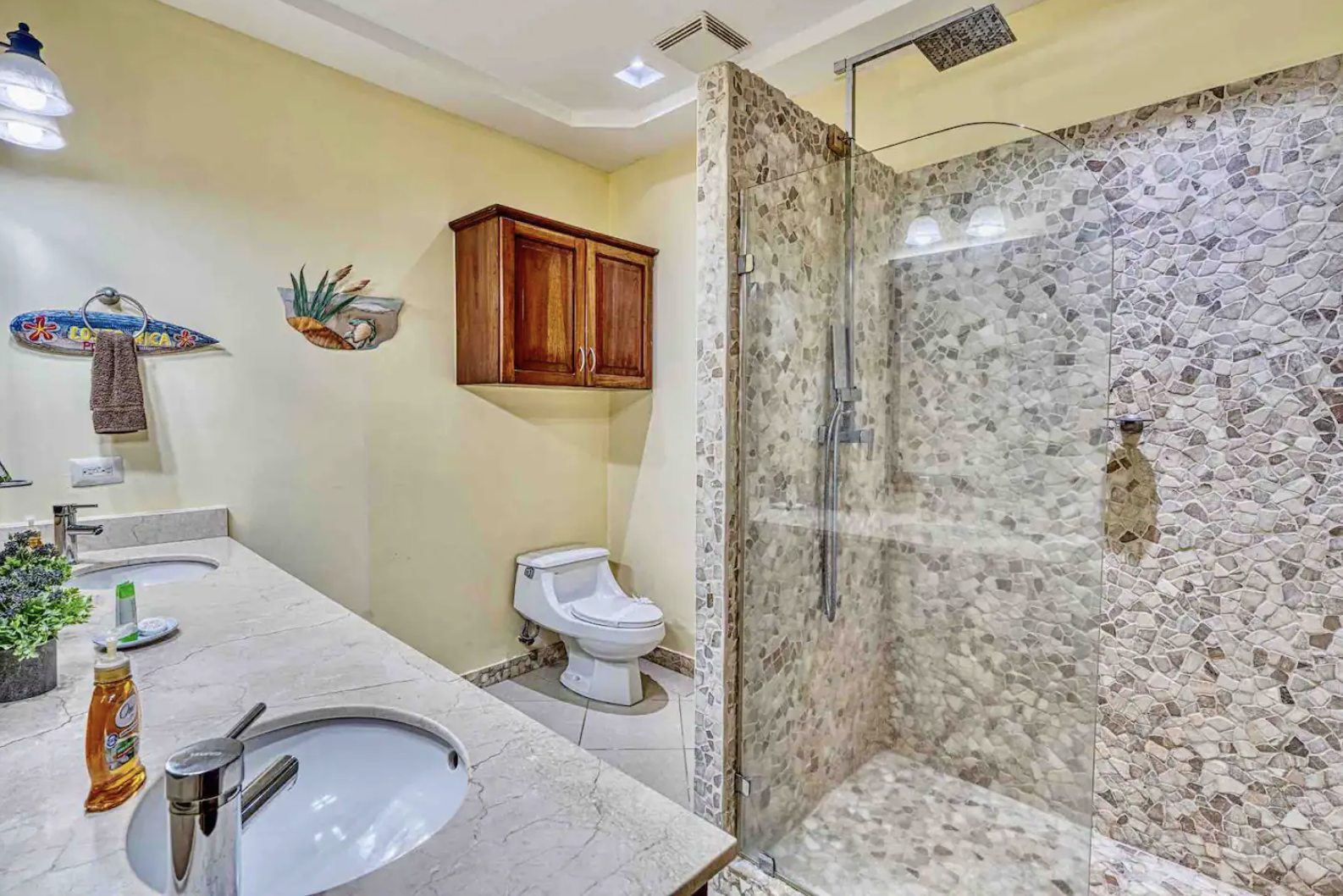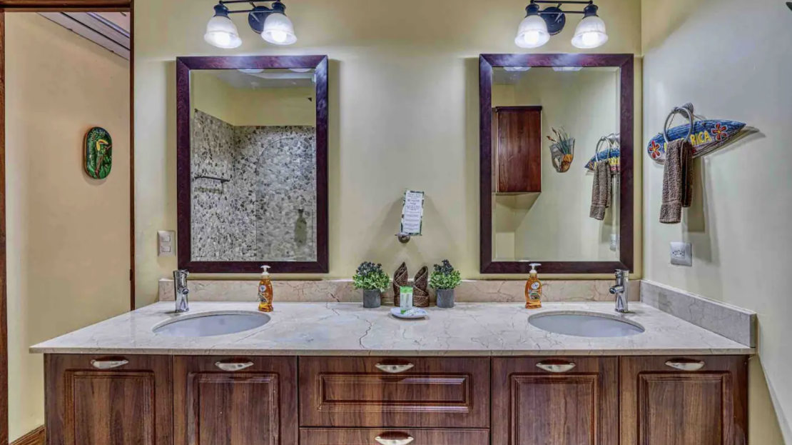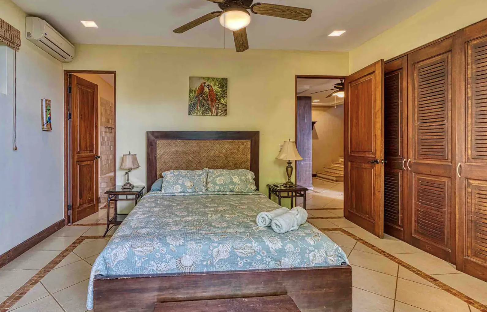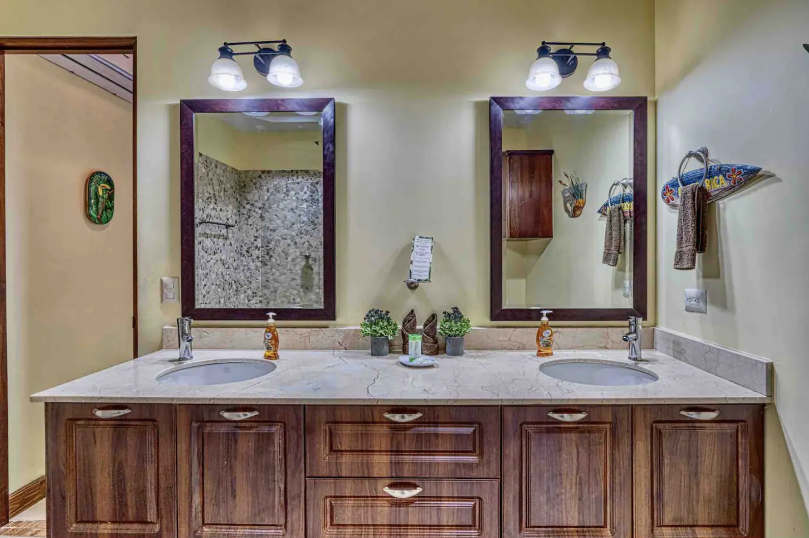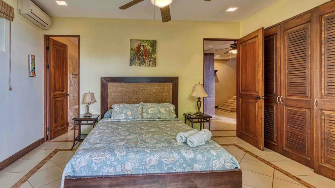 – **Two Bedrooms with en suite bathrooms:** The villa features two well-appointed equally sized bedrooms, with abundant closet space and each with its own private bathroom including spacious double sinks. Wake up to the sounds of nature and enjoy the gentle ocean breeze as you start your day in paradise. Although some mornings the howler monkeys may be a startling wake up call. A laundry room with washer and dryer is located on the bedroom level along with a owner’s closet and linen closet in the common area at the bottom of the stairs.