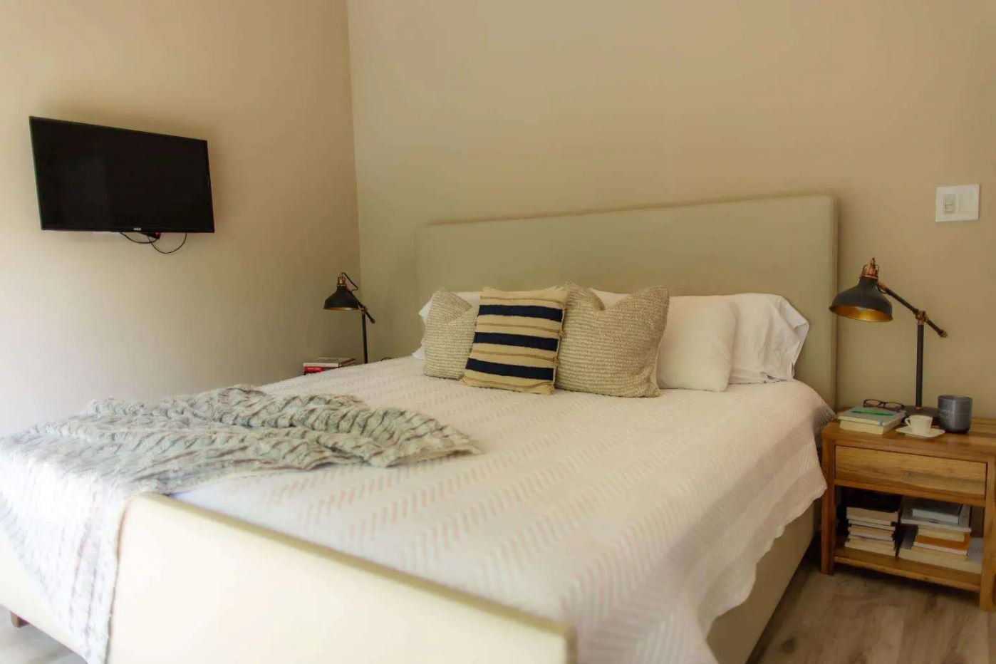 Bright, neutral interiors with natural materials, including wood and leather, for a warm and inviting feel.