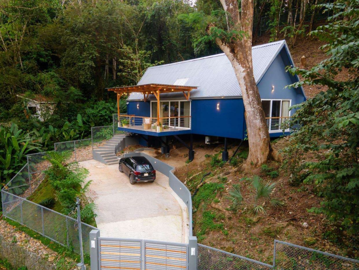Perched above the street, Casa Beratna stands out with its cool blue walls, wooden accents, and thoughtful architecture designed to keep the home naturally cool, even in warm tropical weather.