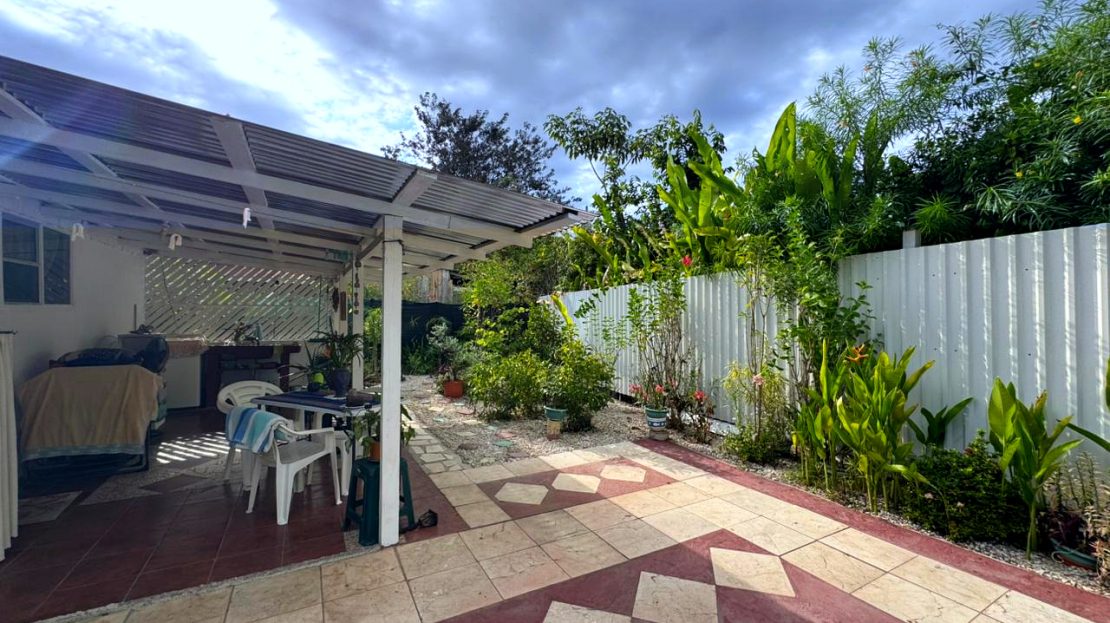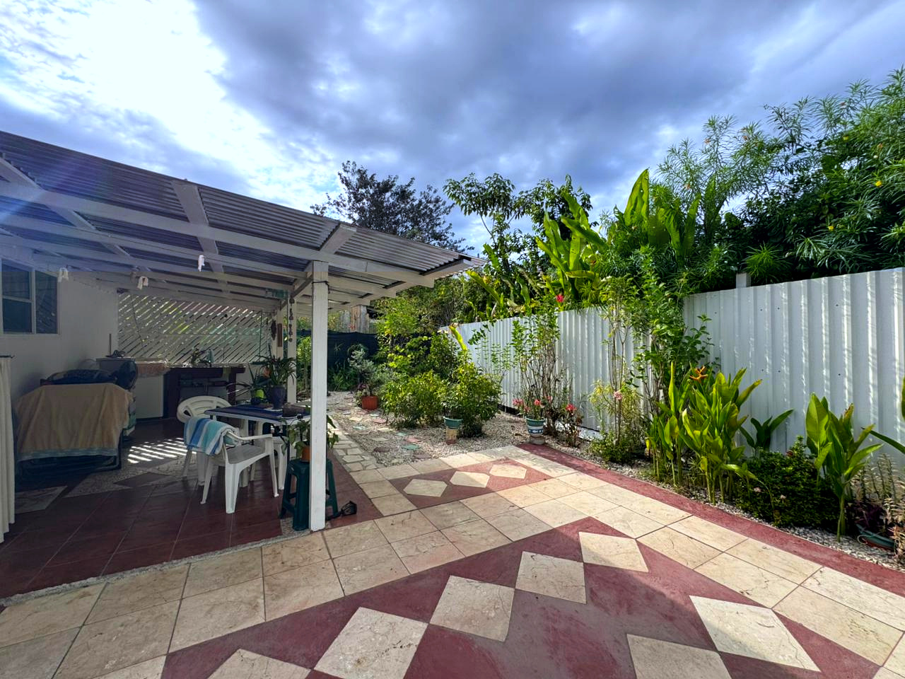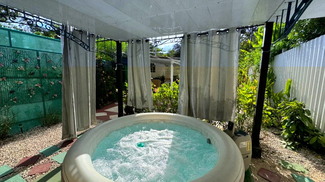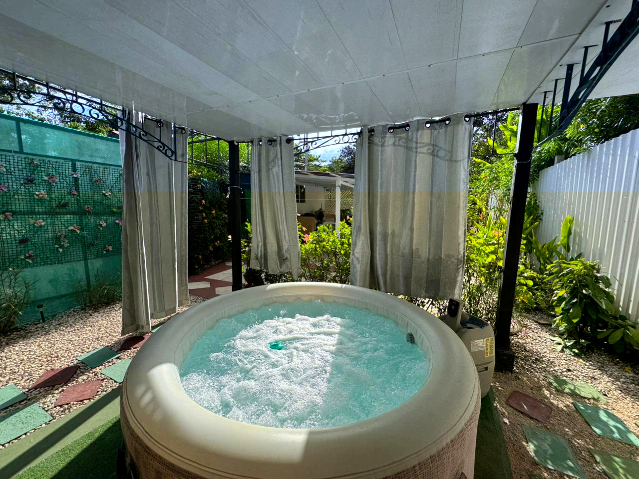 Outdoor features include a private patio, garage, and jacuzzi, perfect for enjoying the tropical lifestyle. The property is surrounded by ornamental plants and fruit trees, offering privacy and tranquility in a green, natural setting.