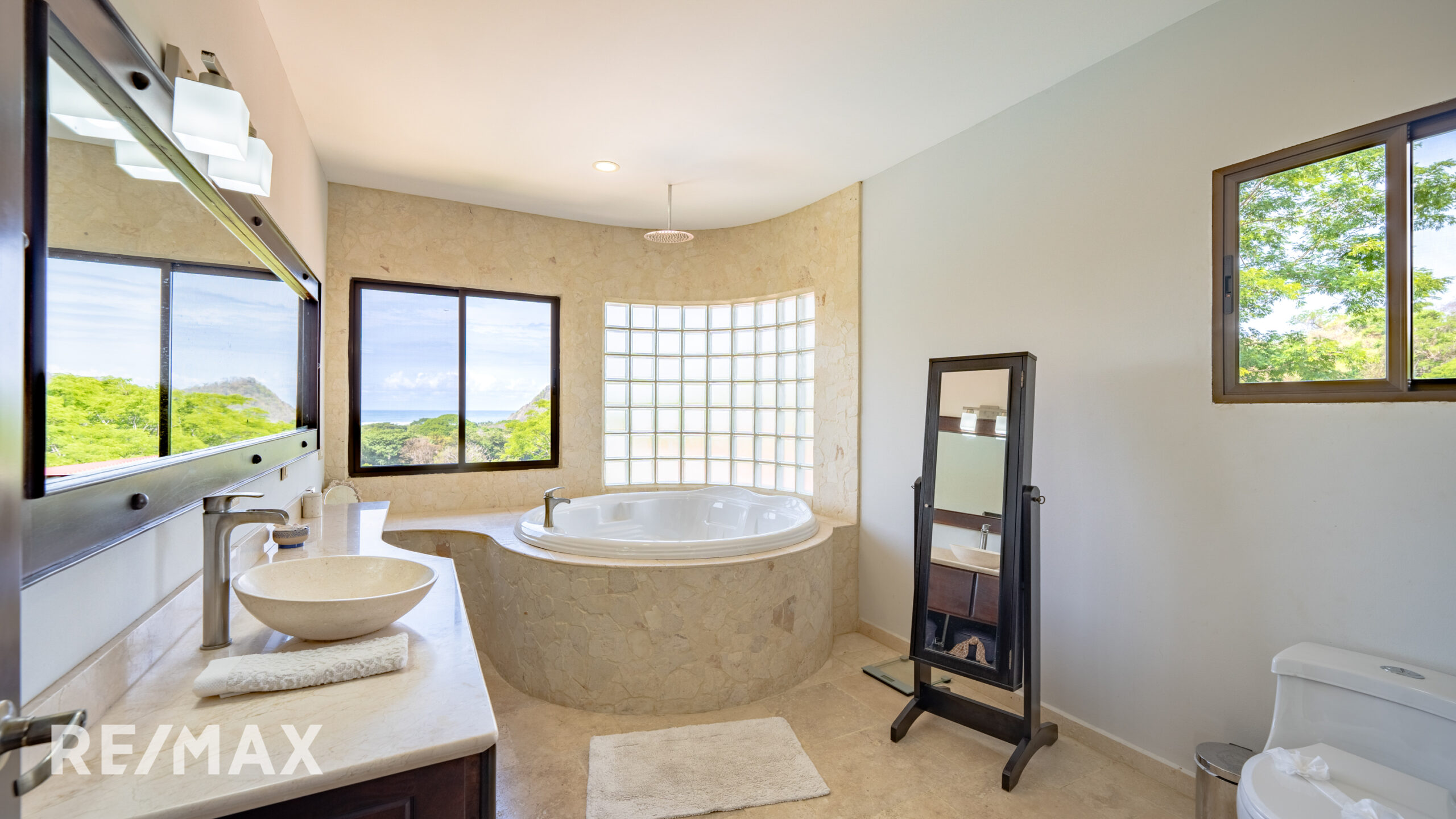 The main house is spread over two levels, each featuring a master bedroom with ensuite bathroom. The upstairs master suite includes a rare and luxurious feature: his & hers bathrooms, enhancing comfort and privacy. Large bay windows bring in ample natural light and frame breathtaking mountain and ocean views.