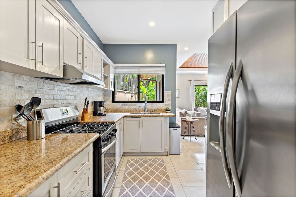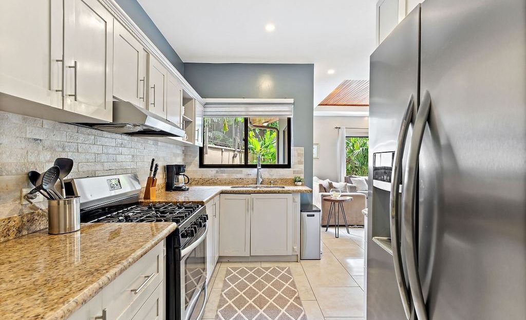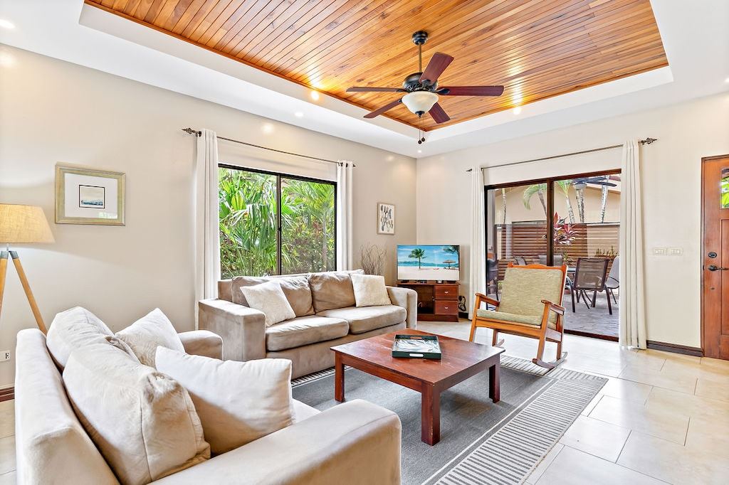 The open living space invites you to relax with a large, comfortable sofa and loveseat, a dining area perfect for family meals, and a fully equipped kitchen complete with a large refrigerator and gas stove. The home also includes air conditioning, cable TV, and Wi-Fi to keep everyone connected and comfortable. Step outside to your own private patio or take a dip in the shared pool, located in a peaceful garden area shared by only four homes in the complex. It’s a serene, safe, and private setting that’s perfect for quality family time.