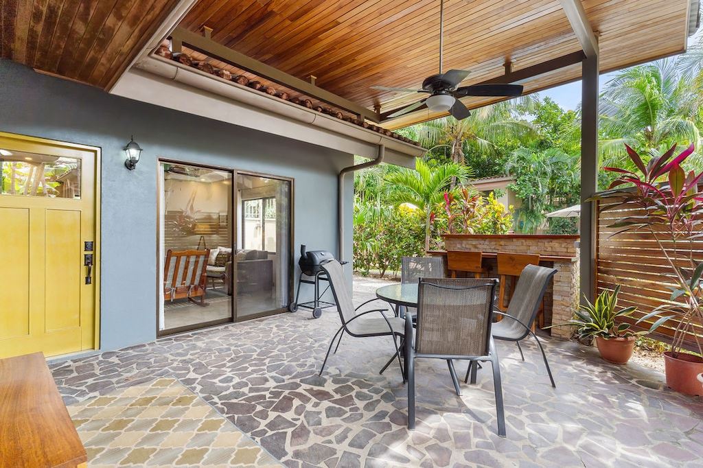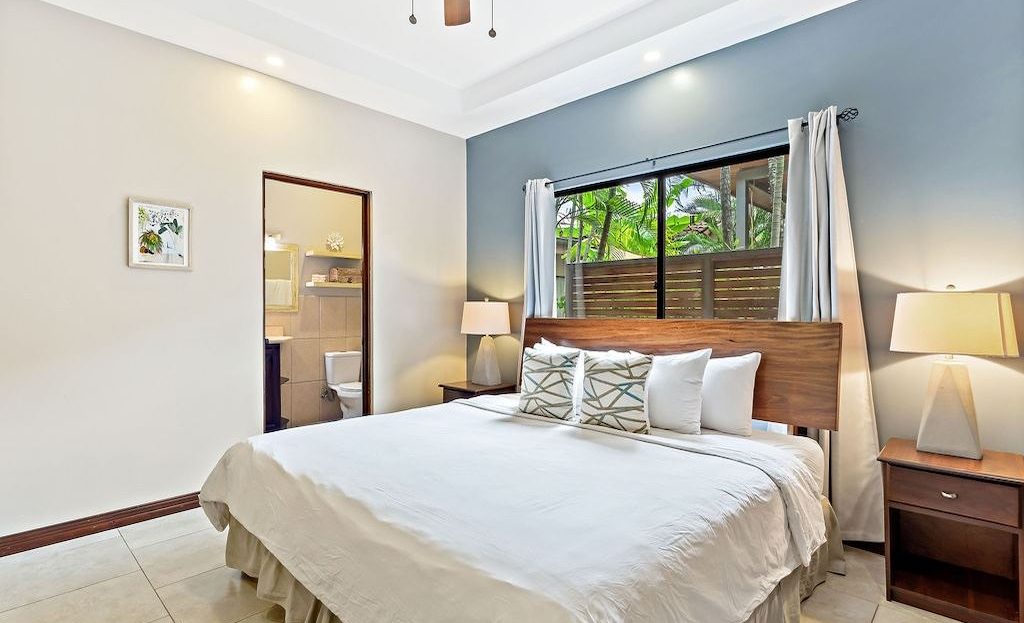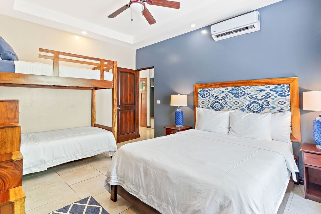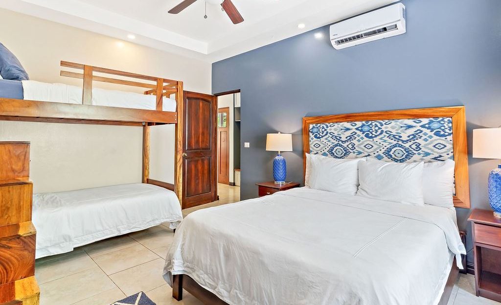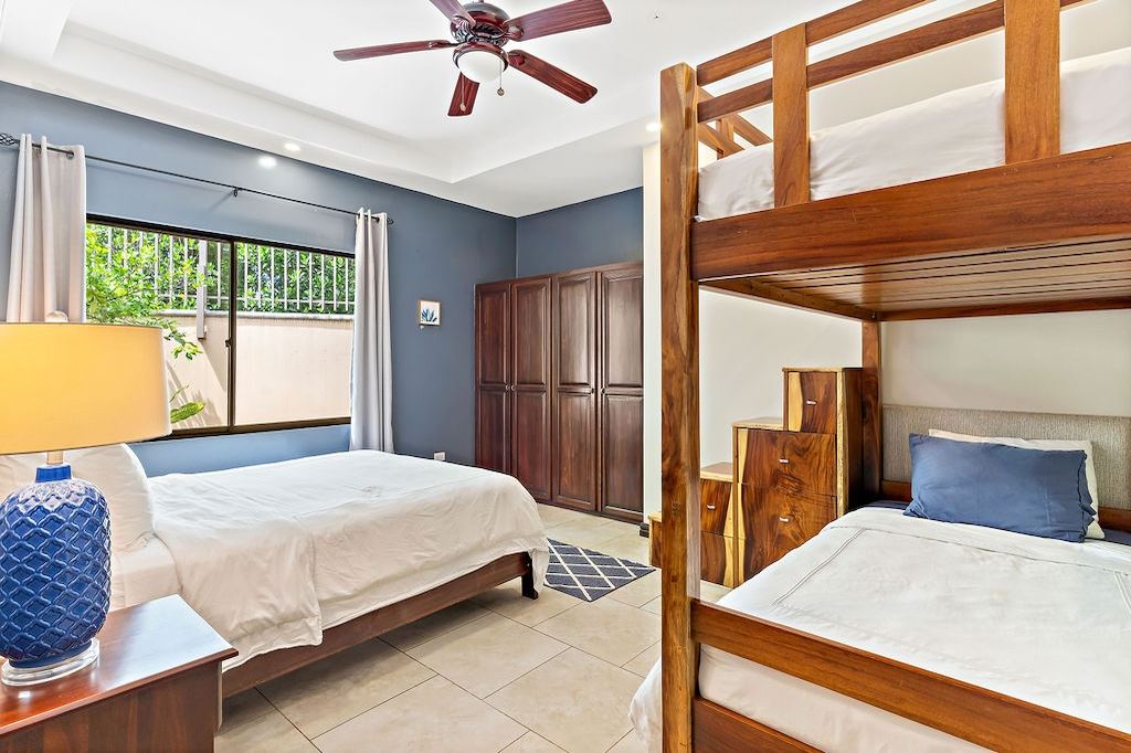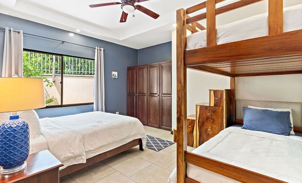 Oasis in the Heart of Tamarindo – Casa Ela #4 — your perfect home away from home for a relaxing and memorable getaway in the vibrant town of Tamarindo. This spacious and beautifully furnished 2-bedroom, 2-bathroom home comfortably sleeps up to six guests, making it ideal for families. The primary bedroom features a king bed, the second has a queen and large wooden bunk bed with storage for additional guests. With plenty of closet space, everyone can settle in and feel right at home.